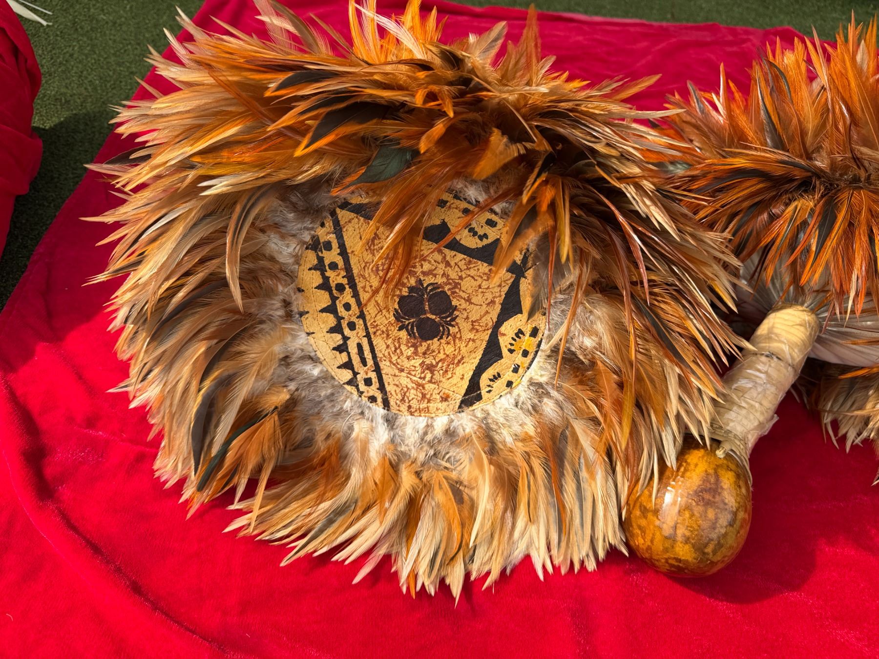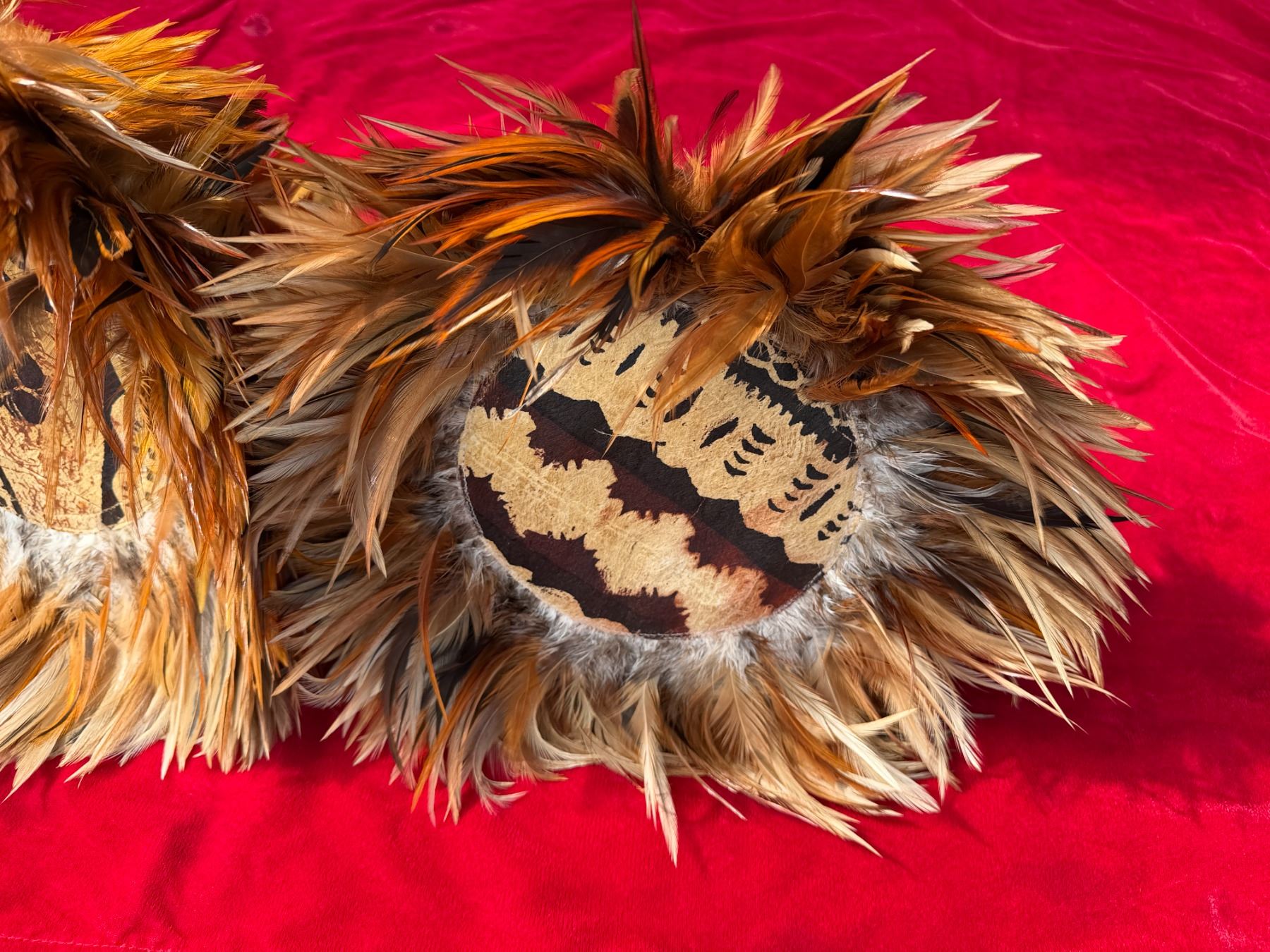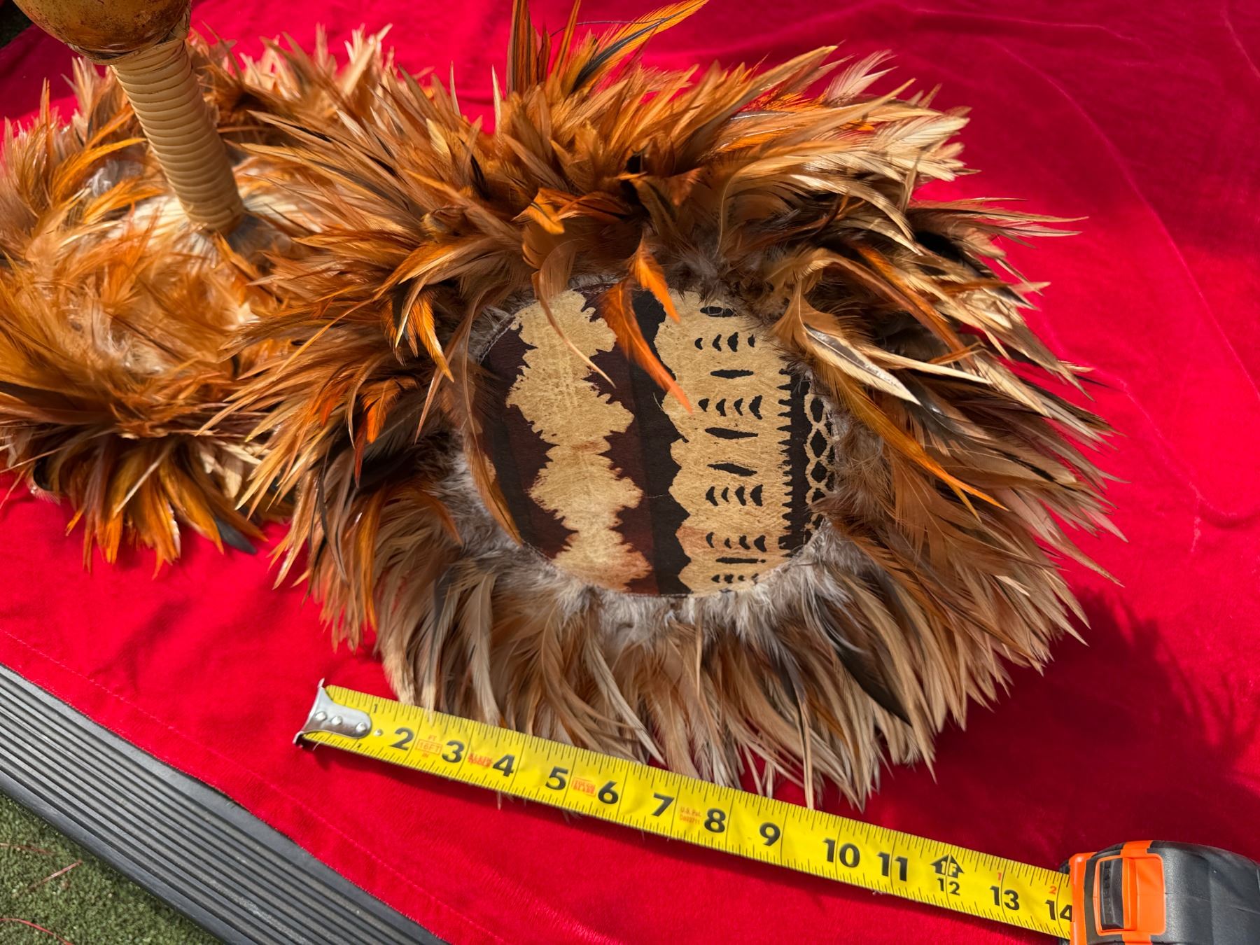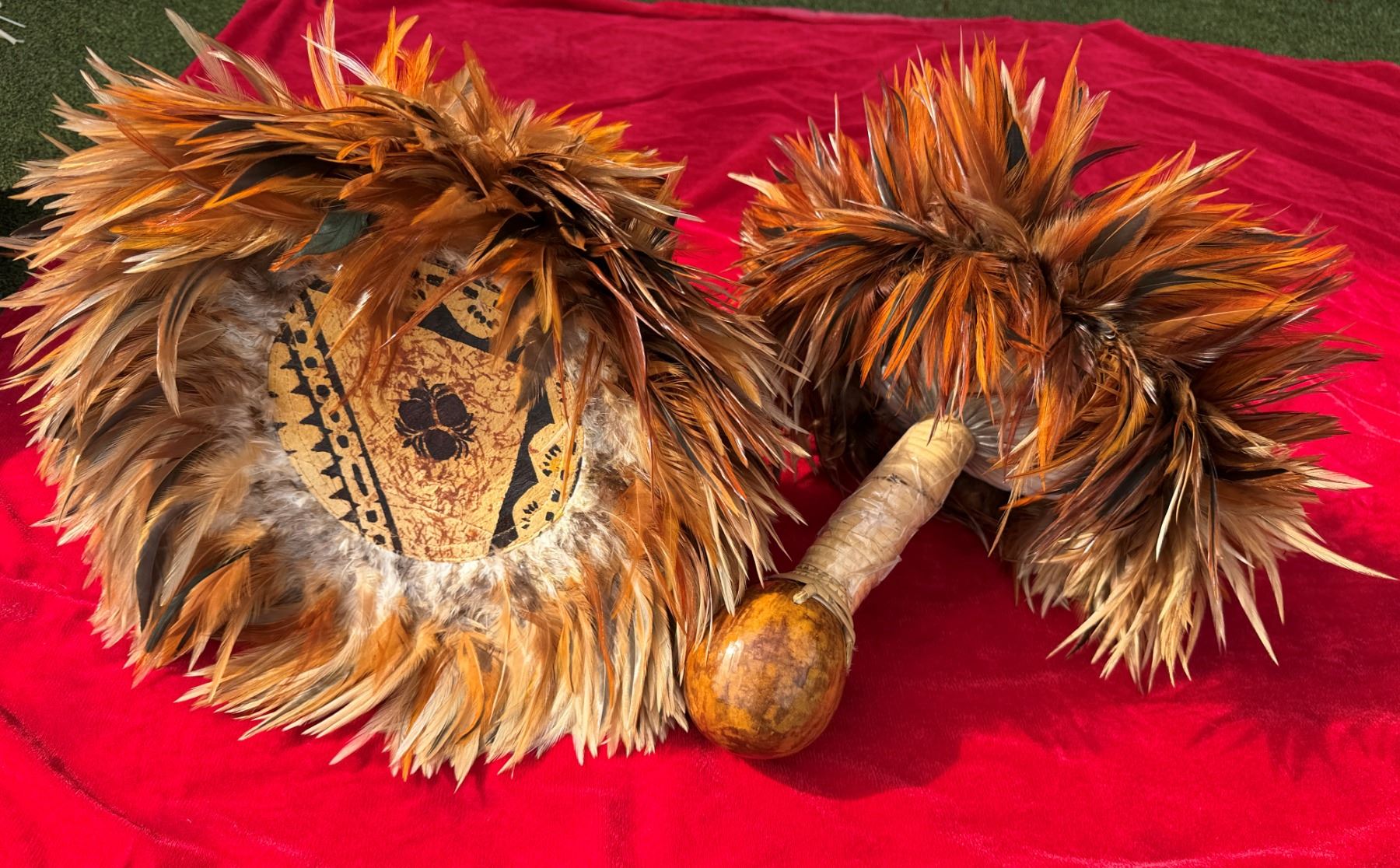 Qty 2 Uli Uli Feathered Gourd Hula Implements w/ Woven Tops