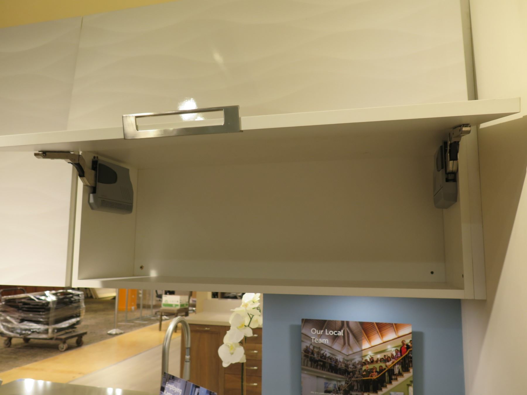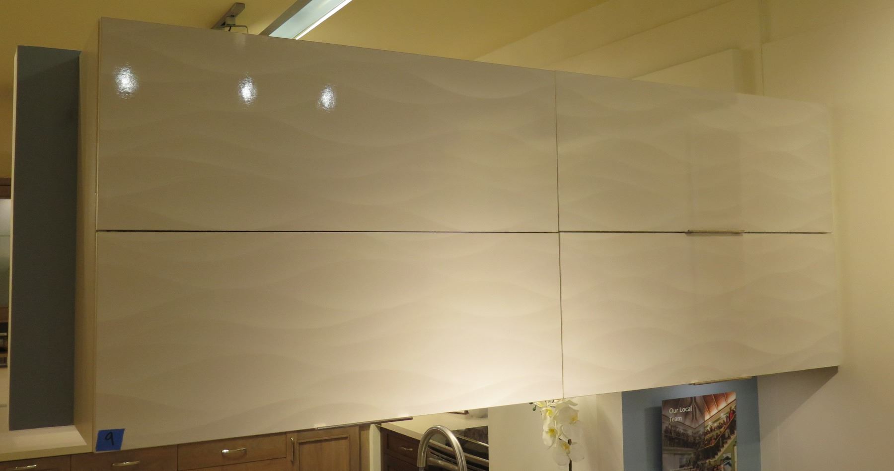 Qty 2 Upper Cabinets, Textured White Gloss Wave Pattern, Ultra Matte Creme. These are two pieces. Each is 39" across x 30" x 14" depth. The two combined measures approx. 80" across.