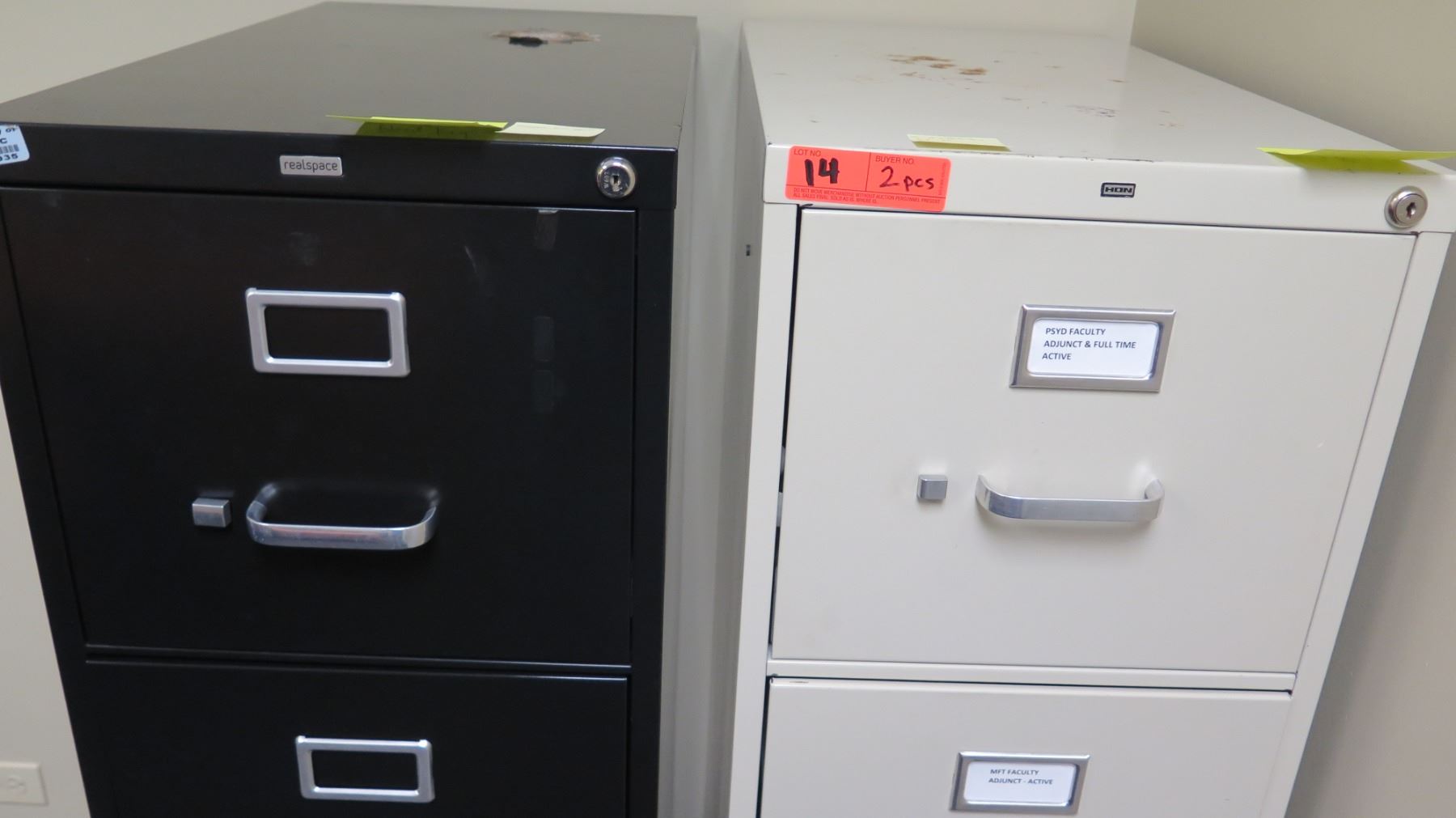 Qty 2 Vertical File Cabinets (HON, Realspace) 15"W x 26.5"D x 52"H. Buyer will be responsible for disassembling and removing all purchased items in this auction. Buyer must bring own tools, carts, etc. Loadout Thursday, May 9 to Saturday May 11. Detailed directions to building’s loading zone and designated load-out areas will be provided.