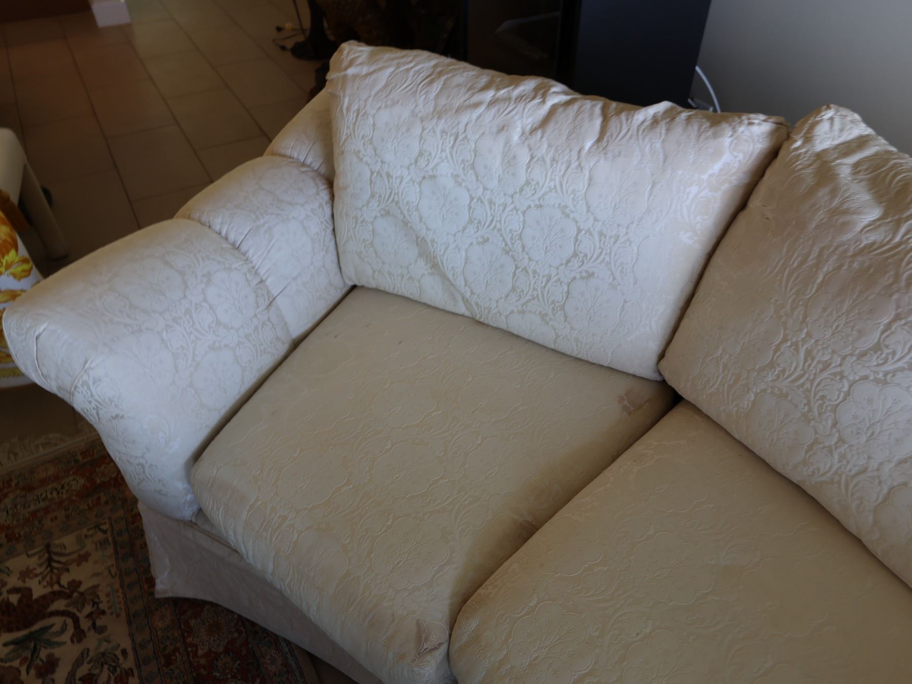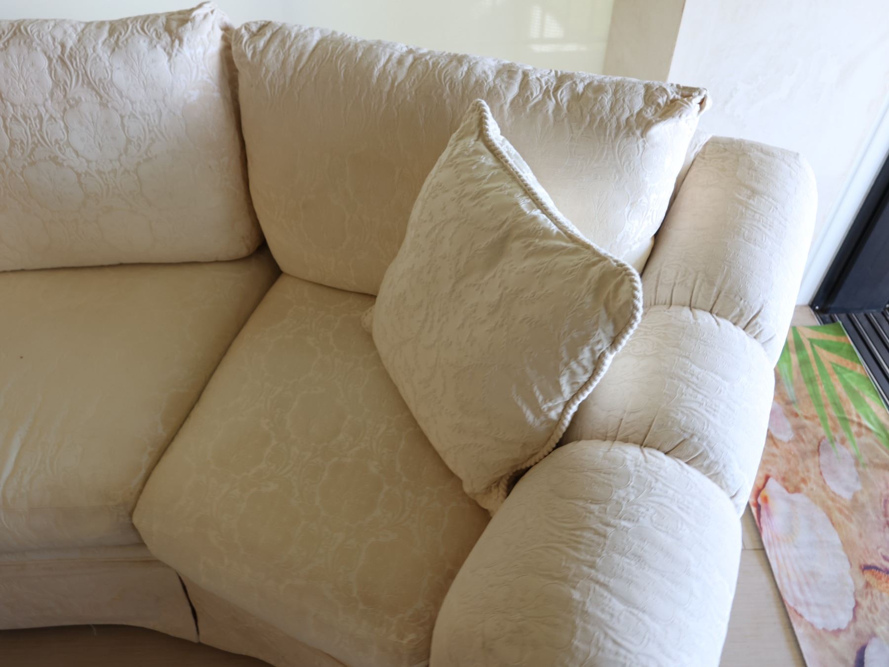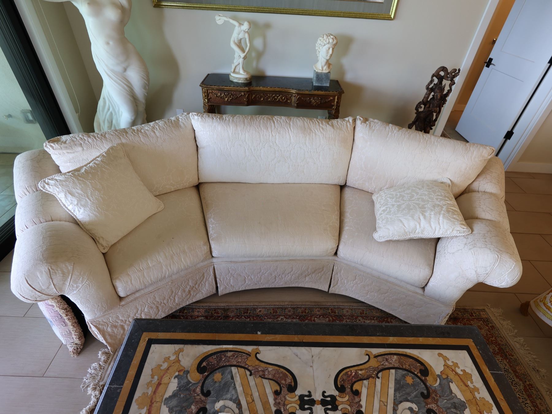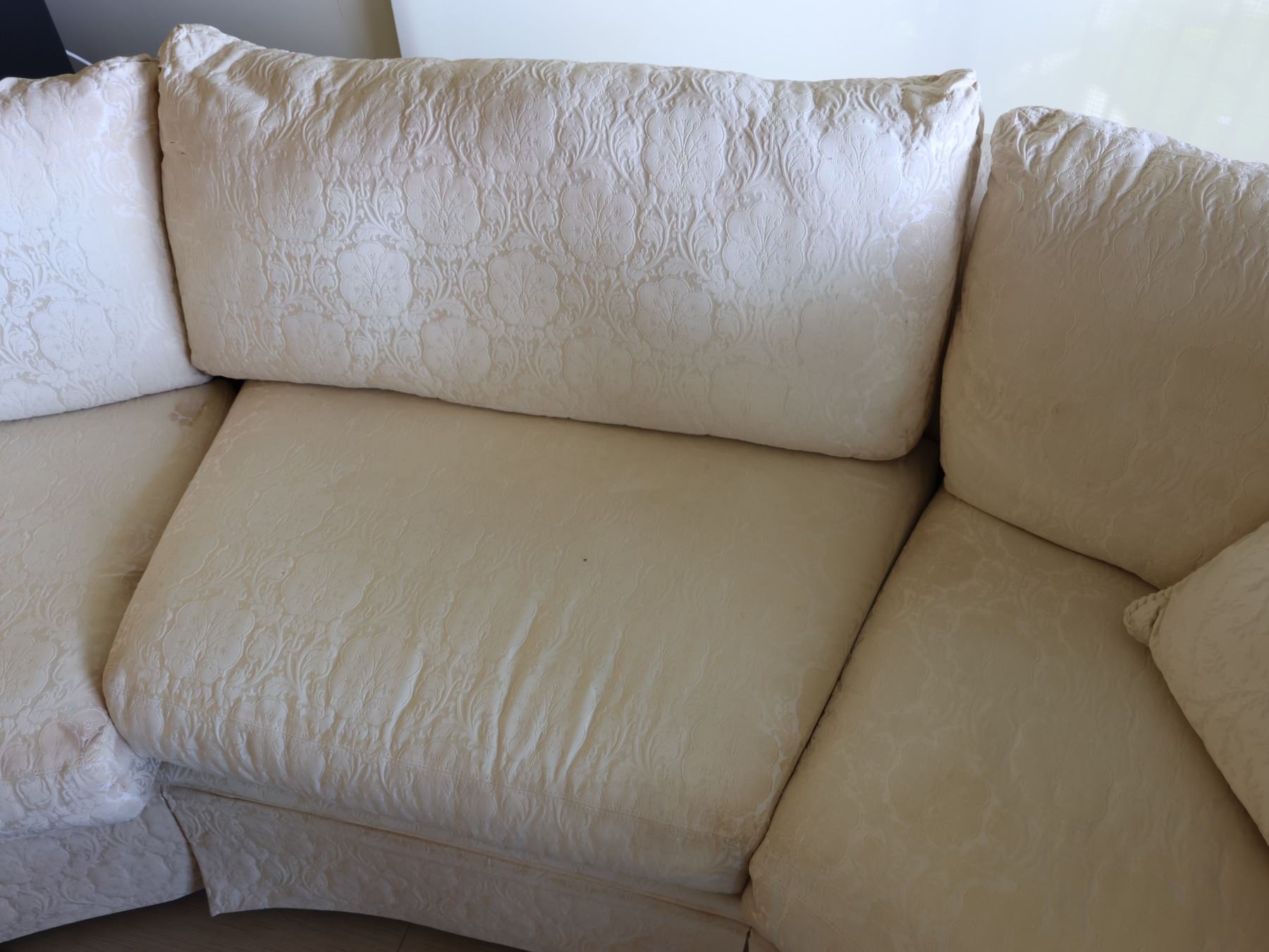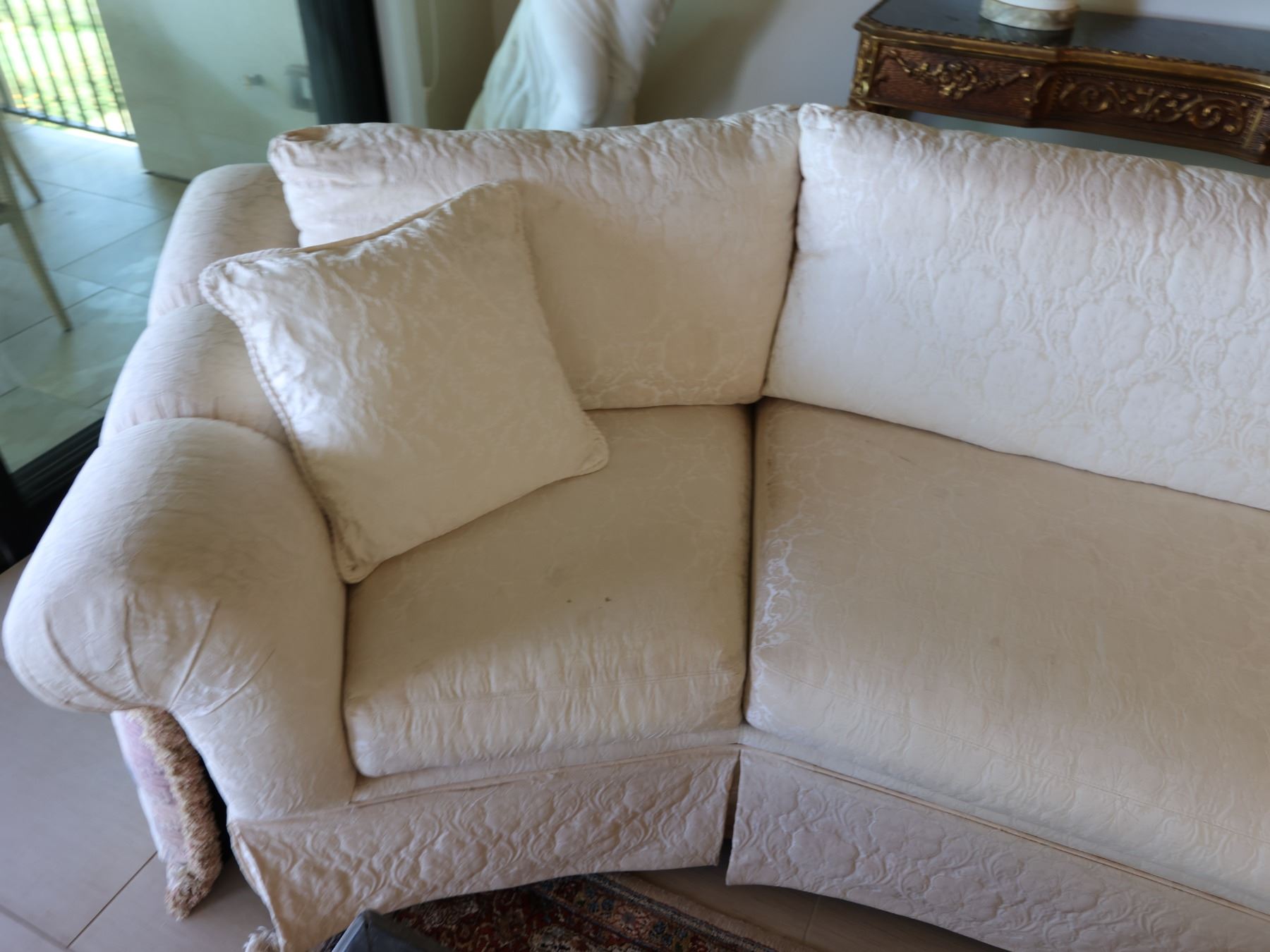 These have major sun damage and general wear and tear. Qty 2 White Curved 3-Seat Upholstered Sofa Sections w/ Back & Throw Cushions 105"L x 21" x 32"H.