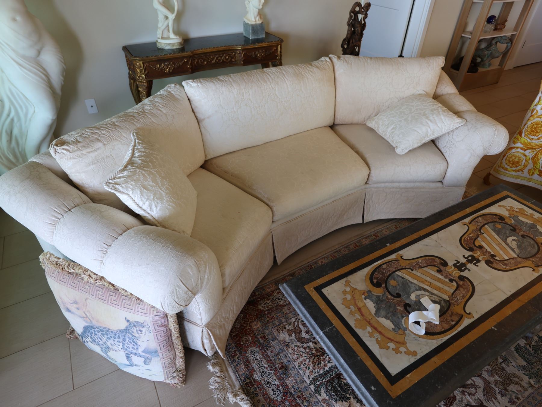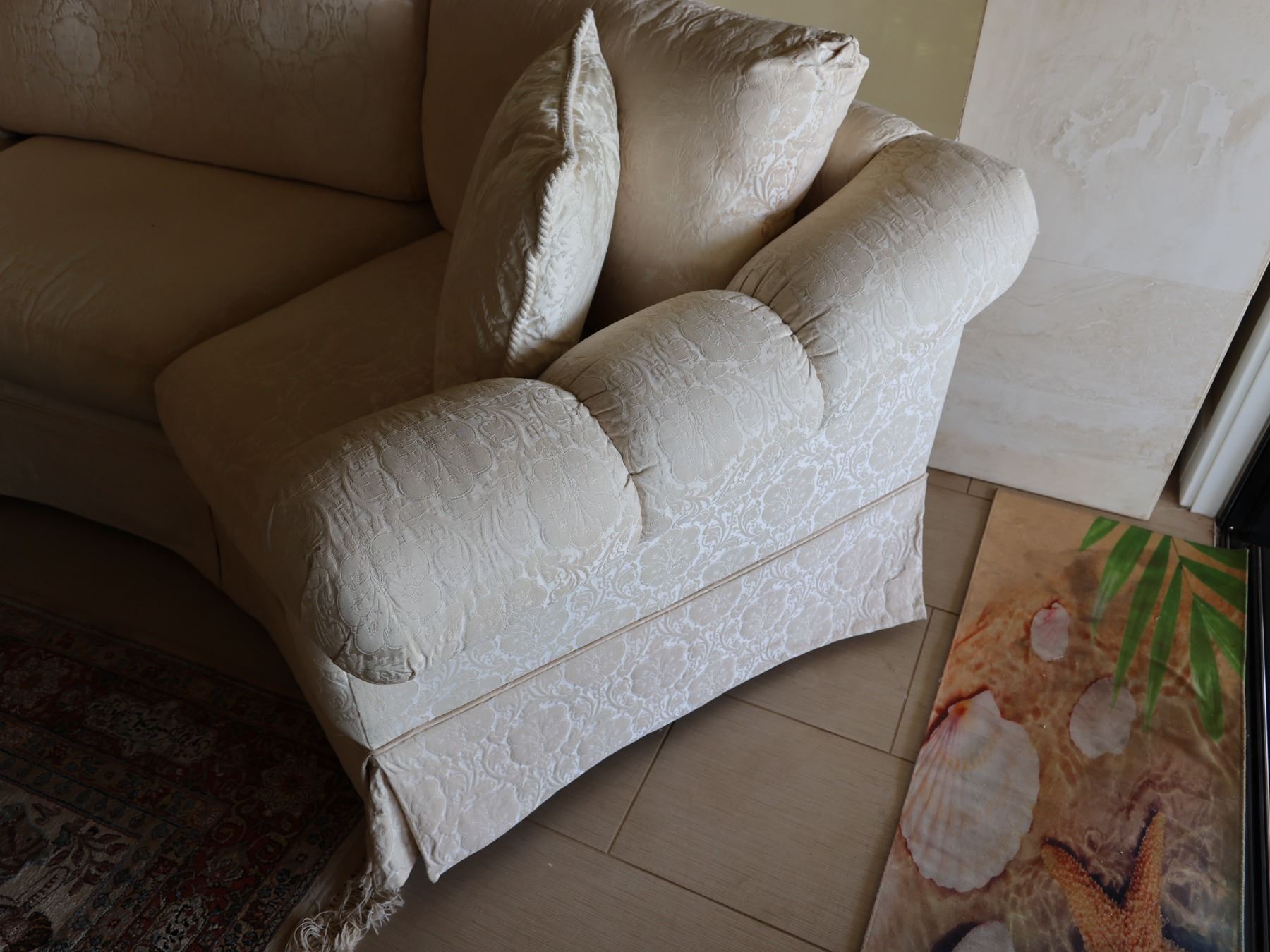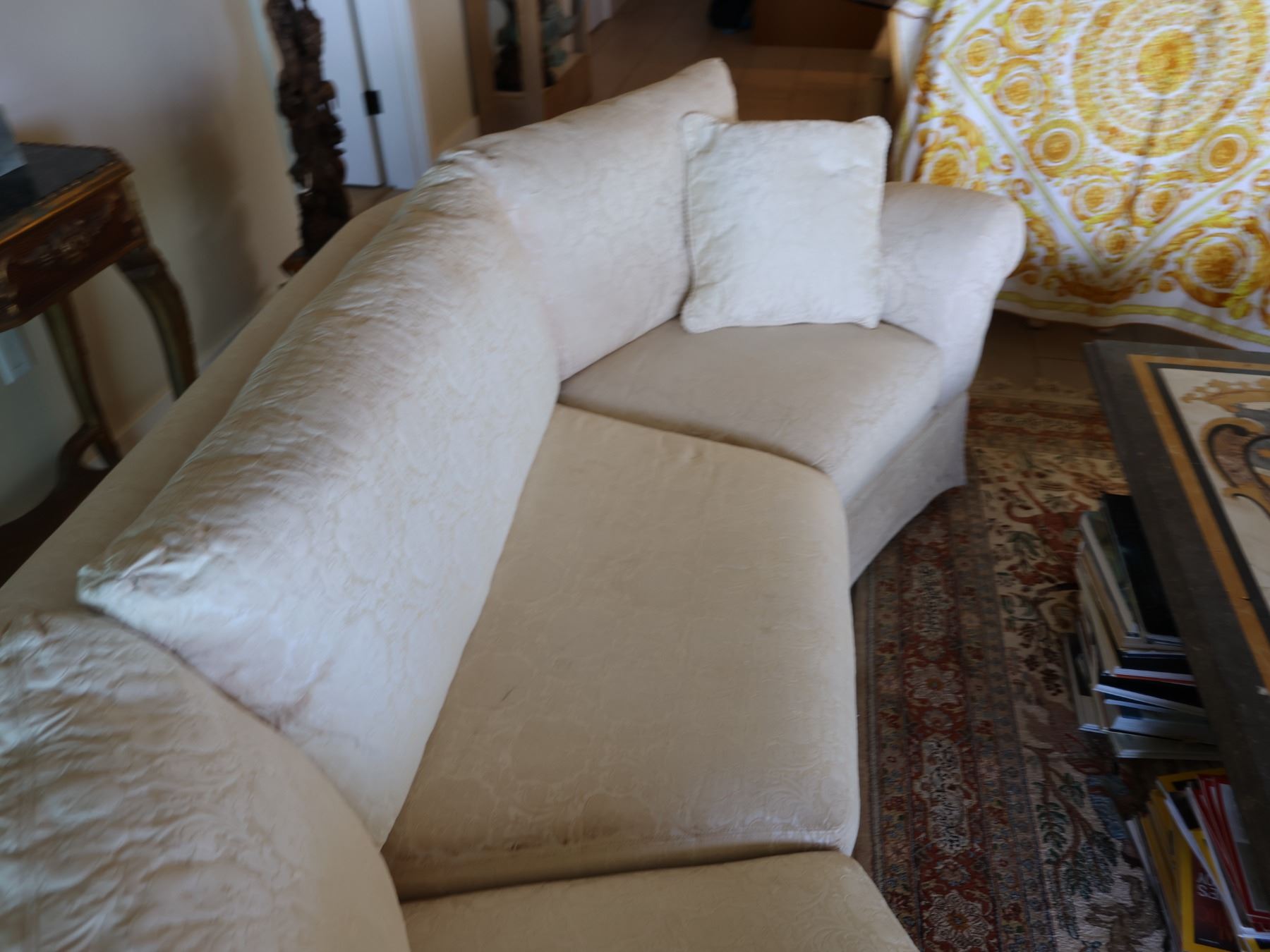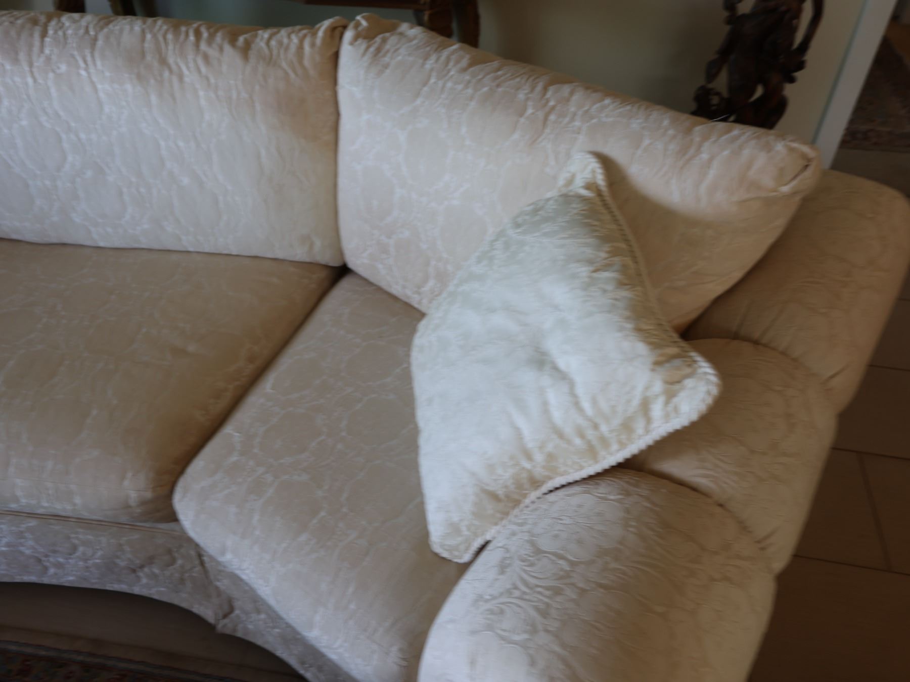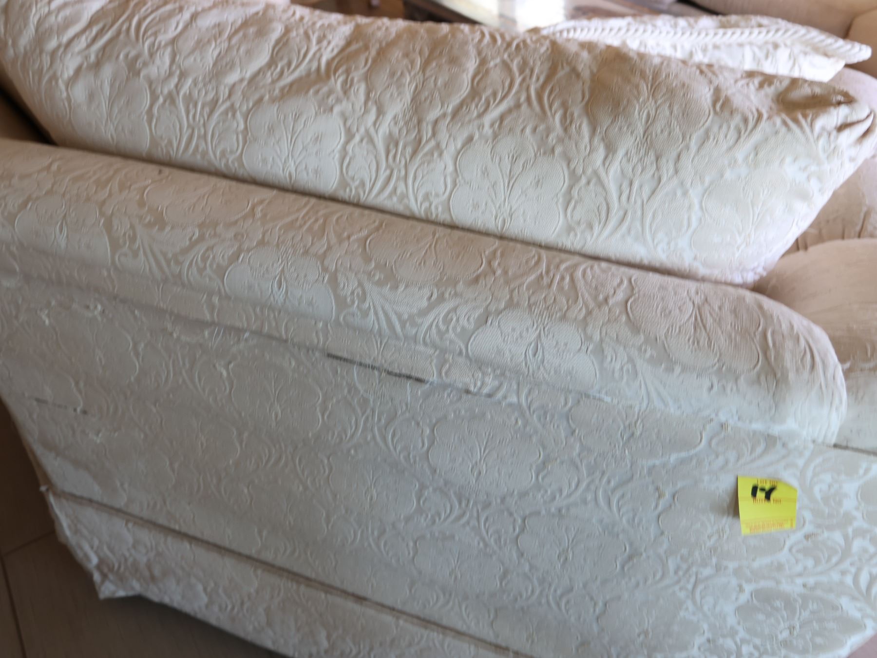These have major sun damage and general wear and tear. Qty 2 White Curved 3-Seat Upholstered Sofa Sections w/ Back & Throw Cushions 105"L x 21" x 32"H.