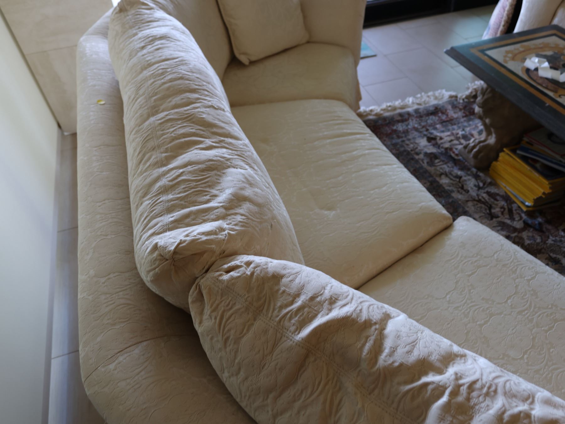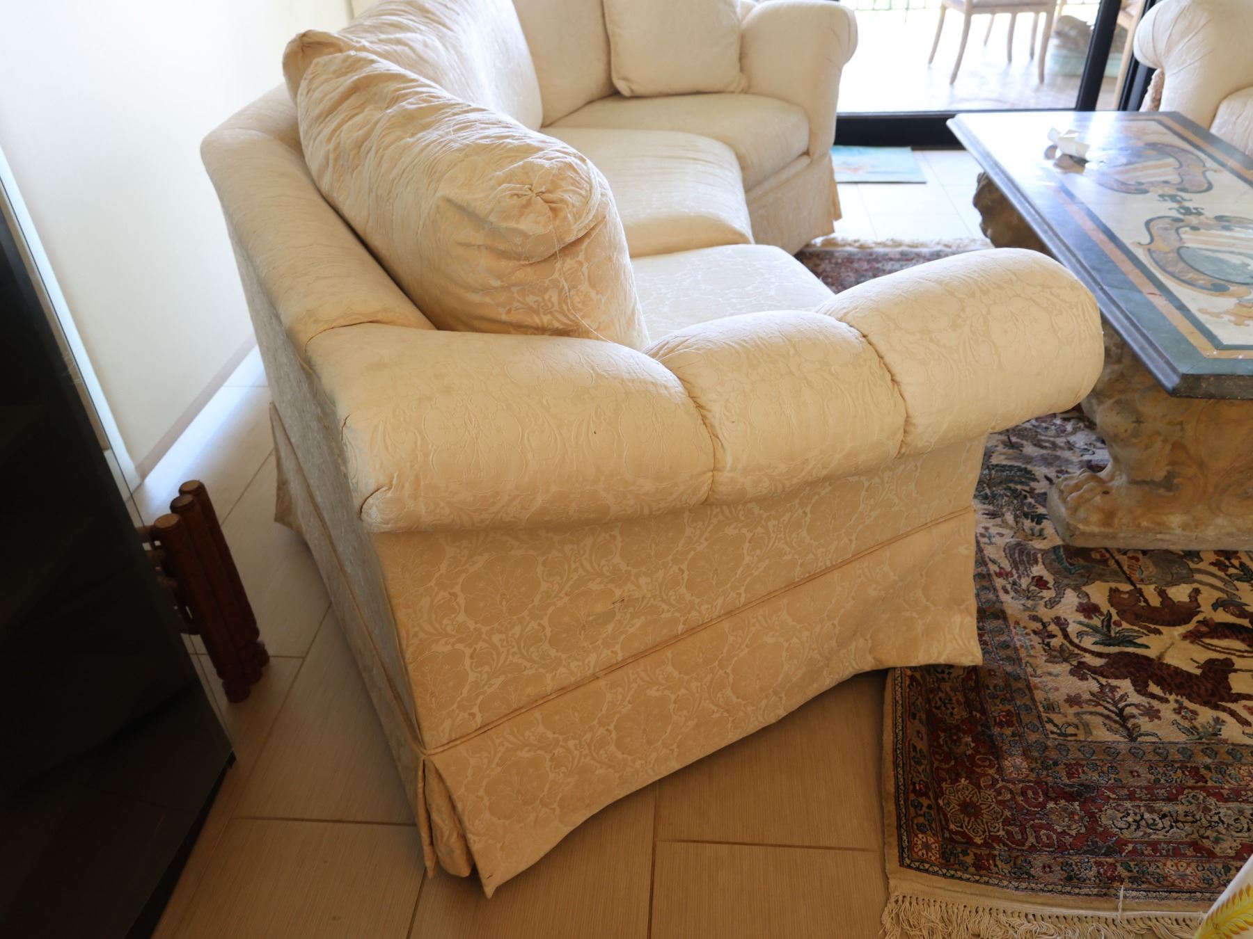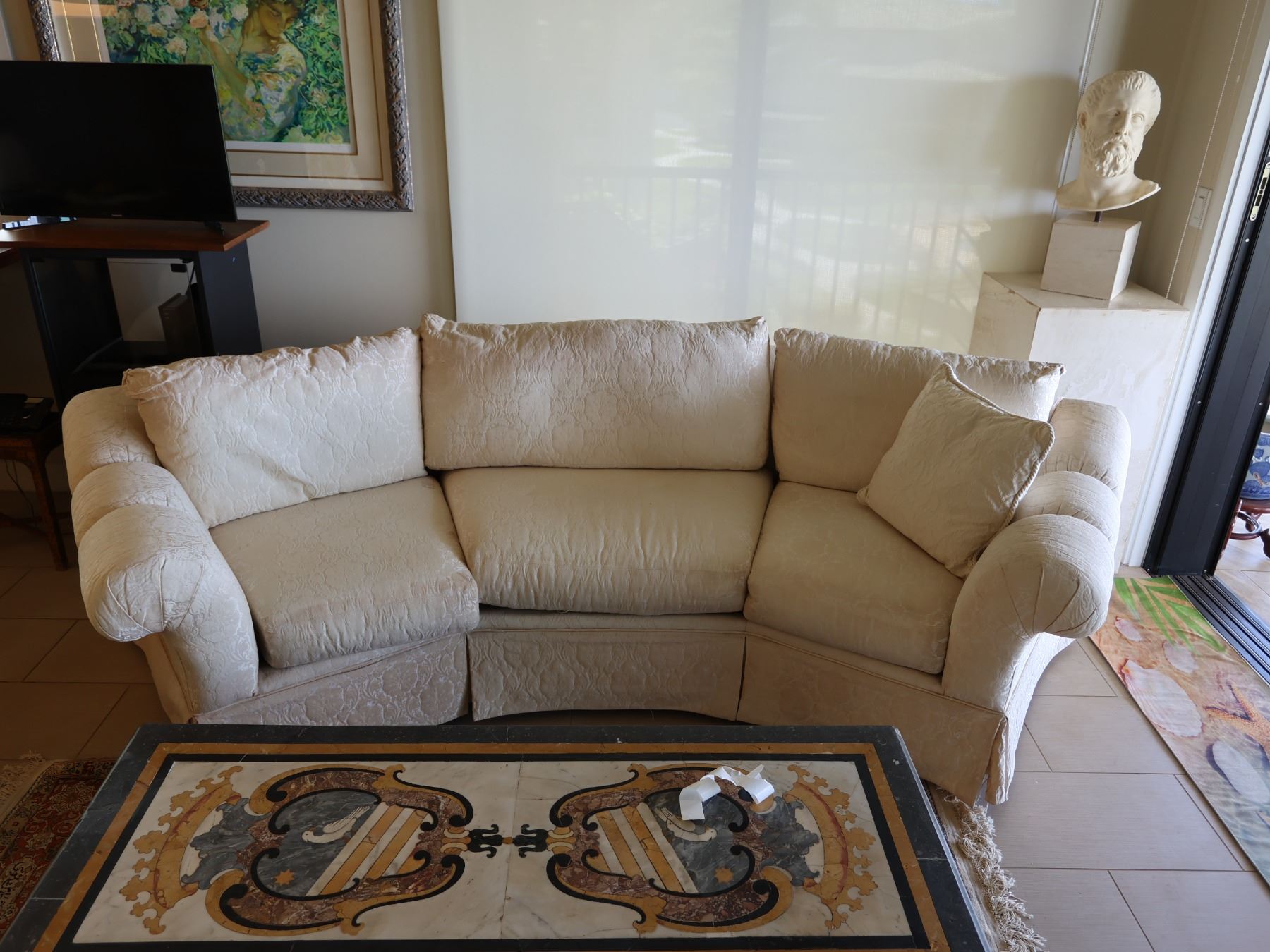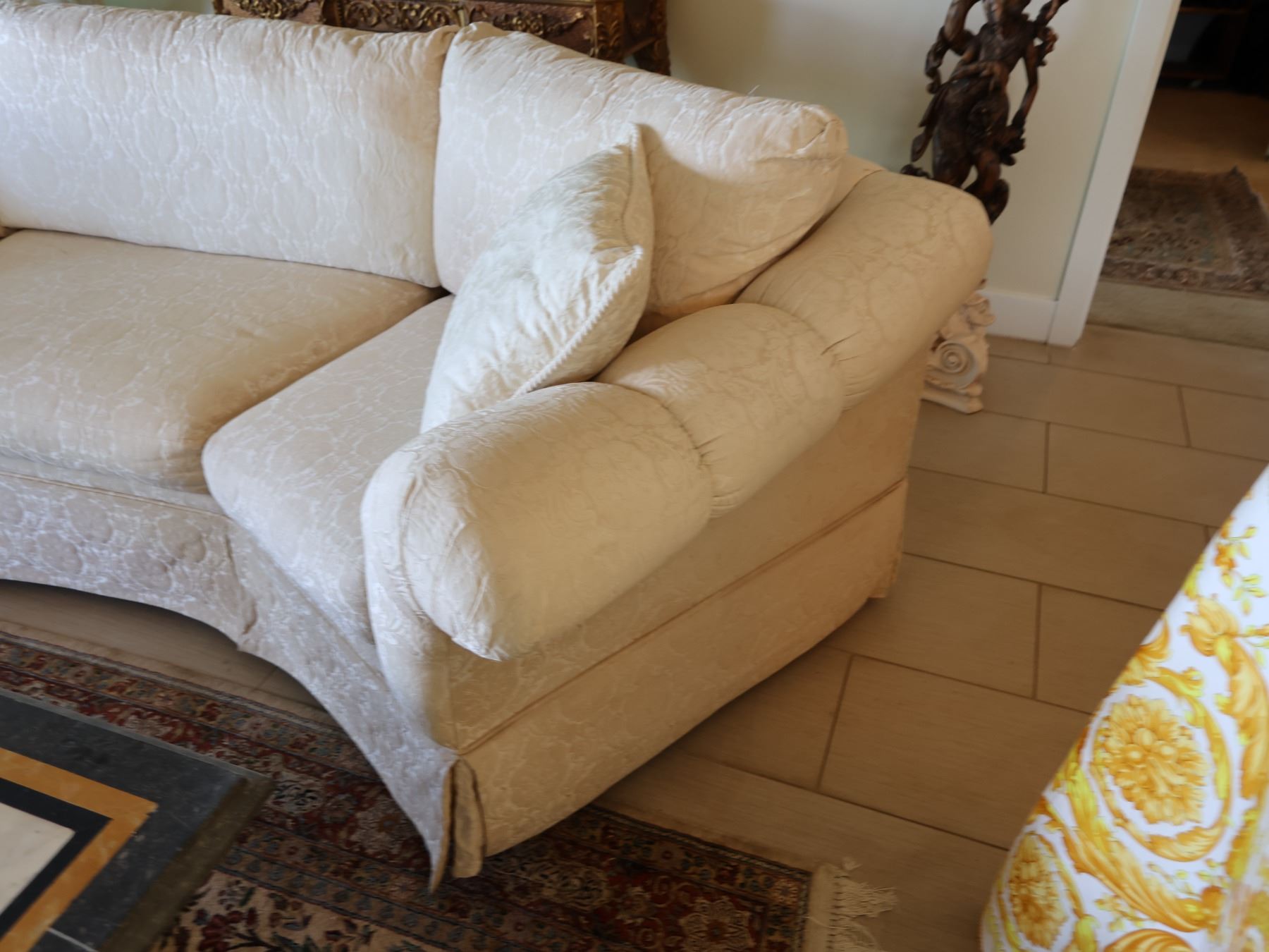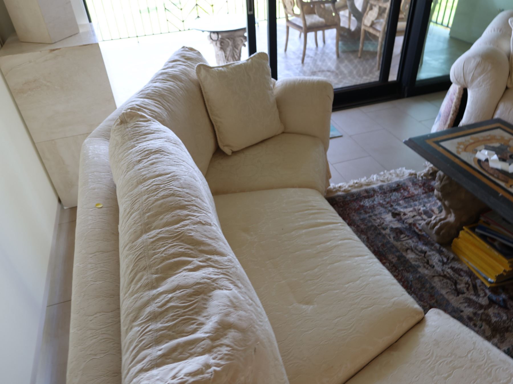 These have major sun damage and general wear and tear. Qty 2 White Curved 3-Seat Upholstered Sofa Sections w/ Back & Throw Cushions 105"L x 21" x 32"H.
