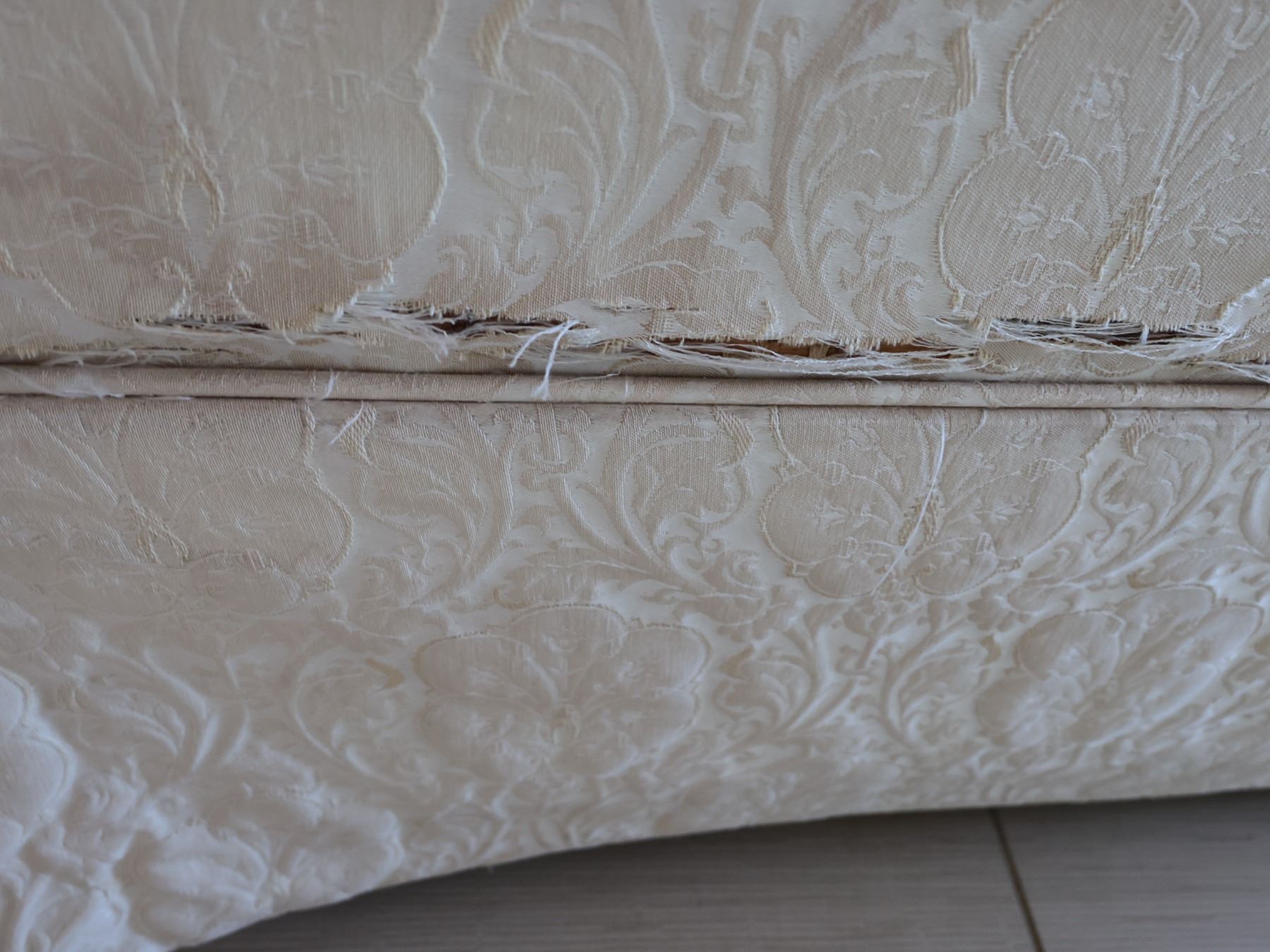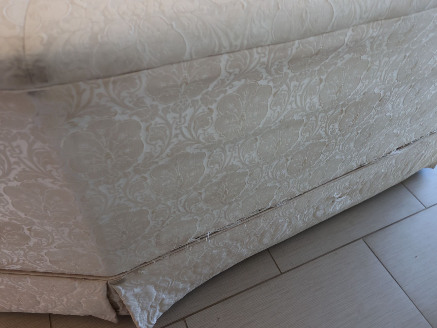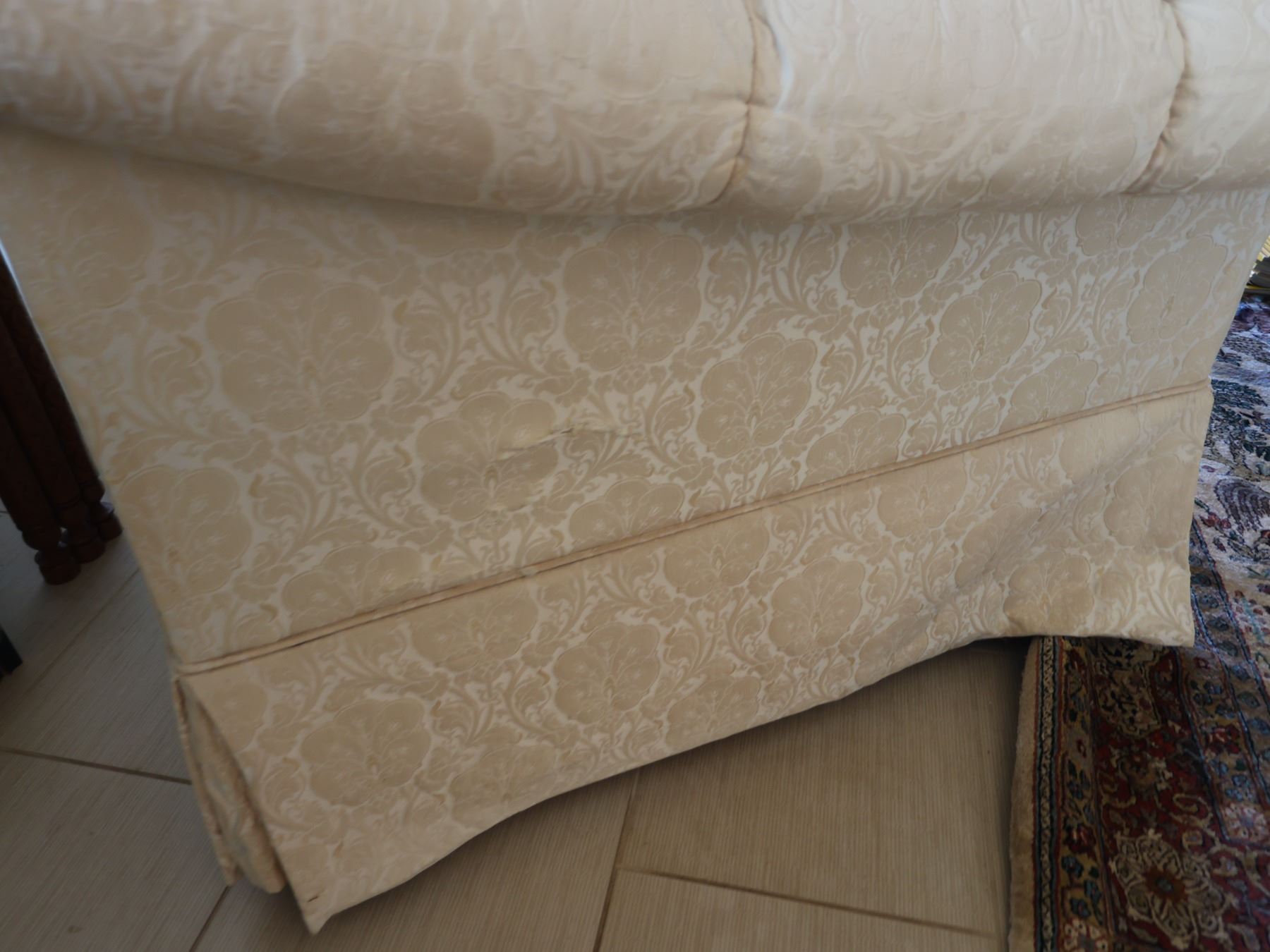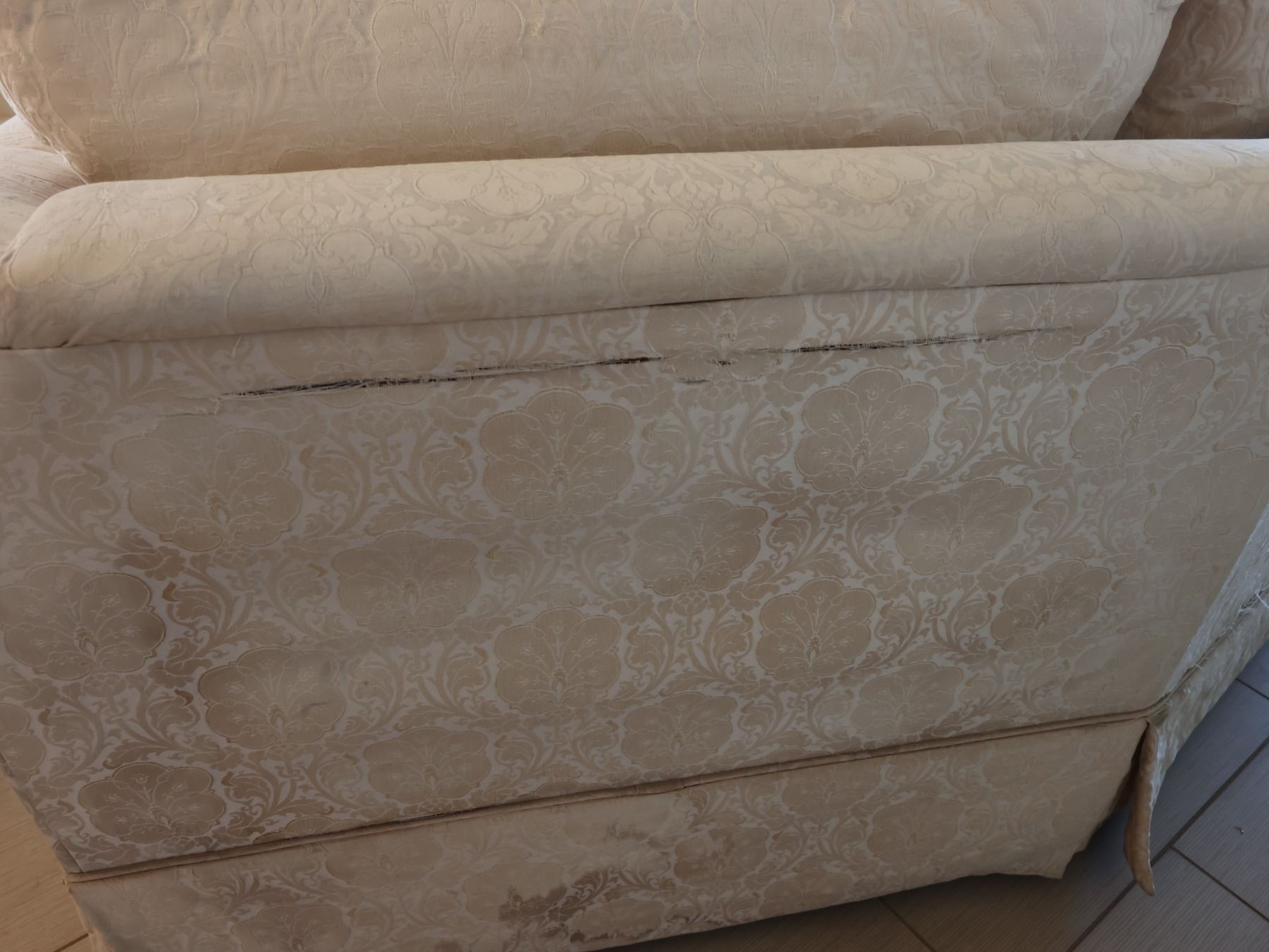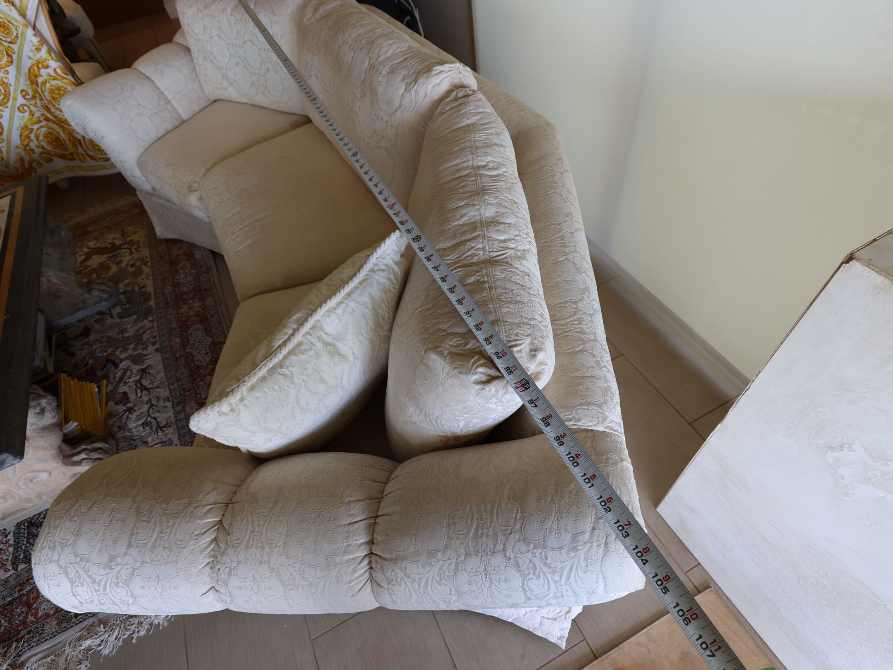 These have major sun damage and general wear and tear. Qty 2 White Curved 3-Seat Upholstered Sofa Sections w/ Back & Throw Cushions 105"L x 21" x 32"H.