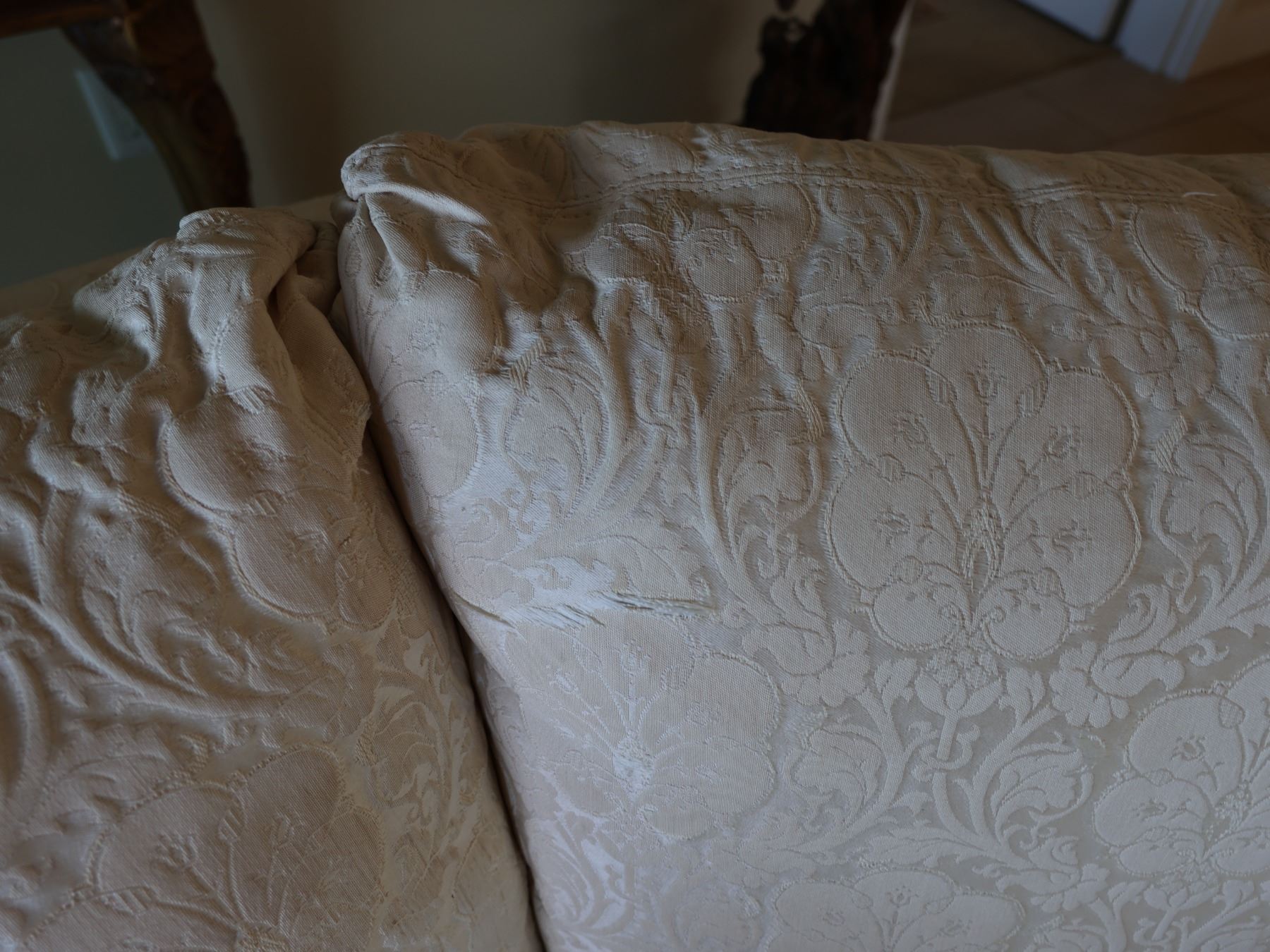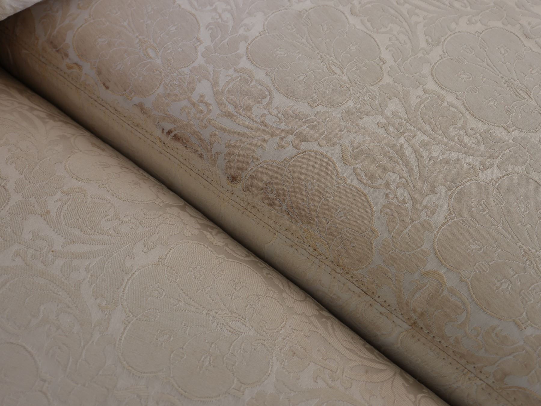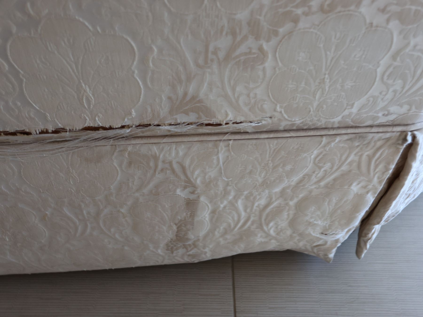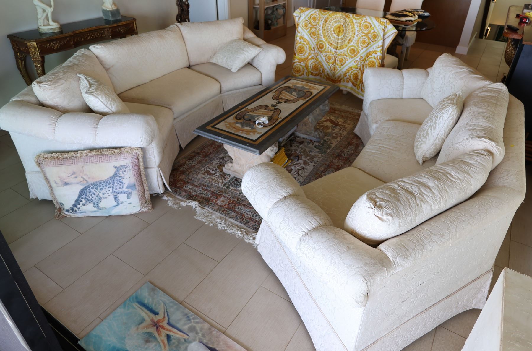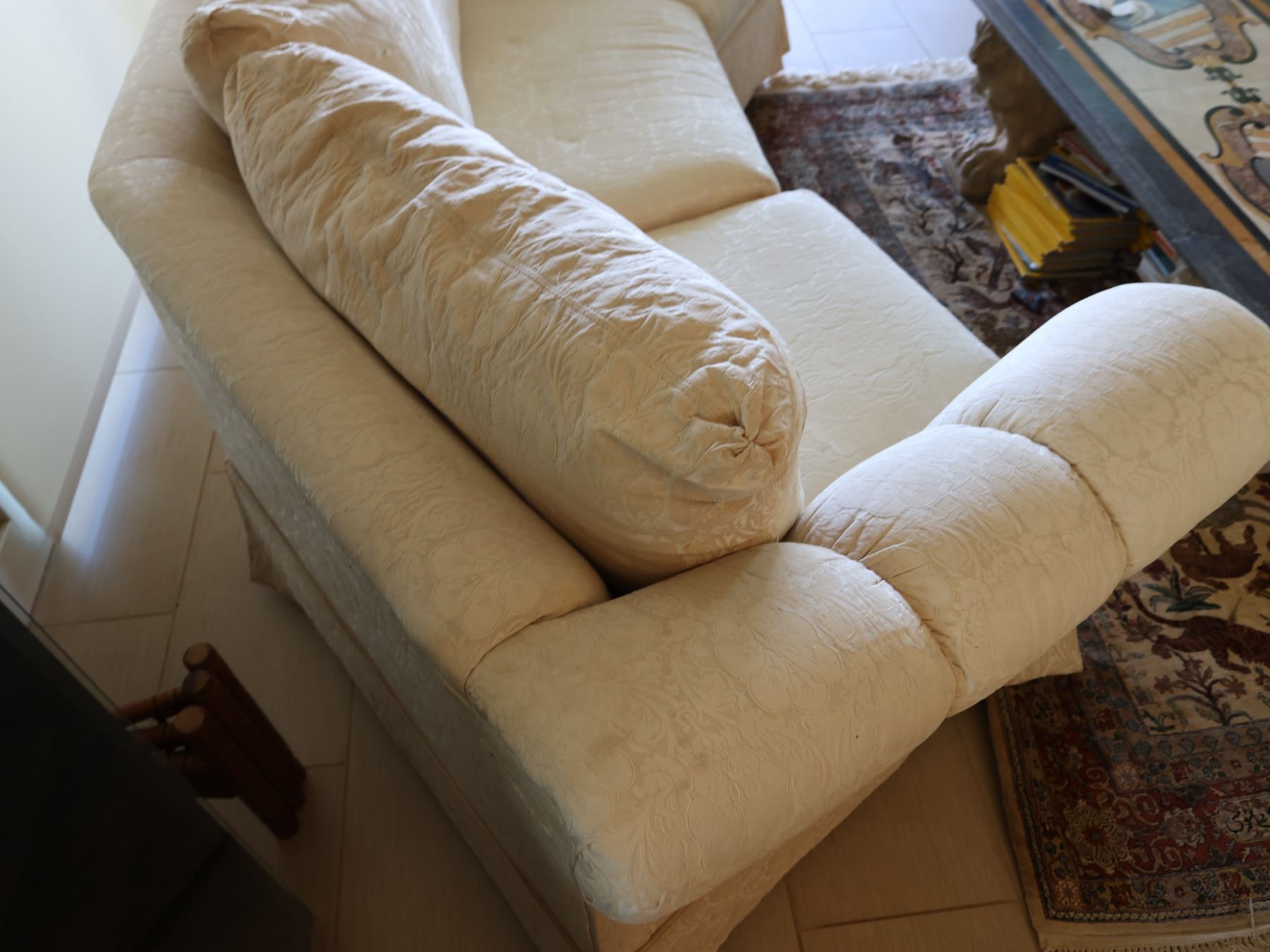These have major sun damage and general wear and tear. Qty 2 White Curved 3-Seat Upholstered Sofa Sections w/ Back & Throw Cushions 105"L x 21" x 32"H.