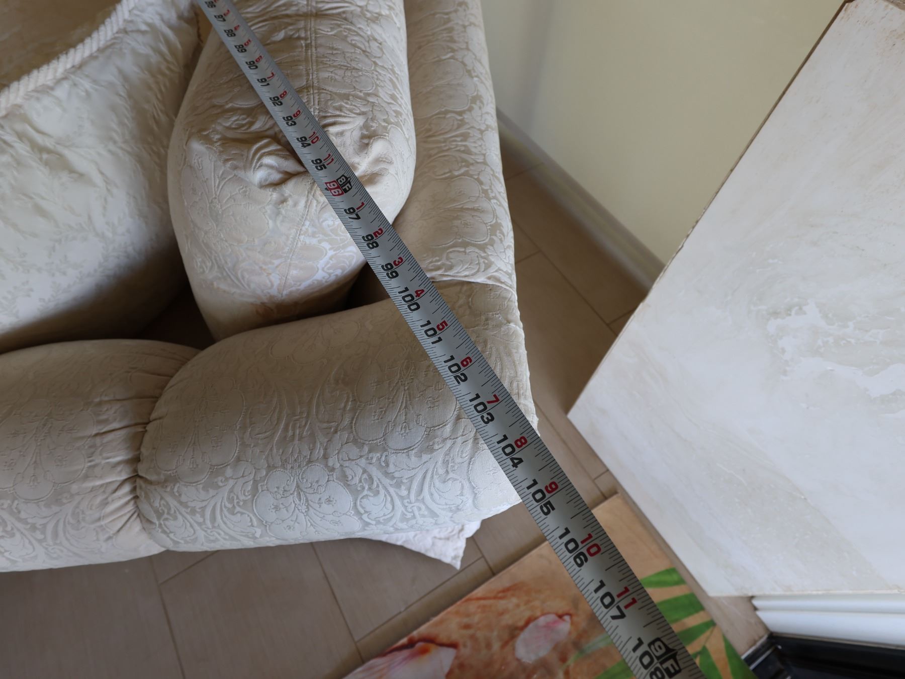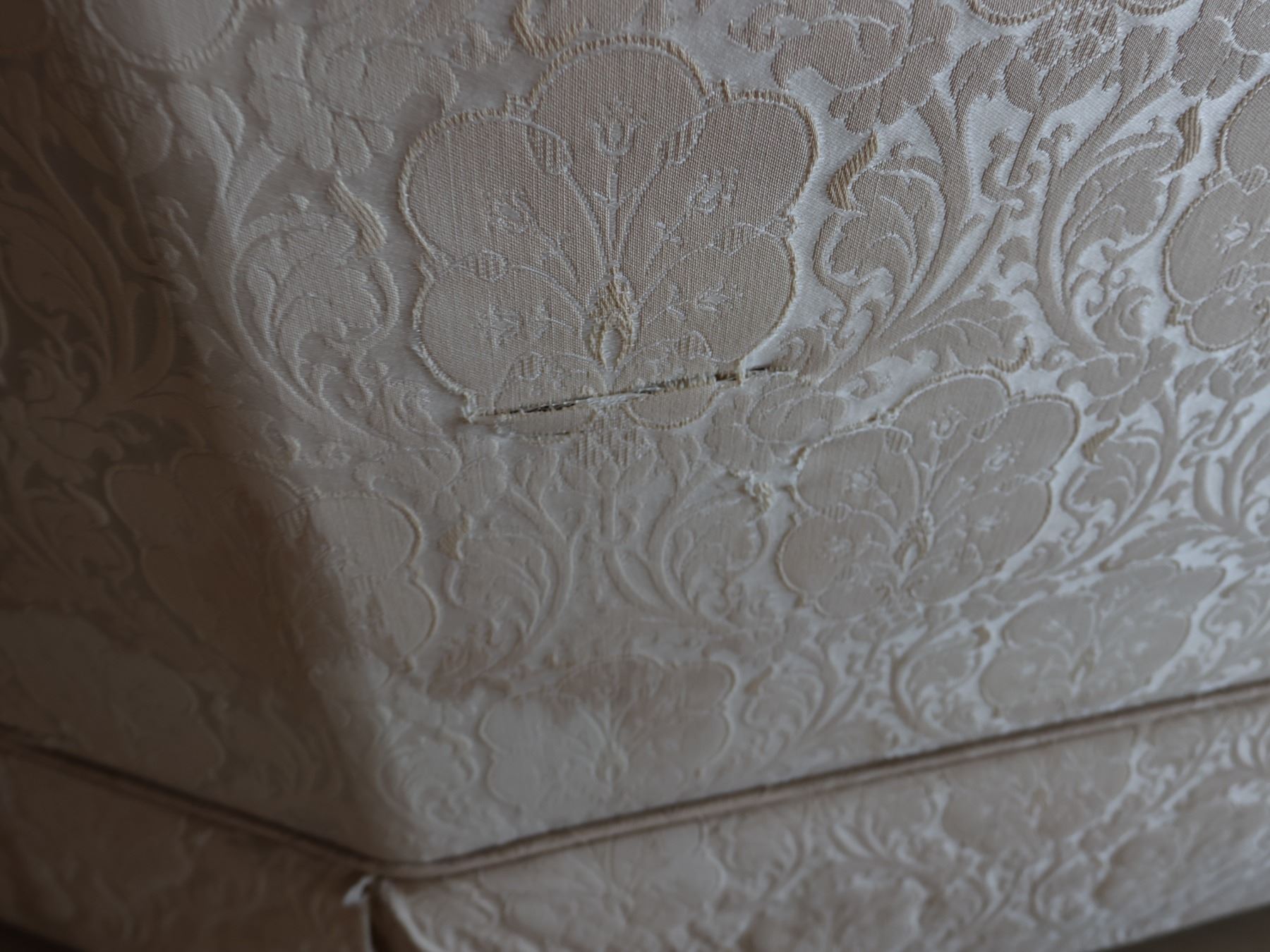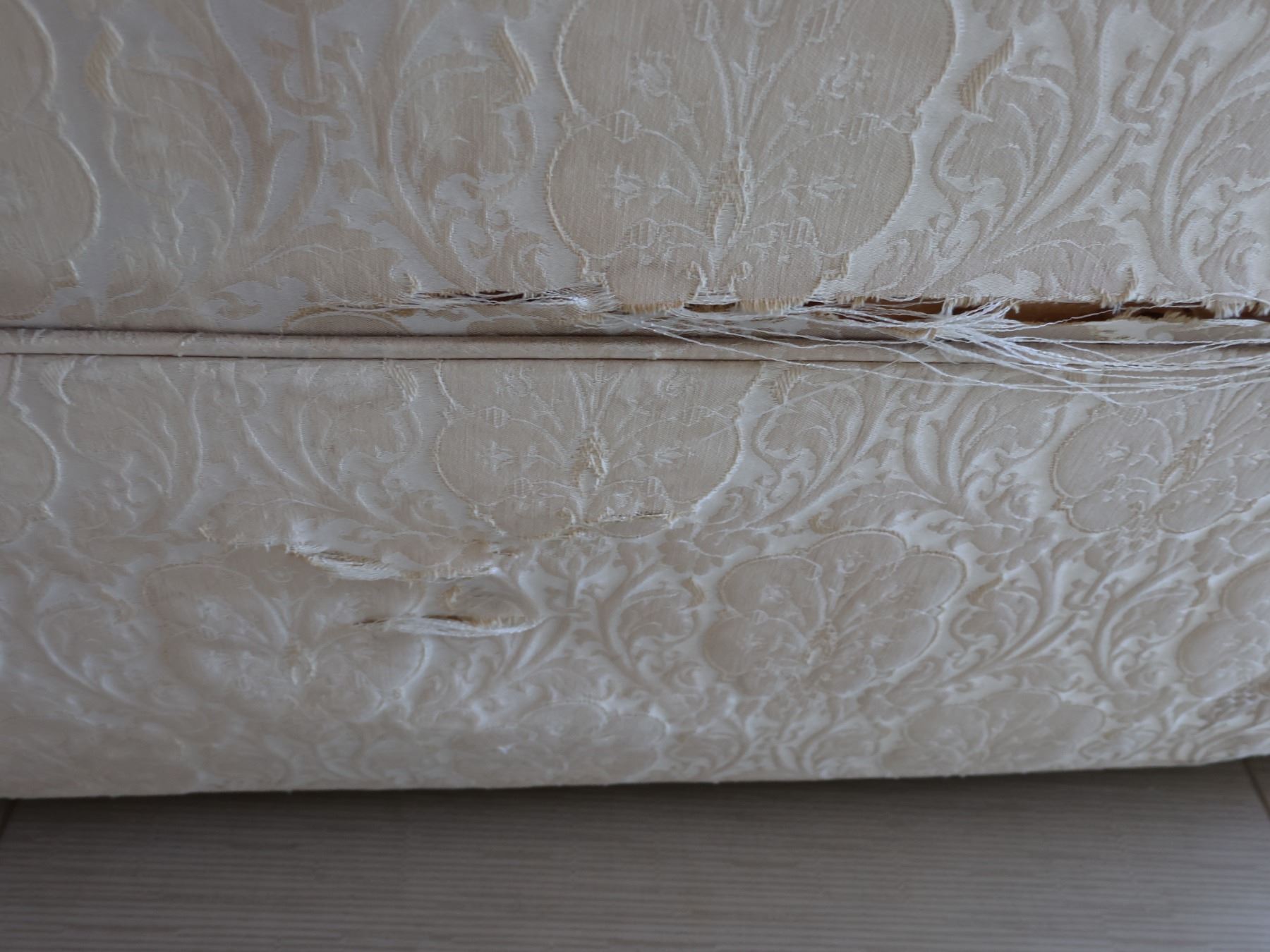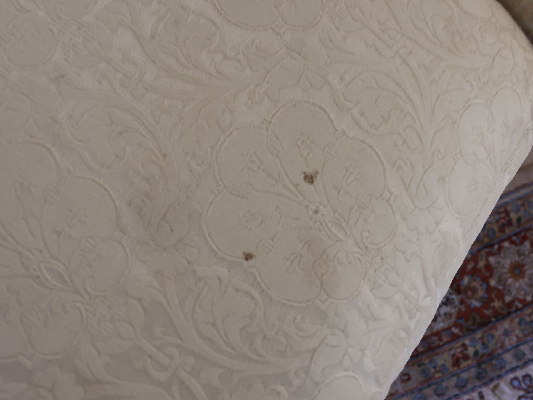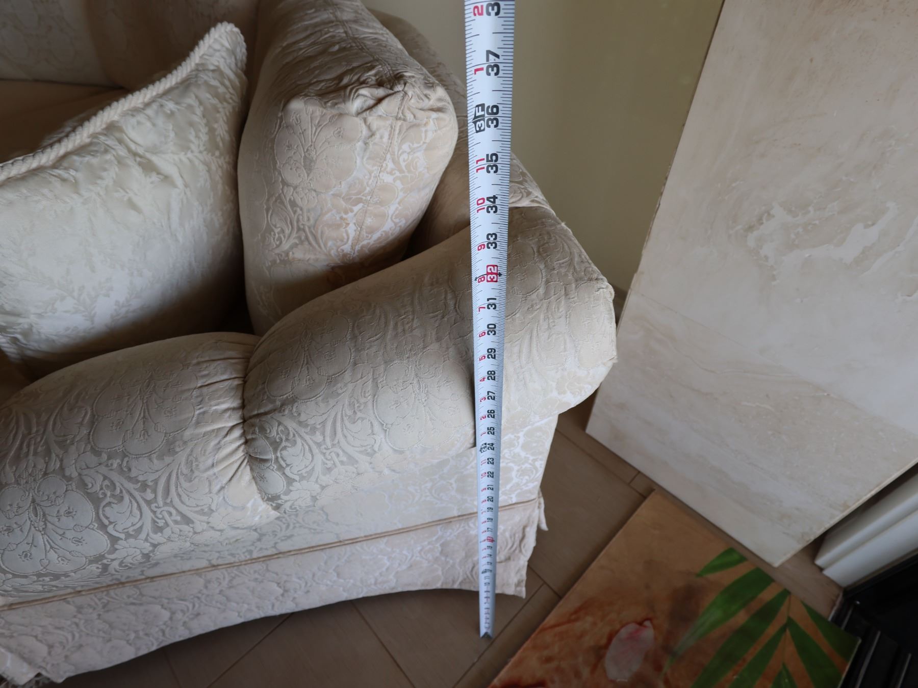 These have major sun damage and general wear and tear. Qty 2 White Curved 3-Seat Upholstered Sofa Sections w/ Back & Throw Cushions 105"L x 21" x 32"H.