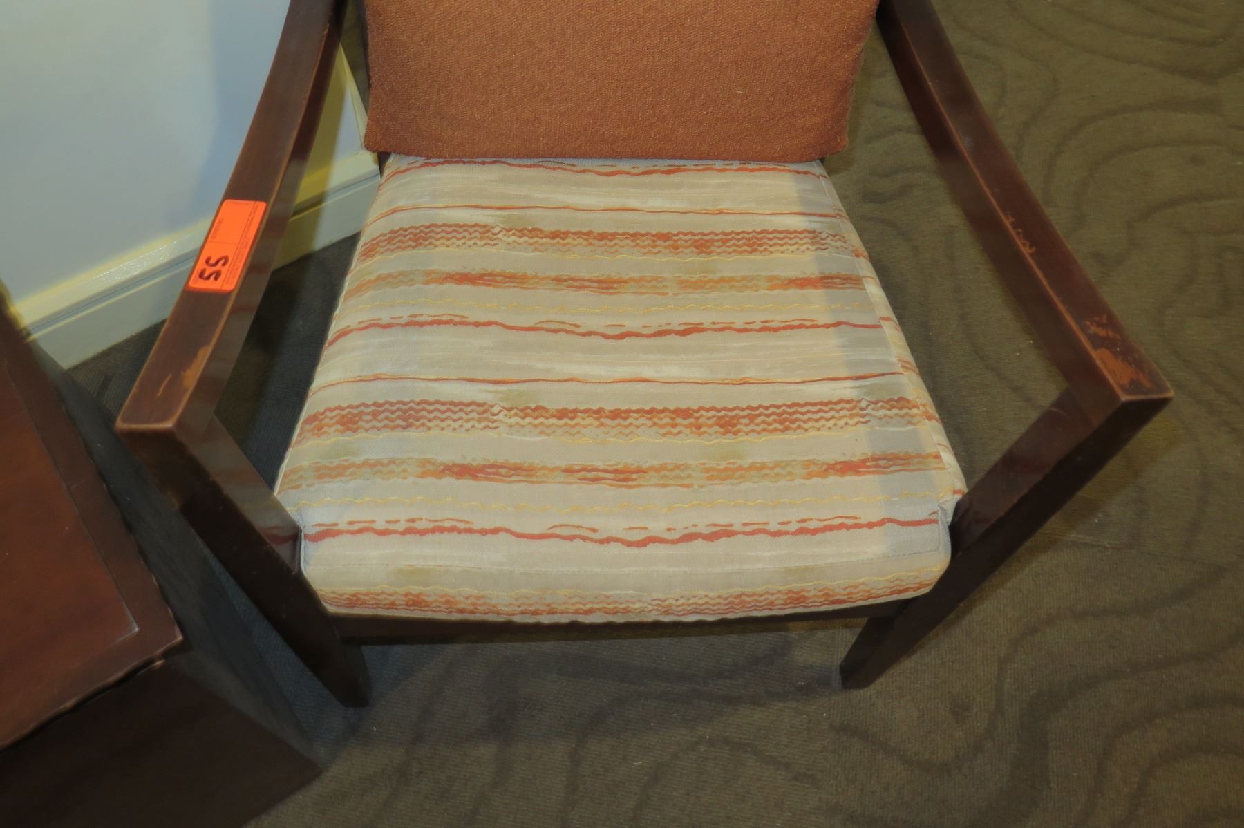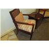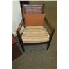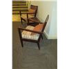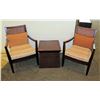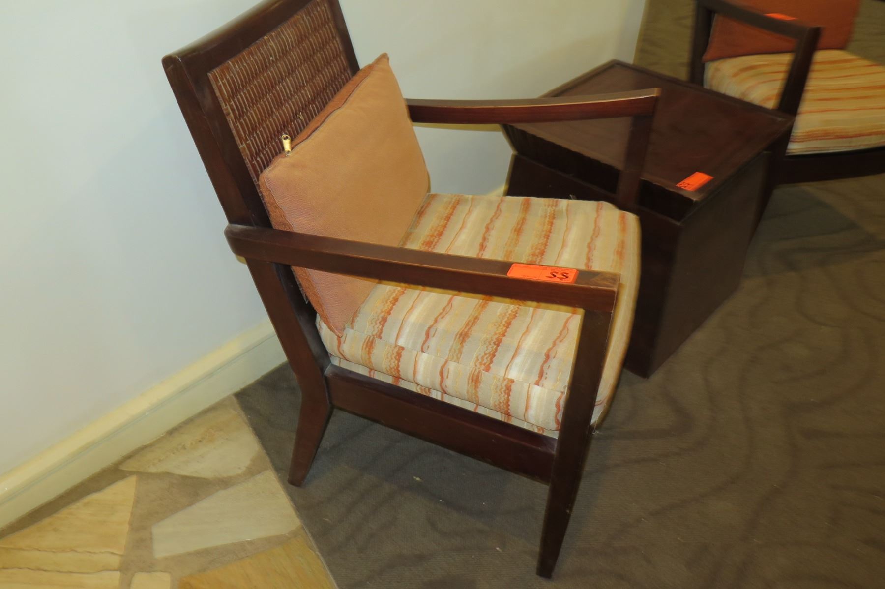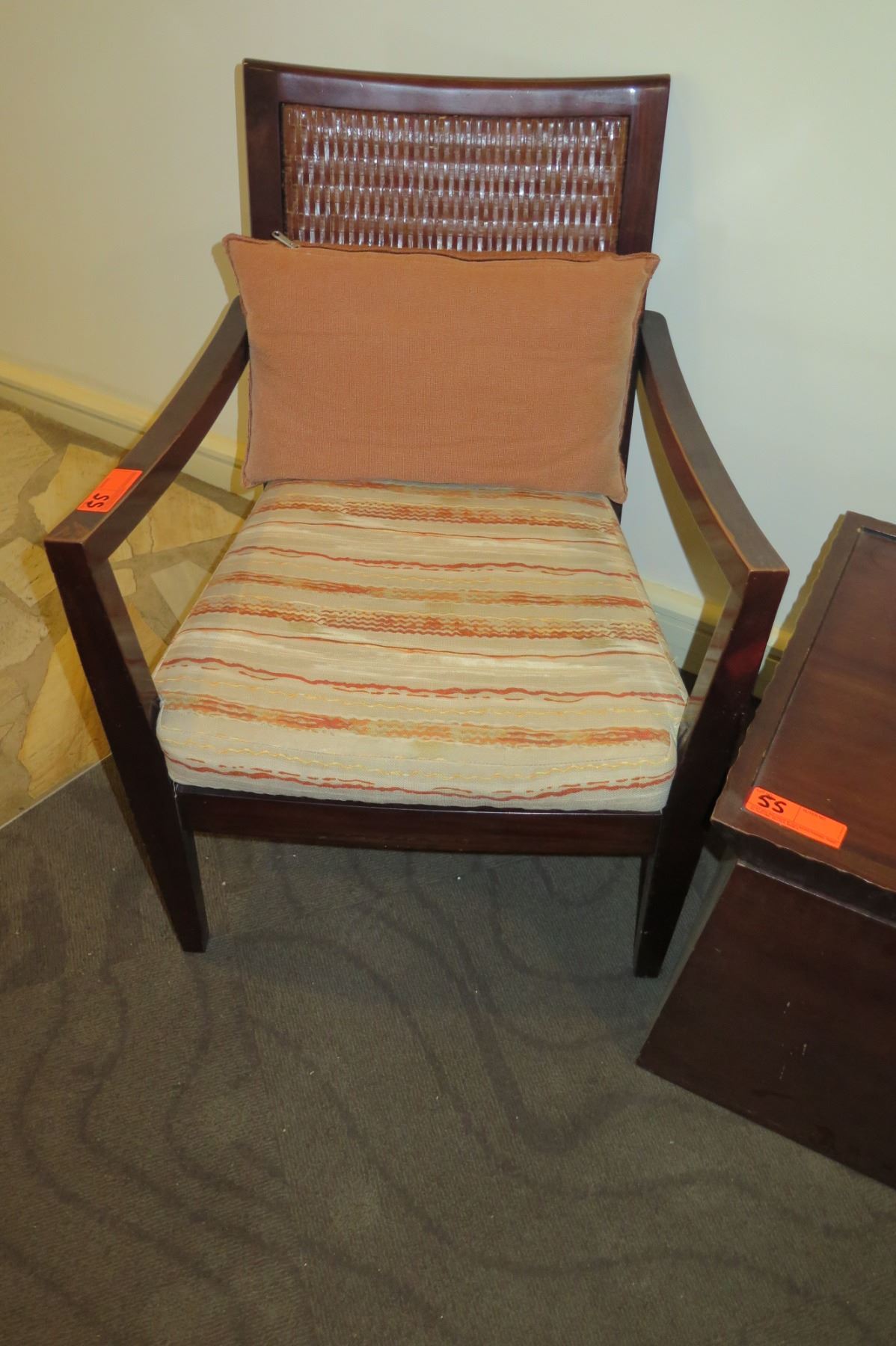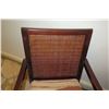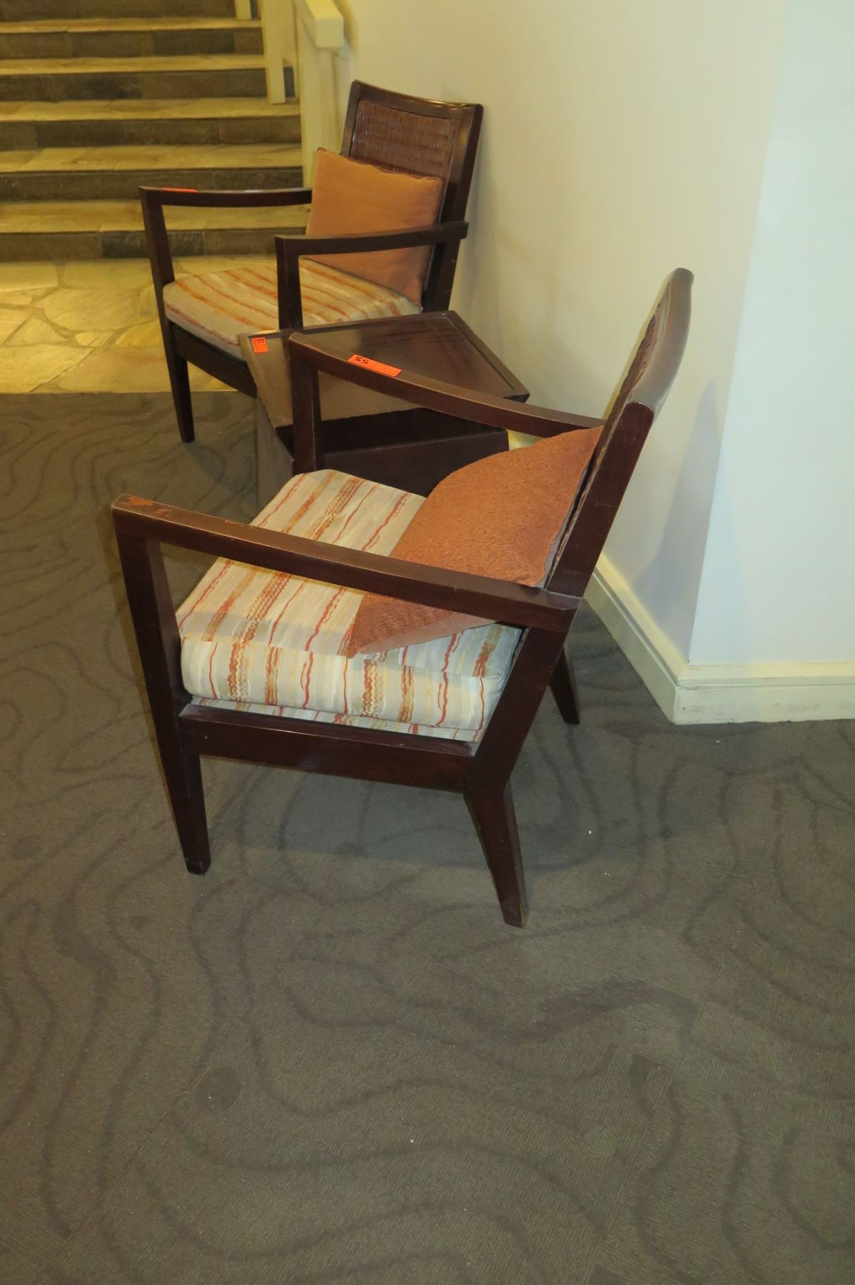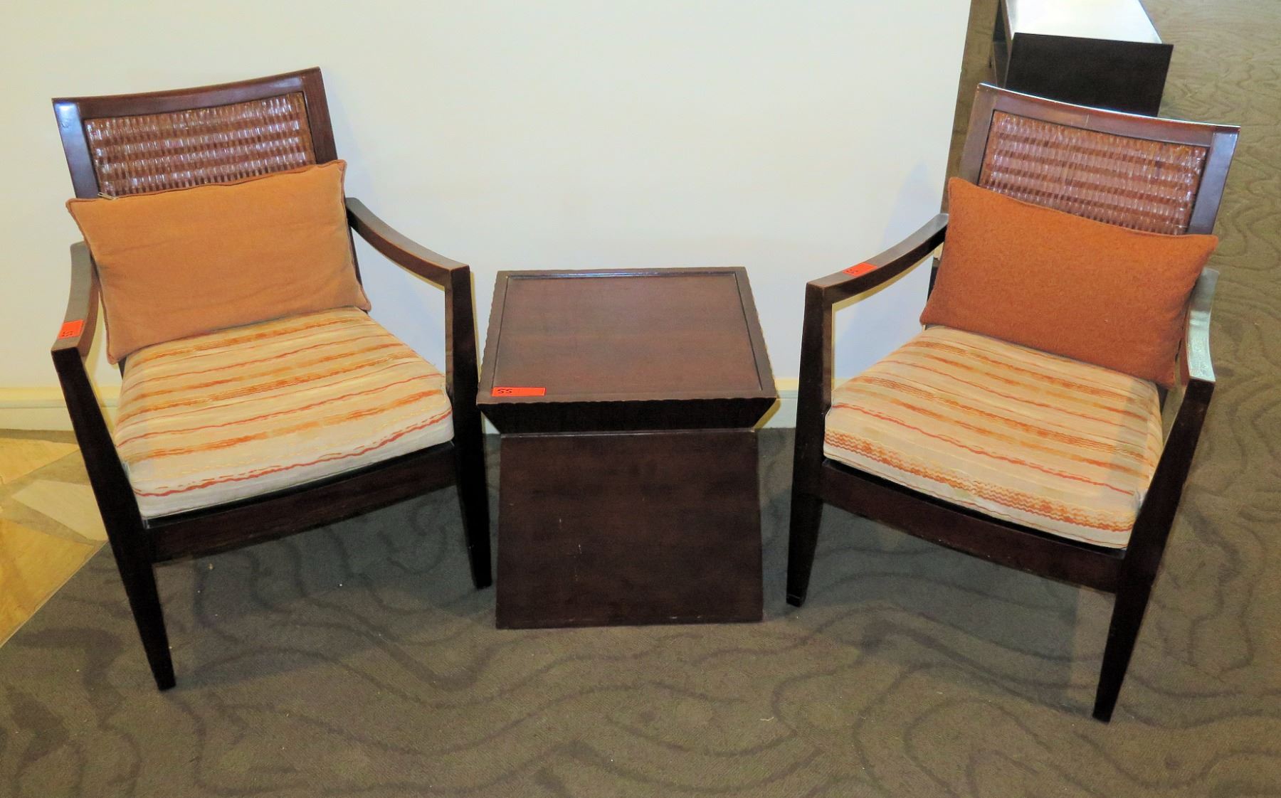 Qty 2 Wooden Chairs w/ Woven Back (34"H), Seat Cushions & Pillows & Square Wooden Table 19.5"x19.5"x