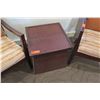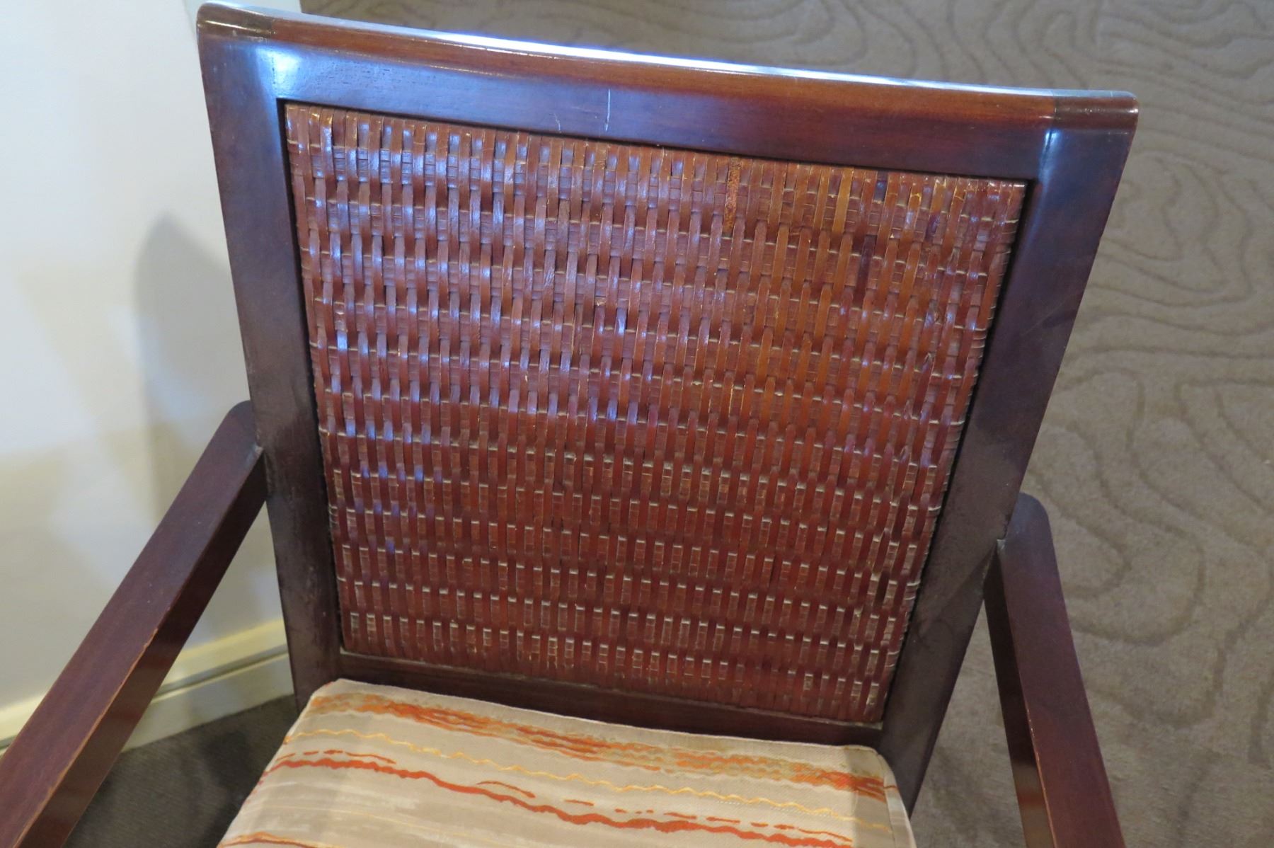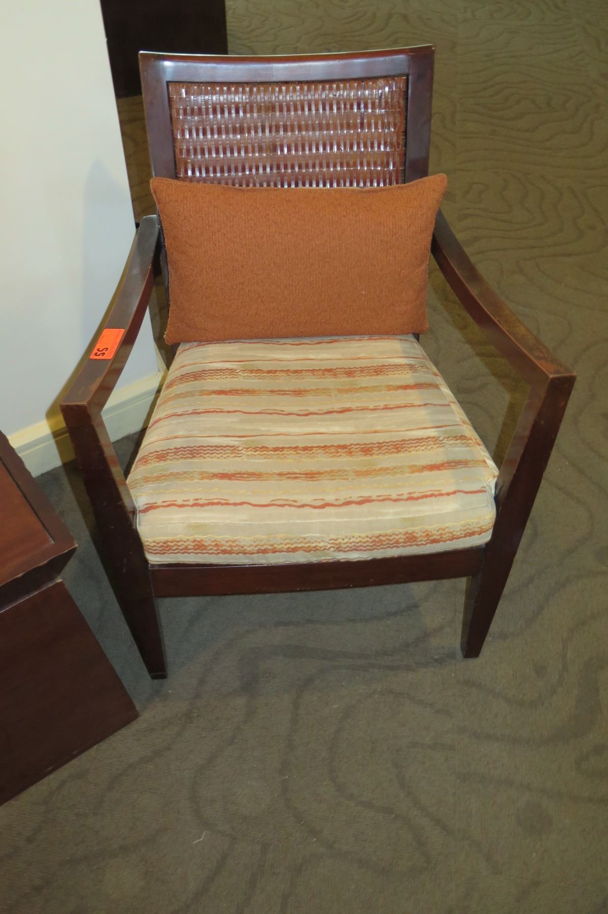 Qty 2 Wooden Chairs w/ Woven Back (34"H), Seat Cushions & Pillows & Square Wooden Table 19.5"x19.5"x20"H