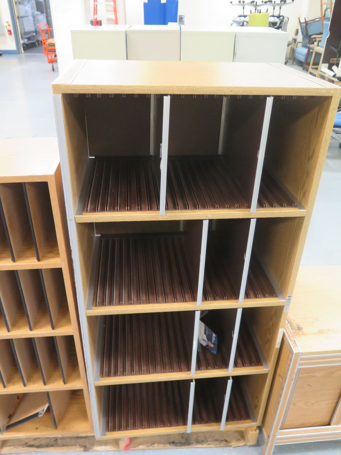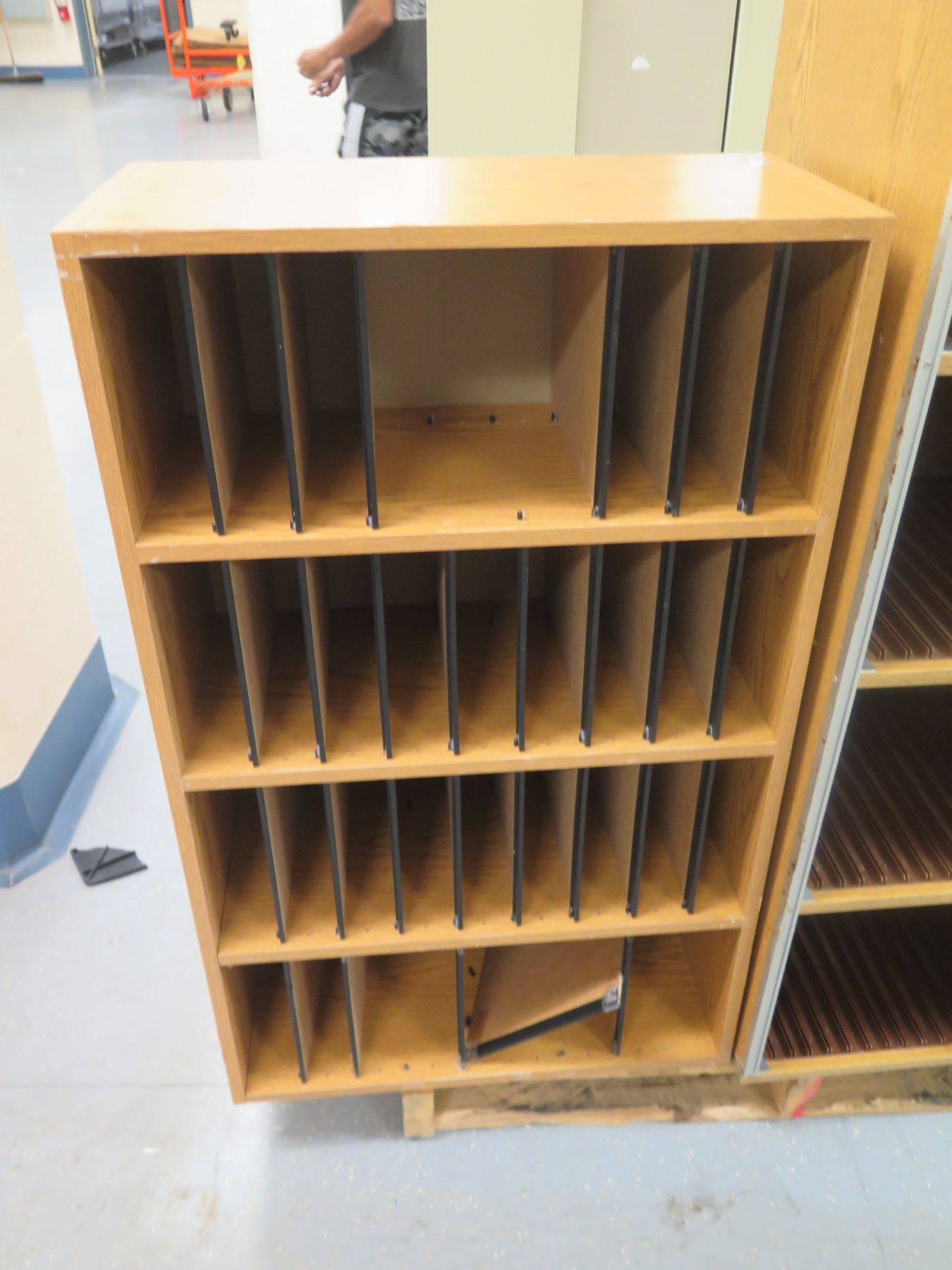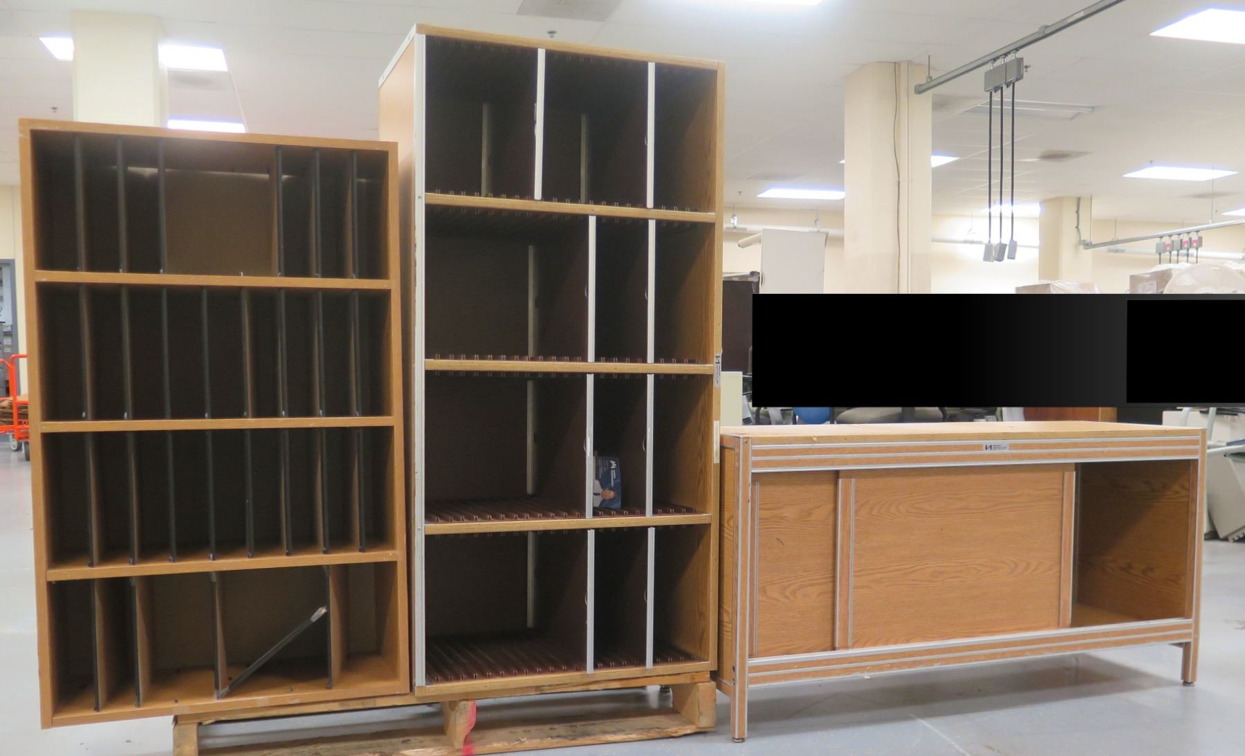 Qty 2 Wooden Organizer Open-Front Cabinets & Hamilton Sorter Shelf