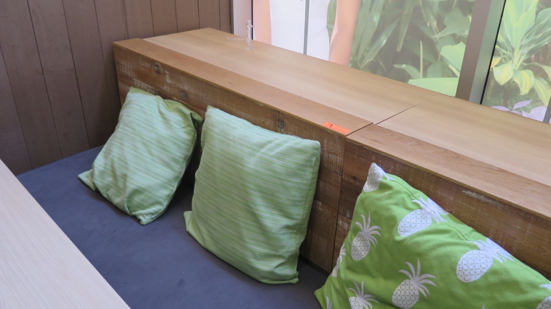 Qty 2 Wooden Tables (87"x29.5") w/ Upholstered Bench Seats, Cushions & Long Modular Bench Seating