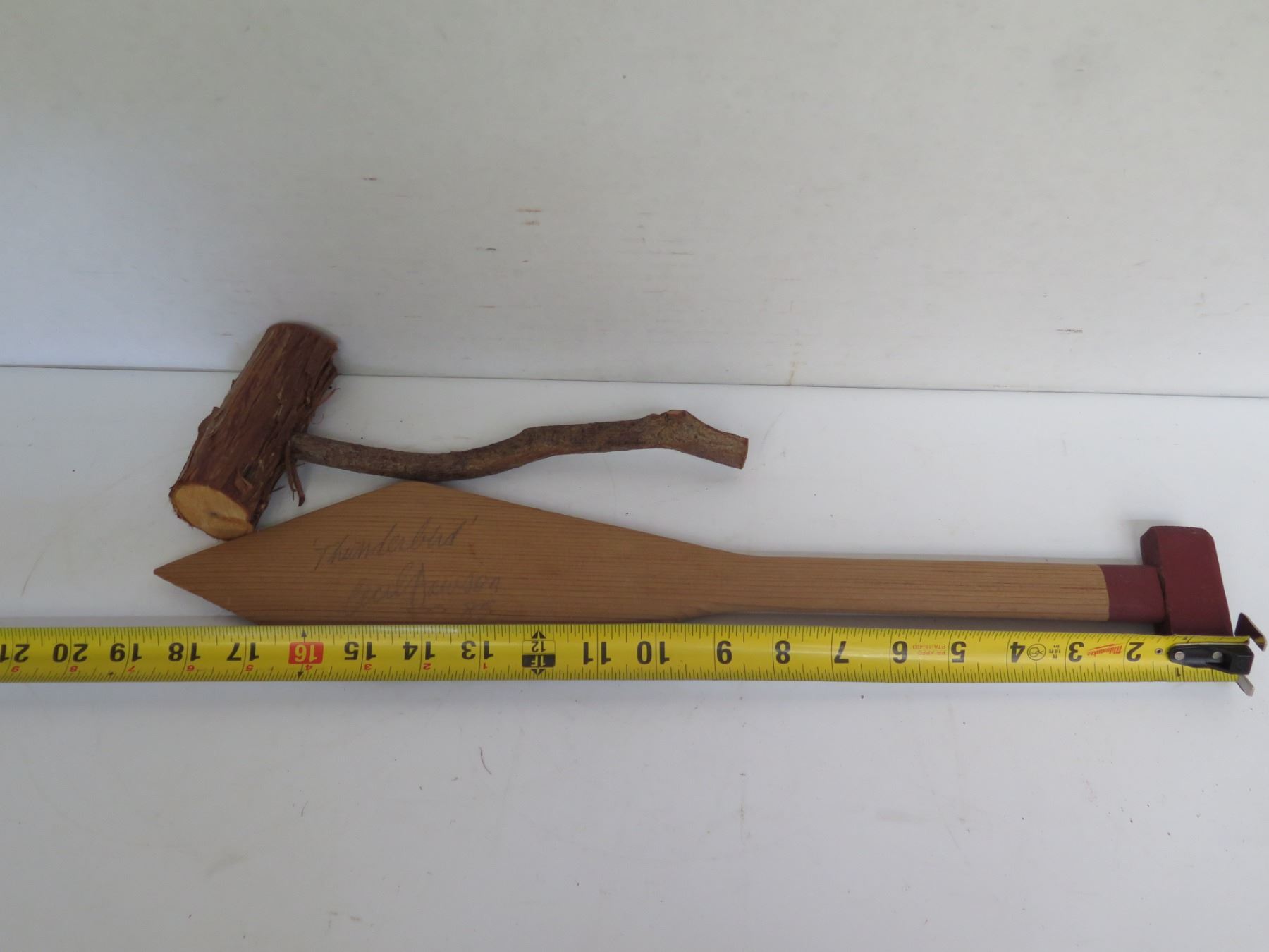 Qty 2 Wooden Tools, Painted Thunderbird Paddle (Signed) & Wooden Hammer,