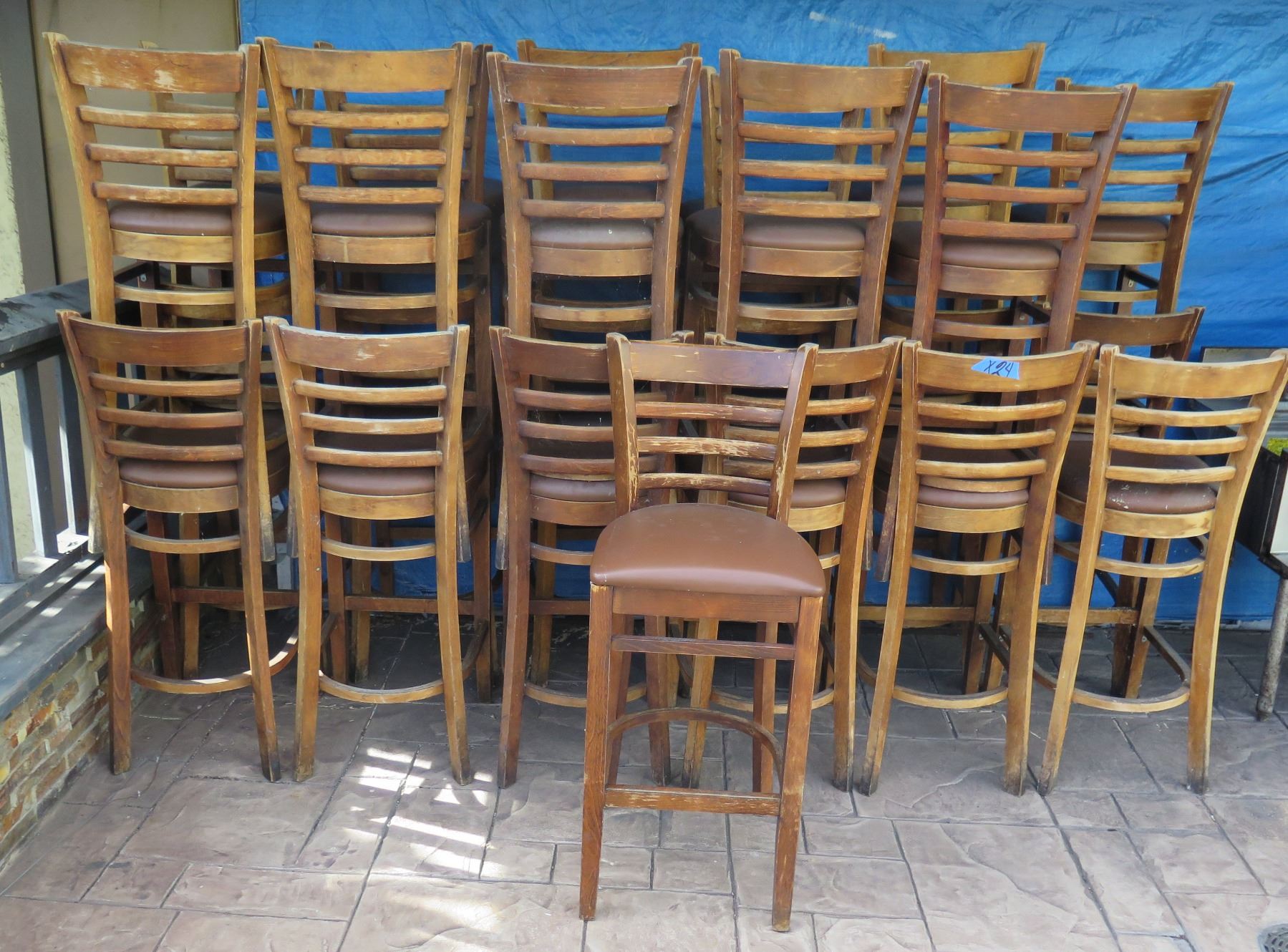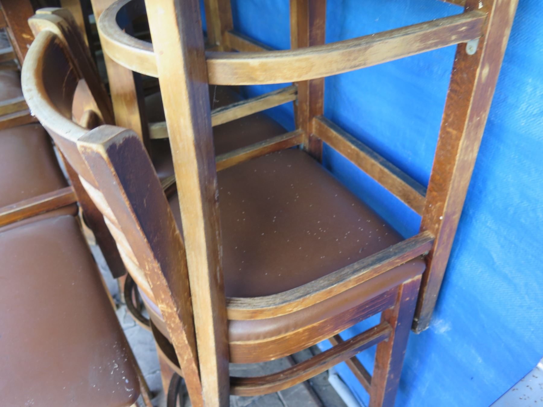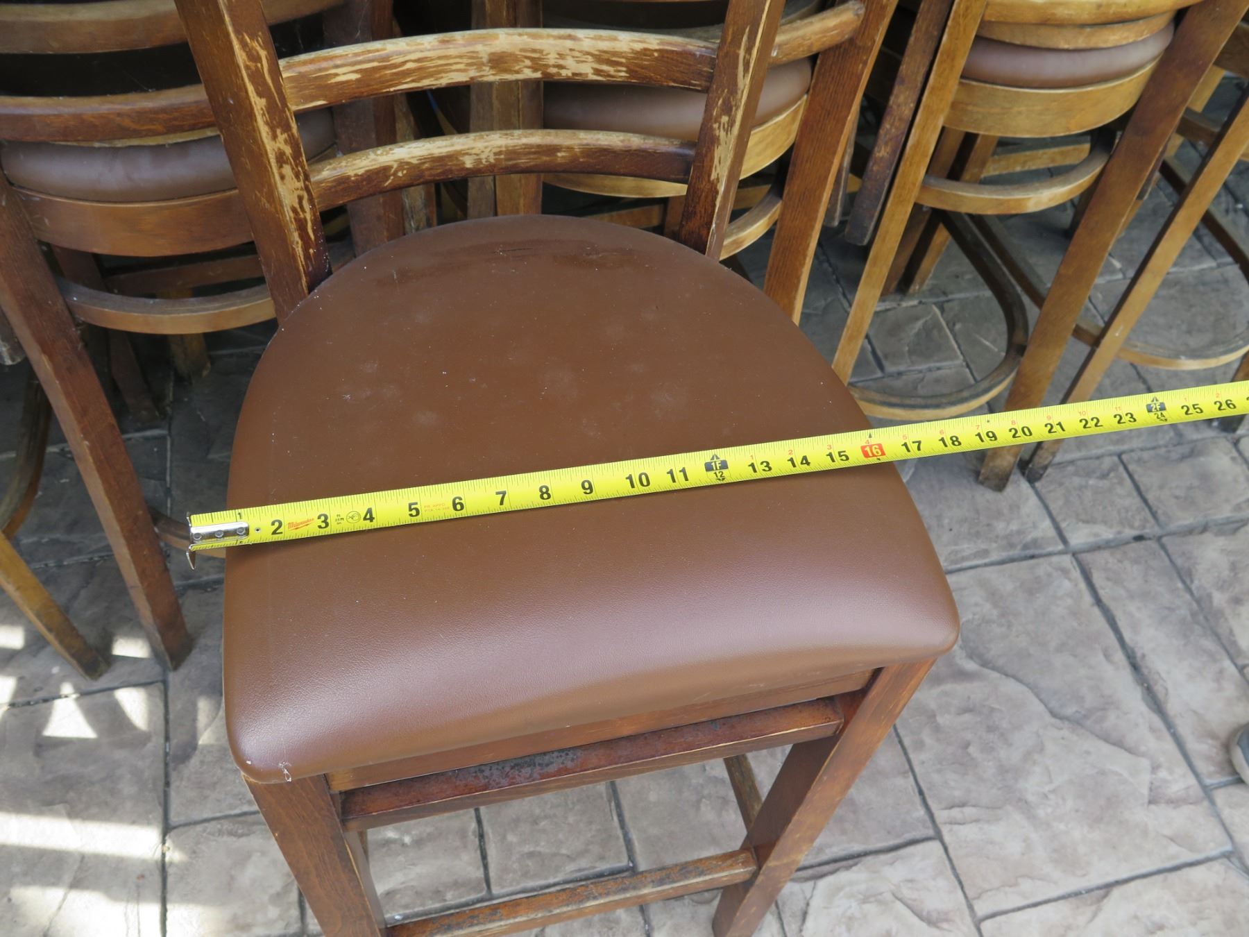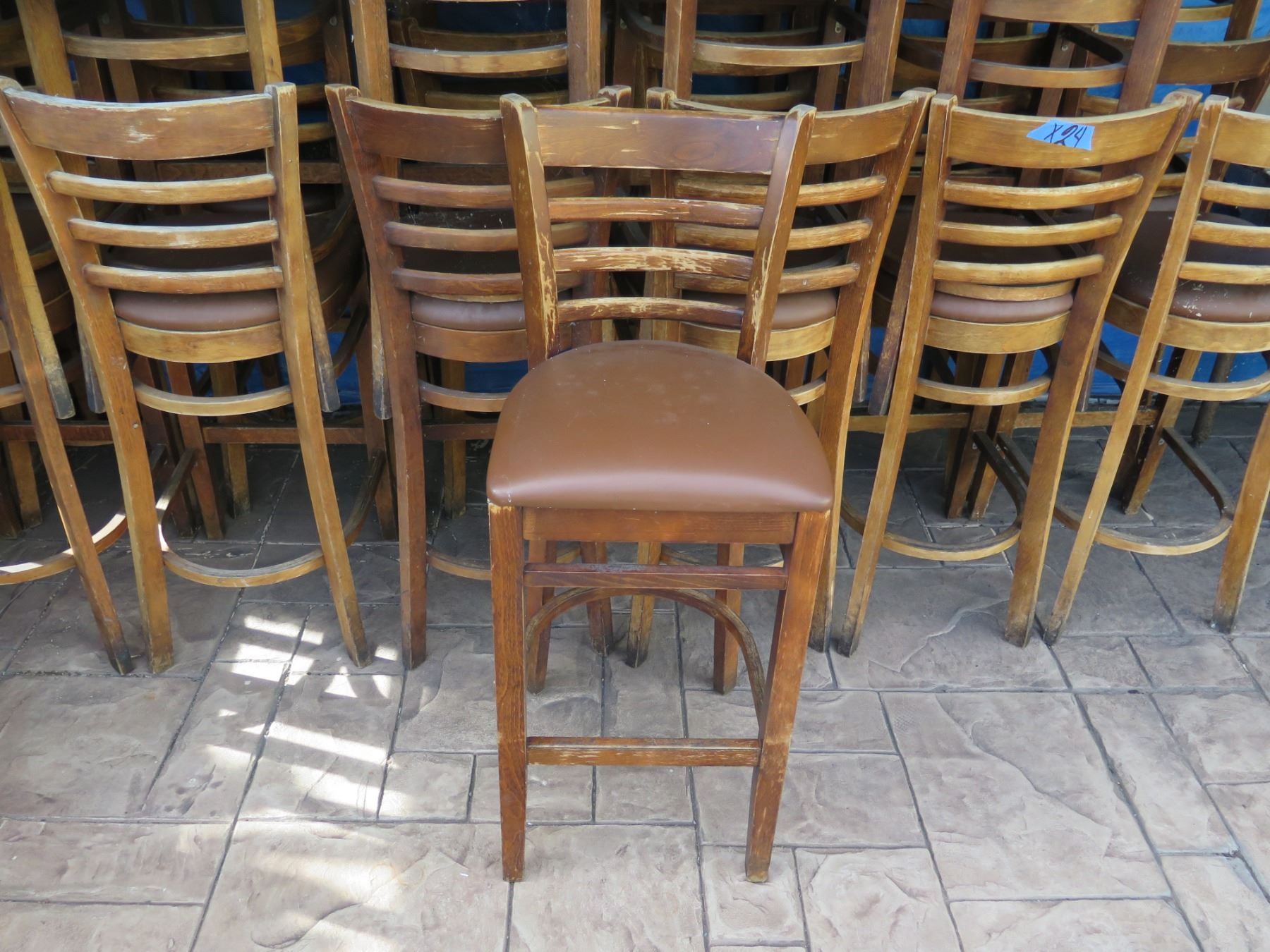 Qty 24 Wooden Stools w/ Slatted Backs & Upholstered Seats 16"x16"x44"H. Note: Wooden items have been sitting for awhile & termite droppings have been observed.