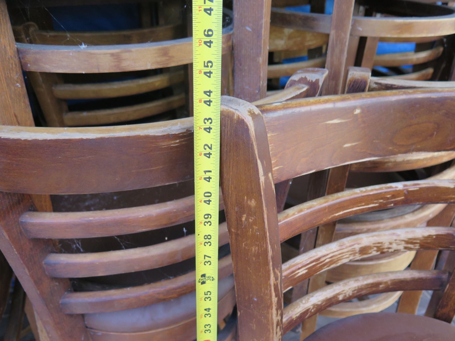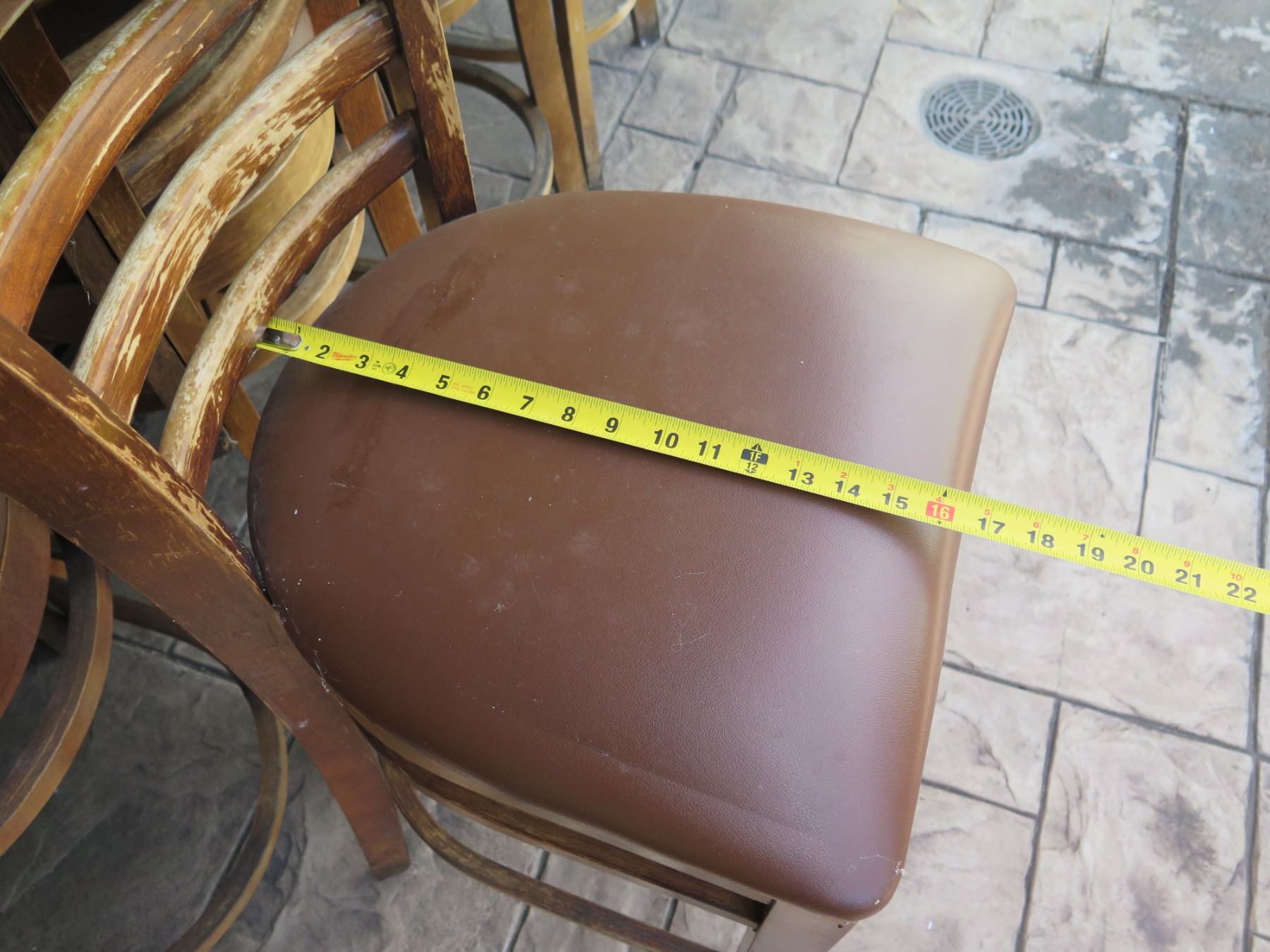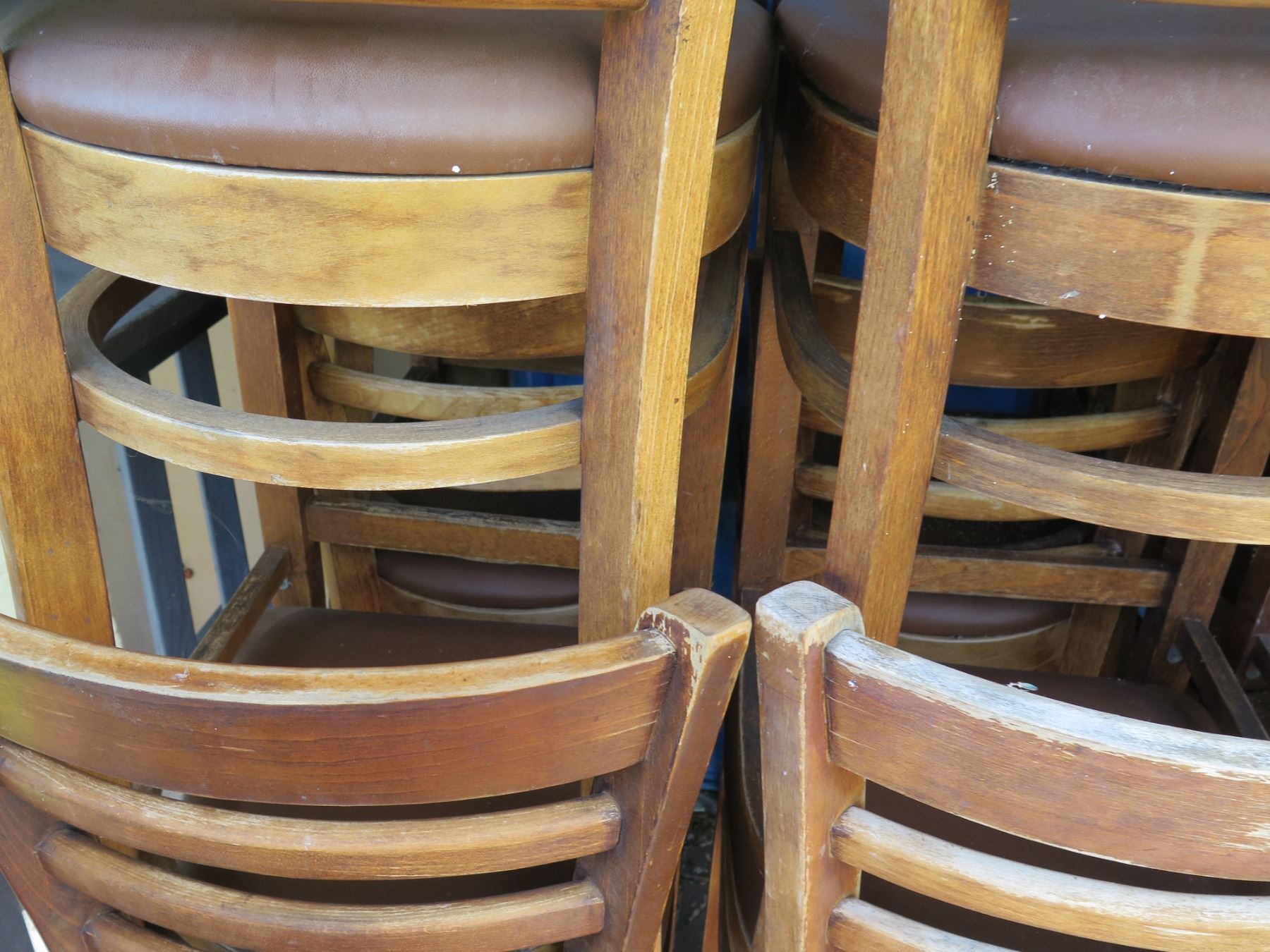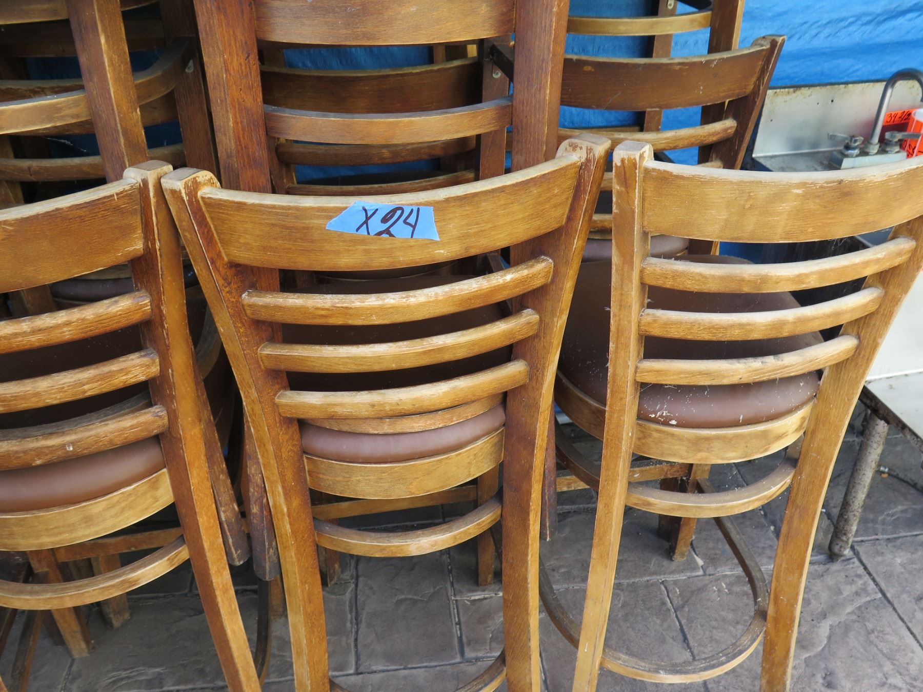 Qty 24 Wooden Stools w/ Slatted Backs & Upholstered Seats 16"x16"x44"H. Note: Wooden items have been sitting for awhile & termite droppings have been observed.