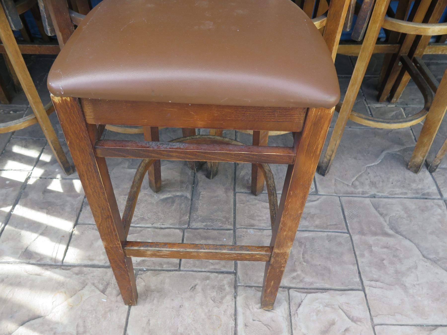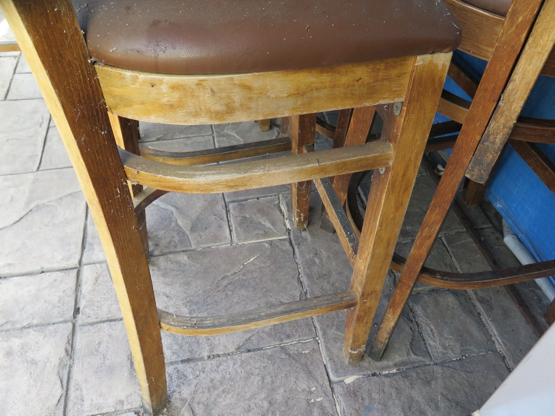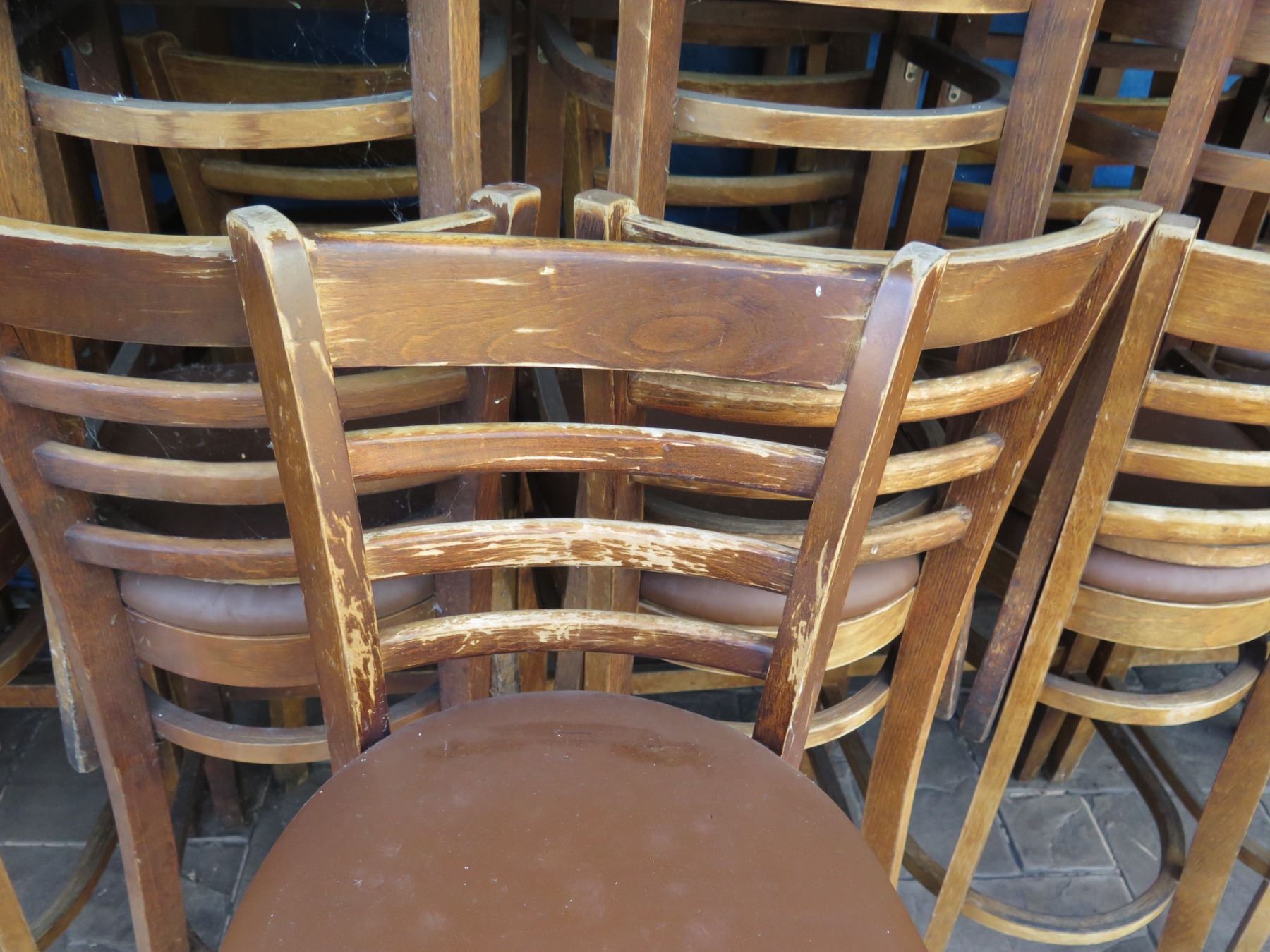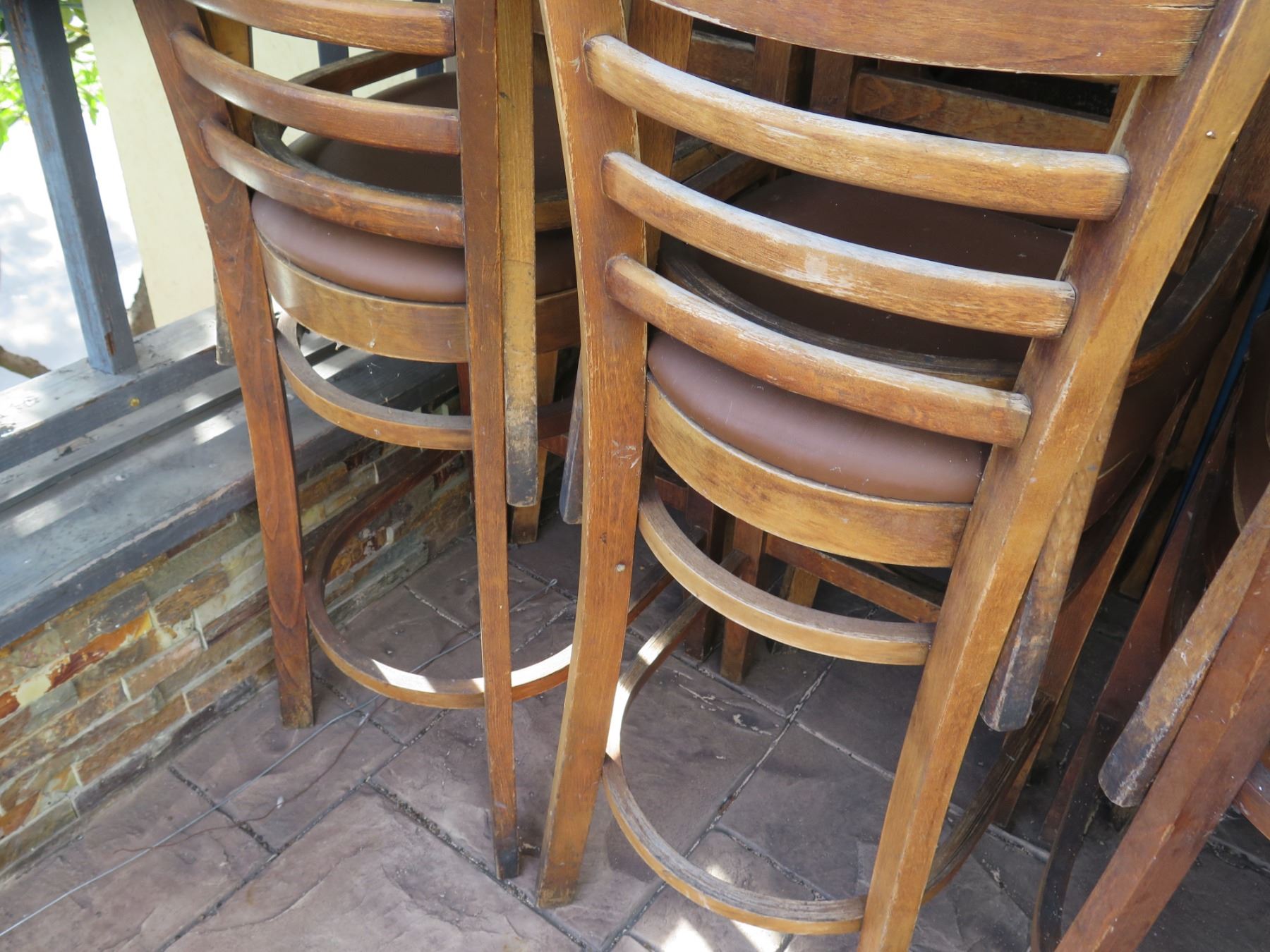 Qty 24 Wooden Stools w/ Slatted Backs & Upholstered Seats 16"x16"x44"H. Note: Wooden items have been sitting for awhile & termite droppings have been observed.