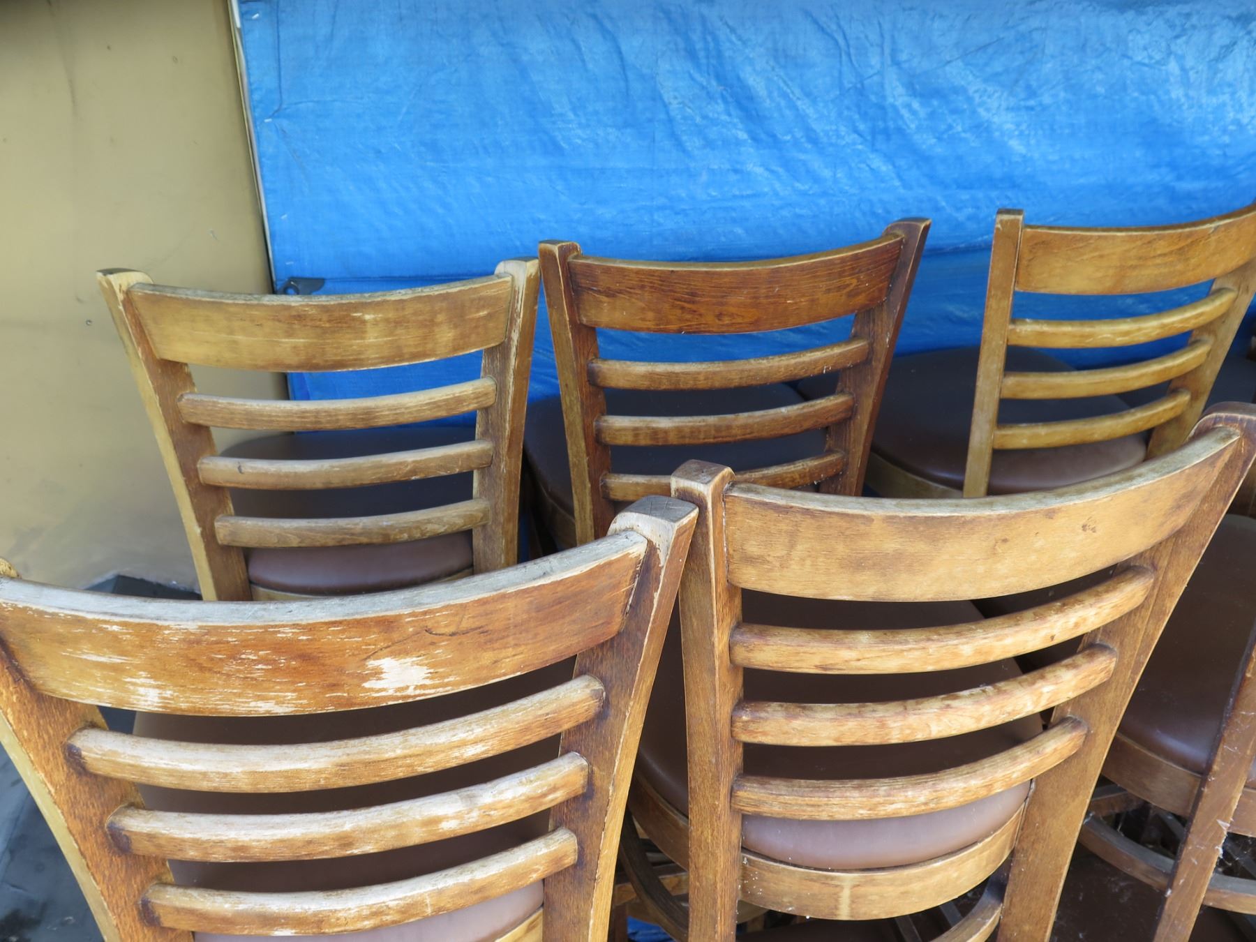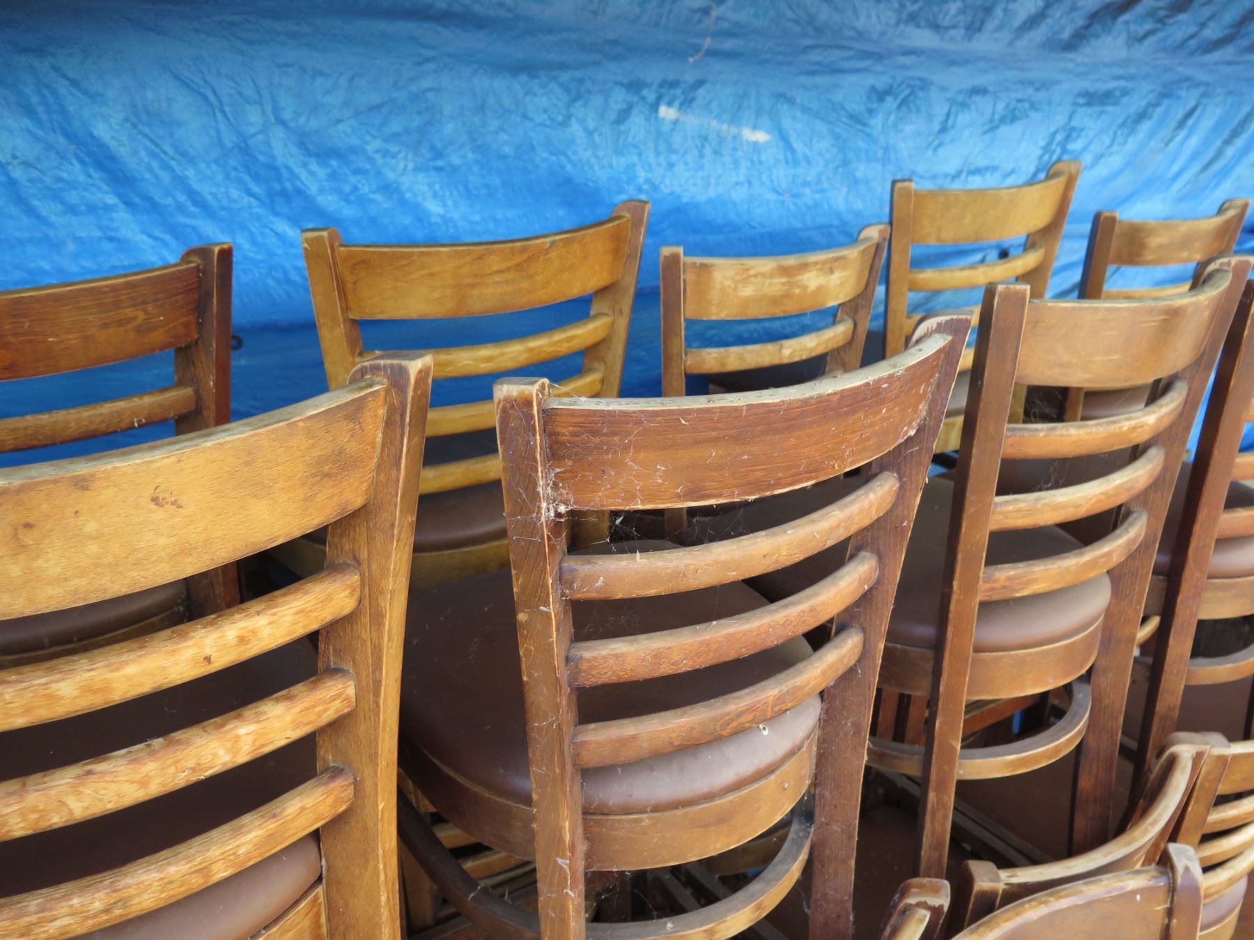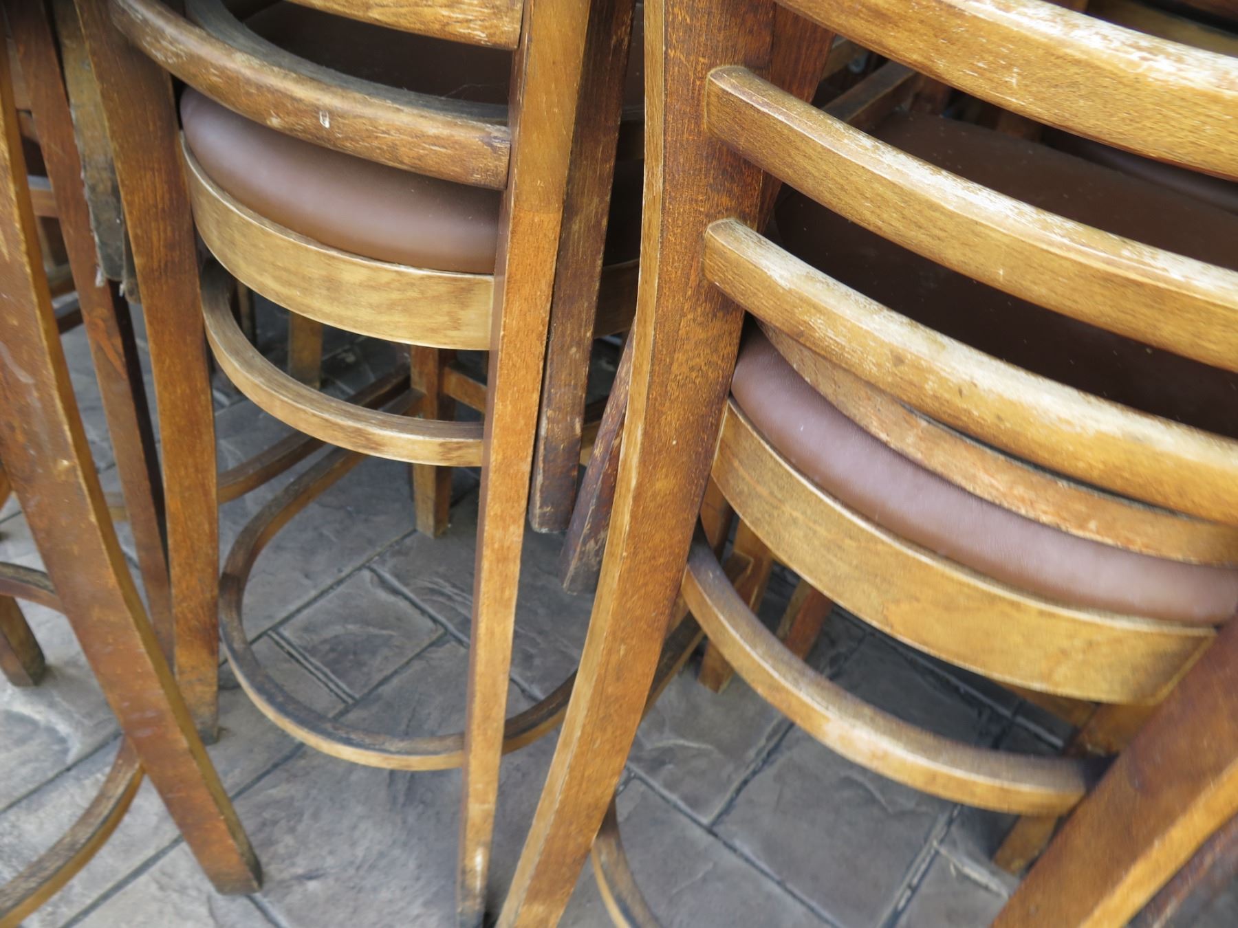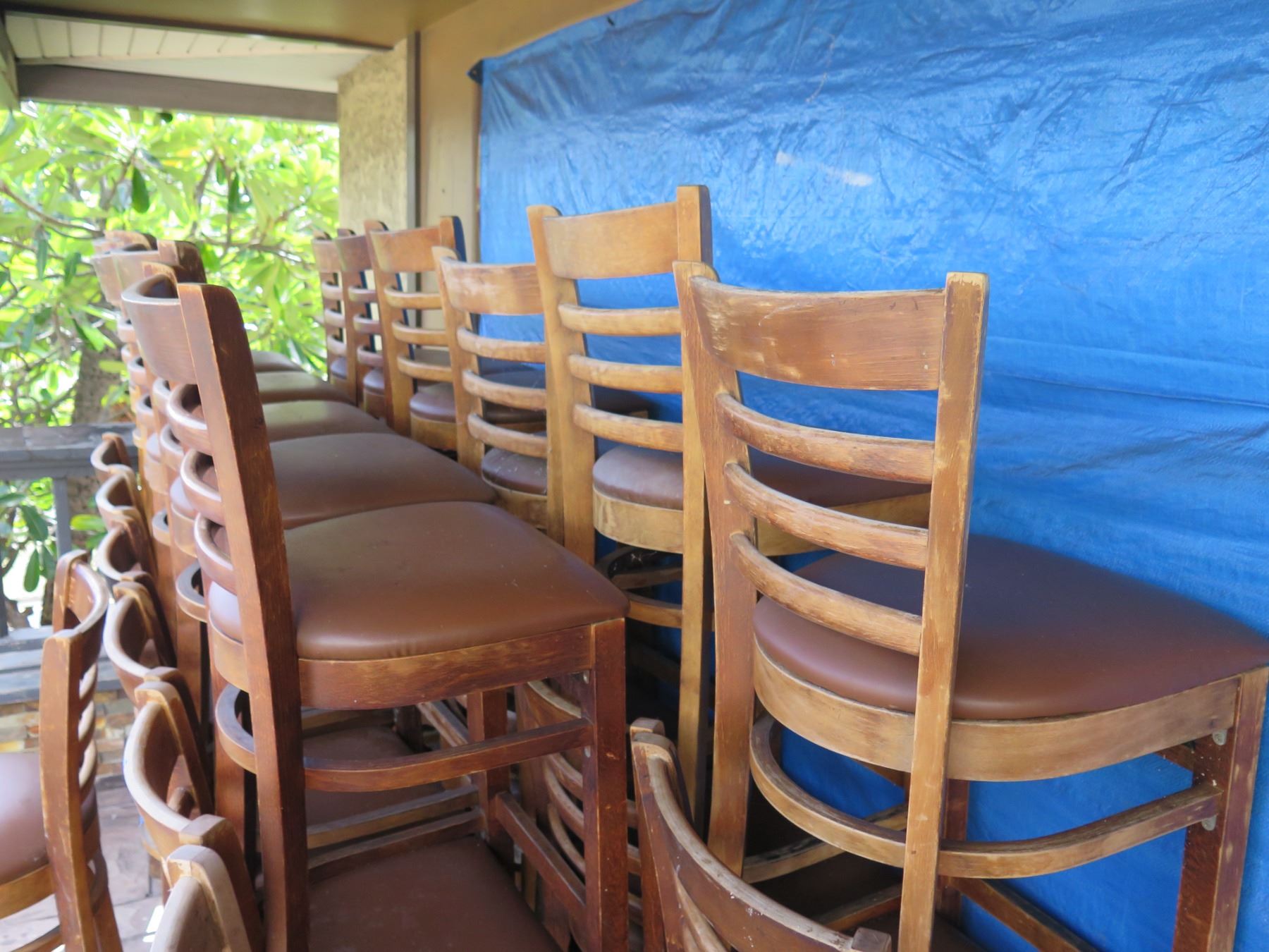 Qty 24 Wooden Stools w/ Slatted Backs & Upholstered Seats 16"x16"x44"H. Note: Wooden items have been sitting for awhile & termite droppings have been observed.