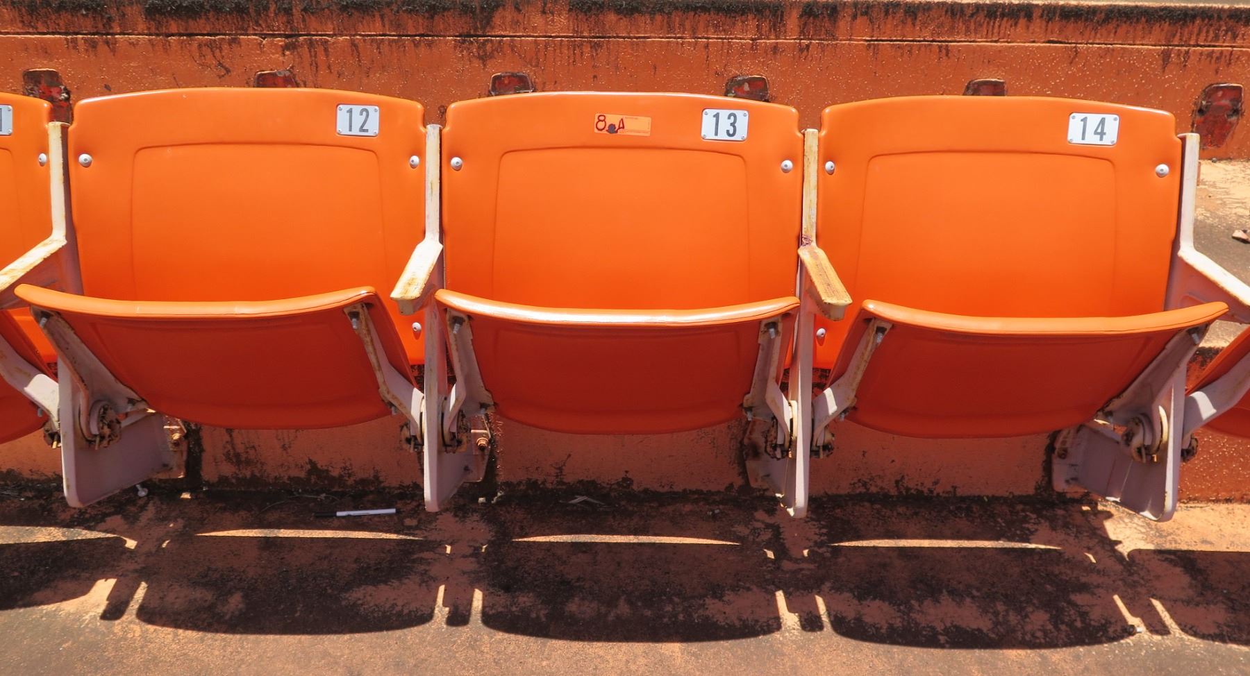 Qty 3 Aloha Stadium Seats w/ Backs & 4 Armrests, Orange, Seats 12, 13 & 14. Note: Seats have been removed for pick up