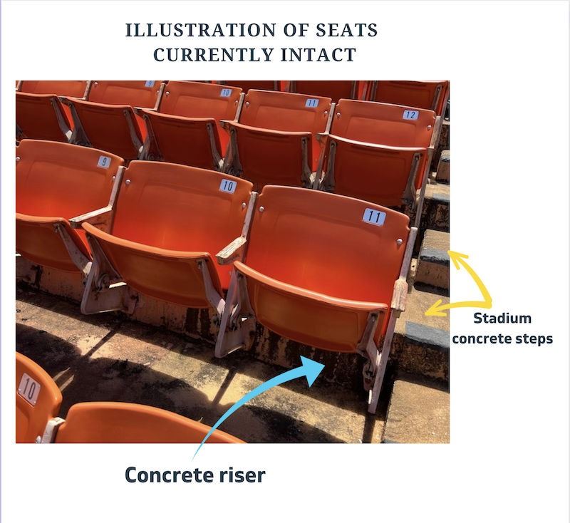 The bottom of the frames of these seats are currently mounted to a concrete riser, so that when they are removed, they are not self-supporting, meaning these cannot stand on flat ground with the existing frames and hardware that you see in the photos. Please see the last picture in this auction listing for an illustration (shown by the blue arrow).
