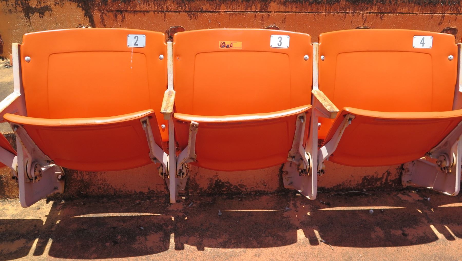 Qty 3 Aloha Stadium Seats w/ Backs & 4 Armrests, Orange, Seats 2, 3 & 4. Note: Seats have been removed for pick up