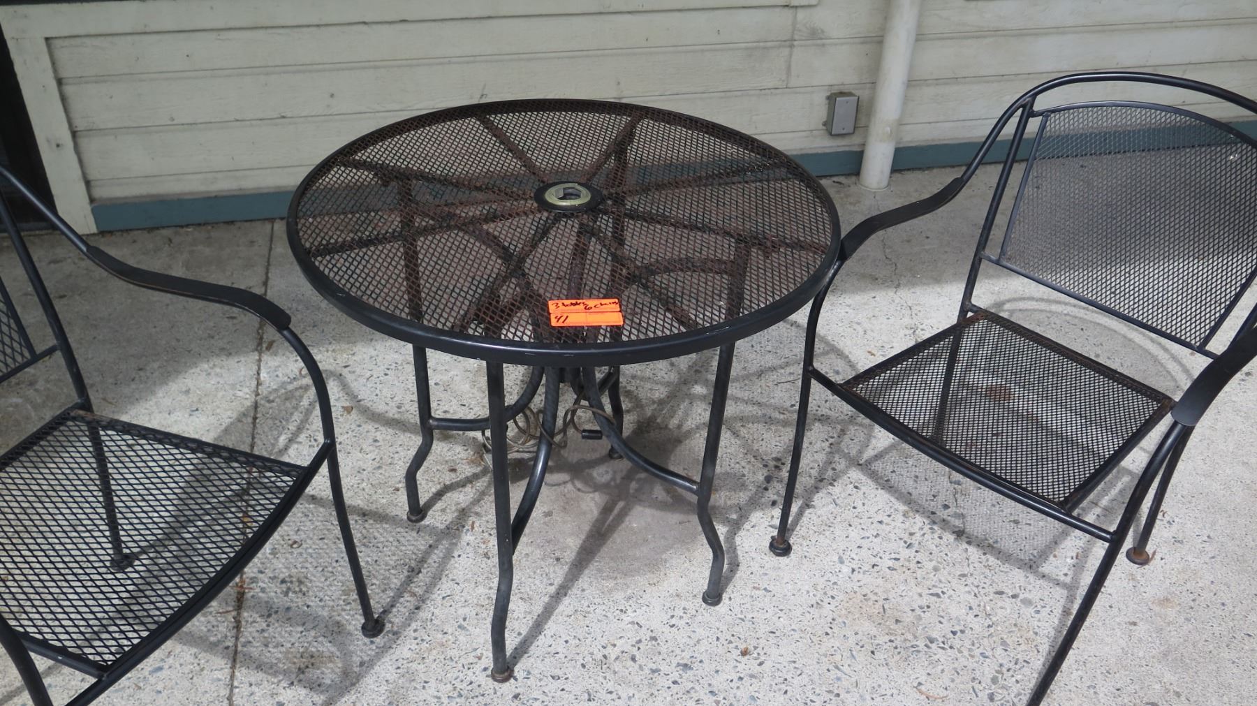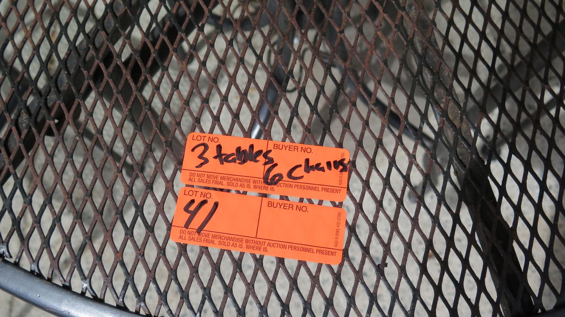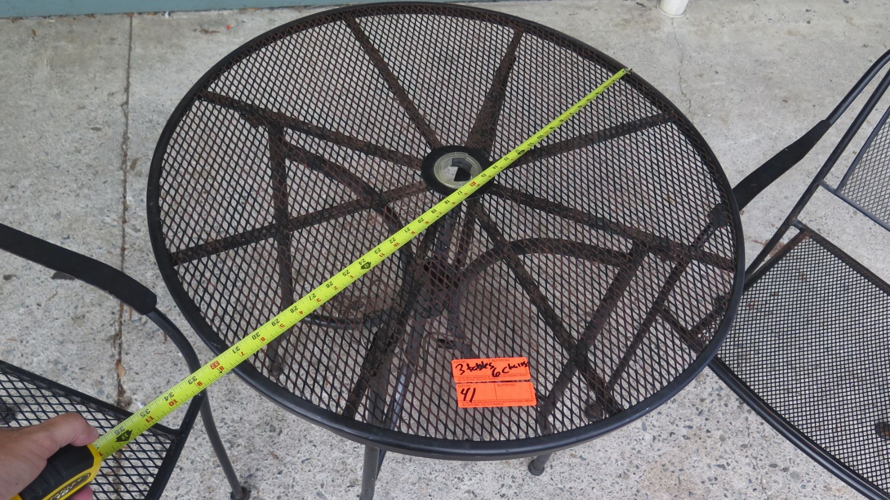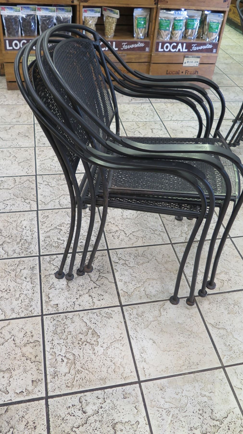 Qty 3 Black Wrought Iron 30" Outdoor Tables & 6 Matching Chairs. FOOD PRODUCTS AND MERCHANDISE IN THE PICTURES ARE NOT INCLUDED.