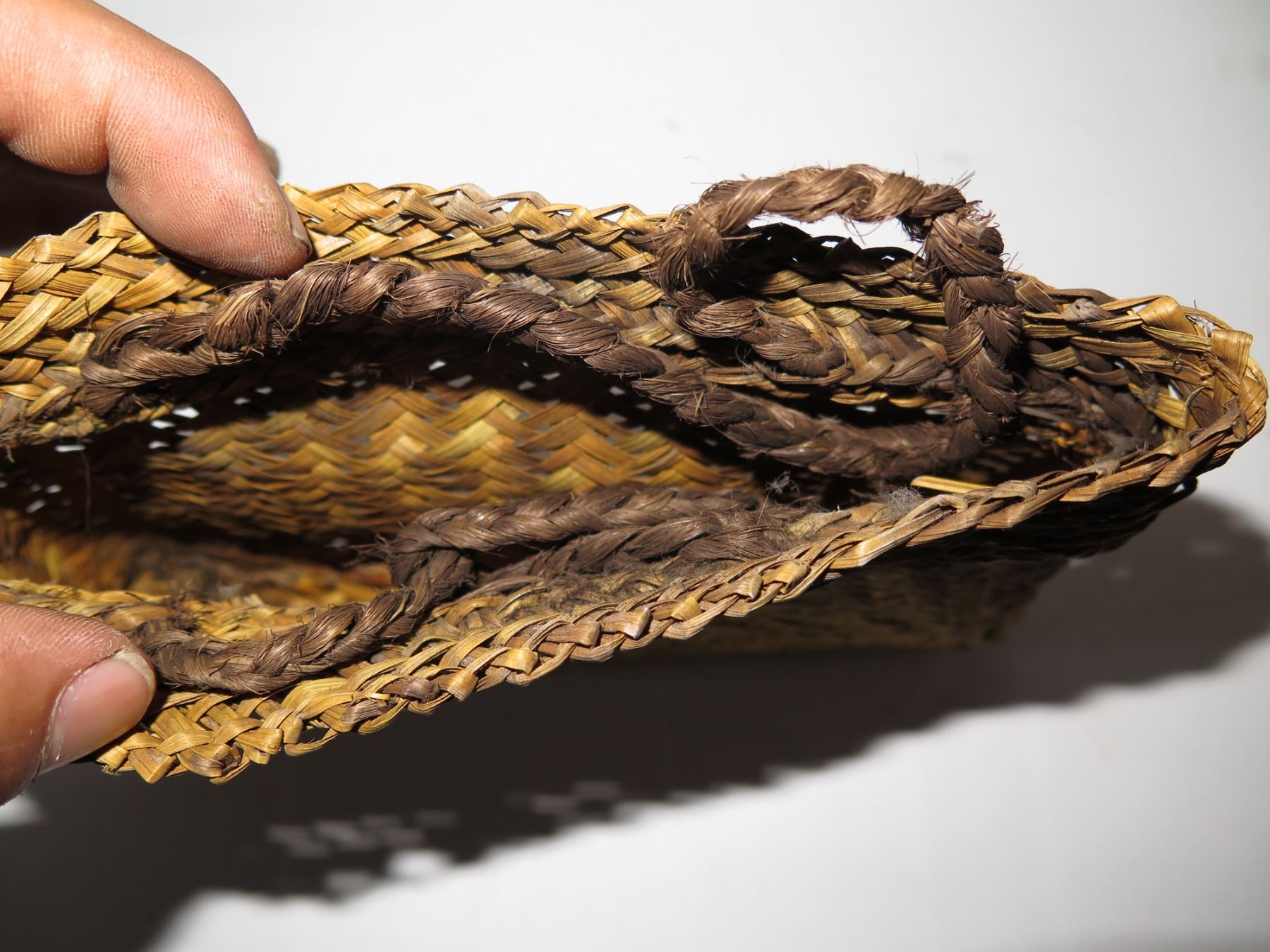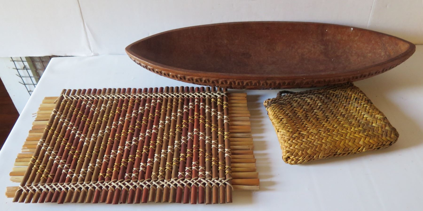 Qty 3 Carved Wooden Bowl, Woven Bamboo Trivet & Fiber Woven Bag