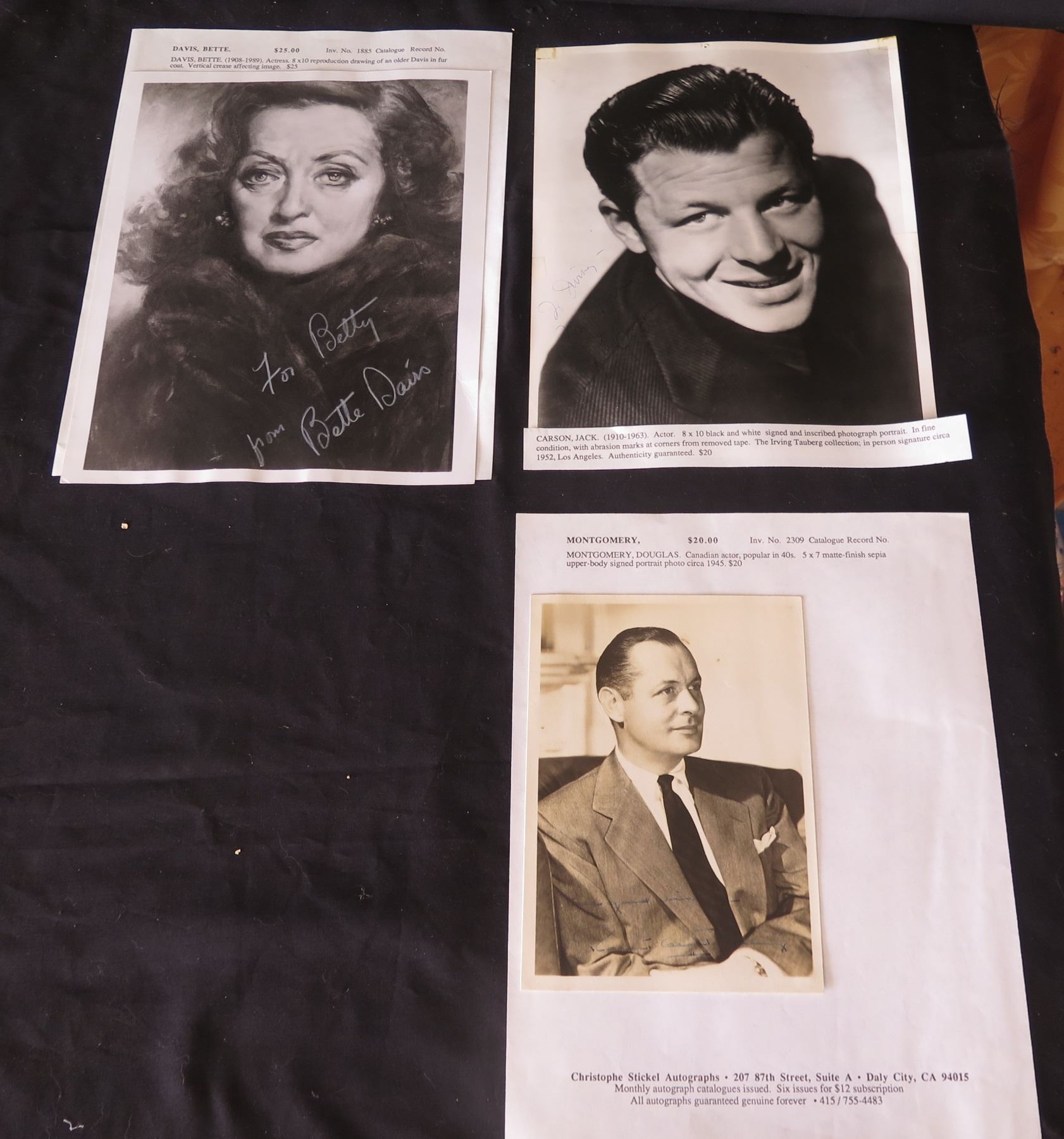 Qty 3 Celebrity Photos: Bette Davis, Jack Carson & Douglas Montgomery, Some Signed