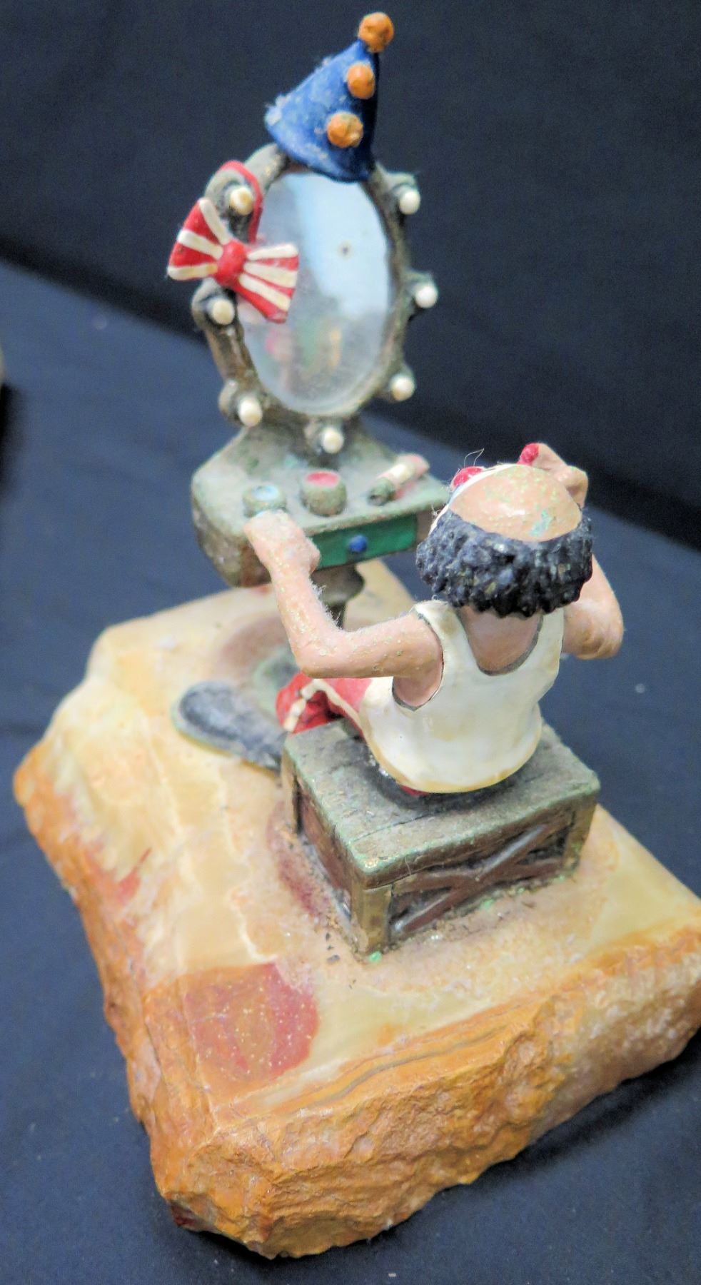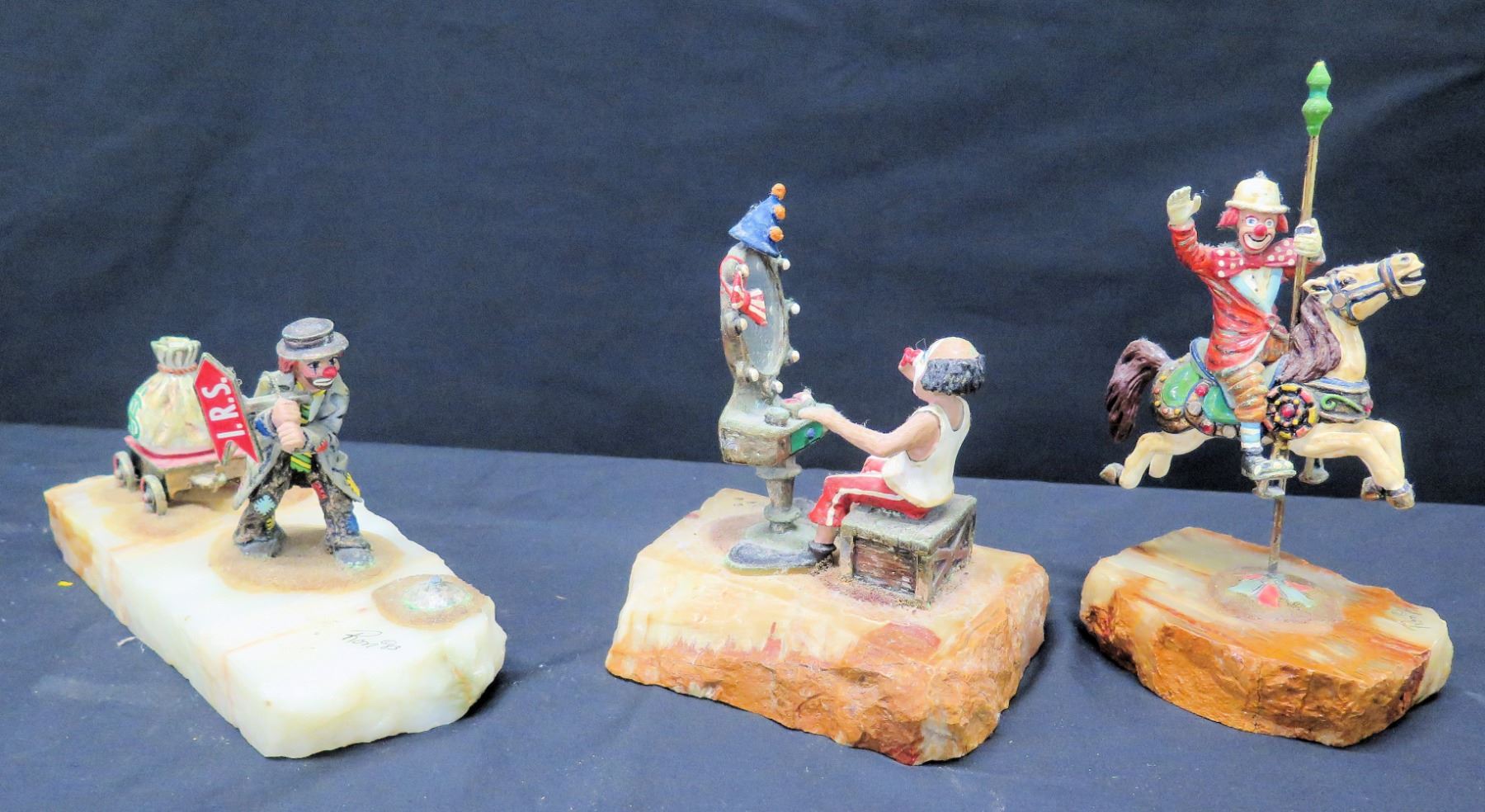 Qty 3 Clown Figurines on Natural Stone Bases, Signed by Artist Ron Lee