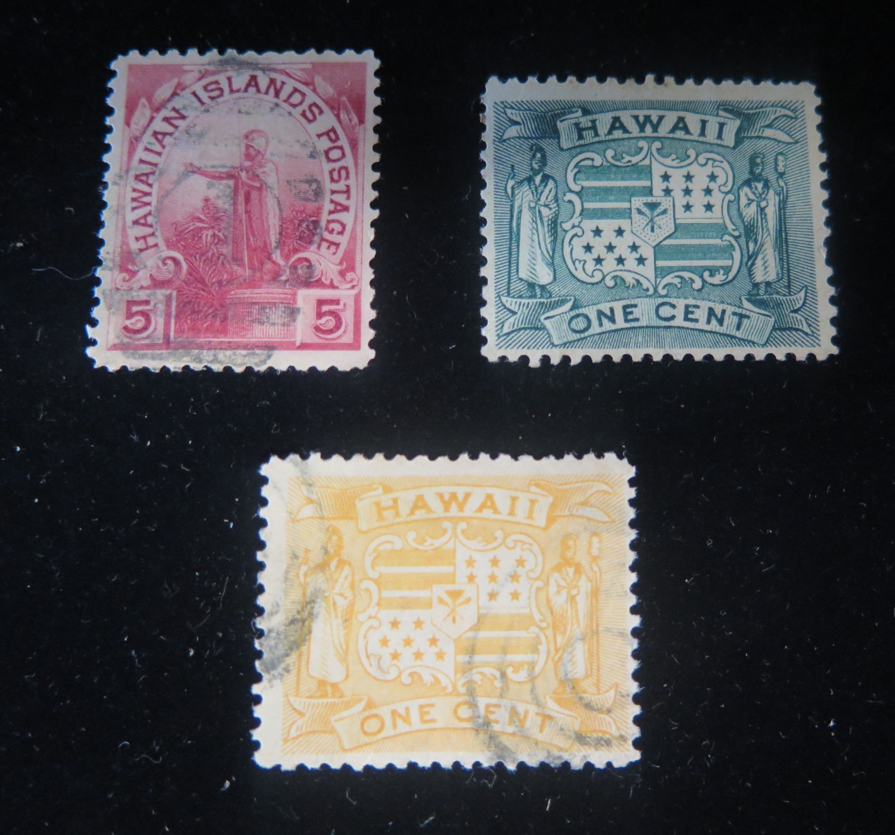 Qty 3 Collectible Hawaii Stamps: Hawaiian Islands Postage & 2 Crest w/ Warriors One Cent