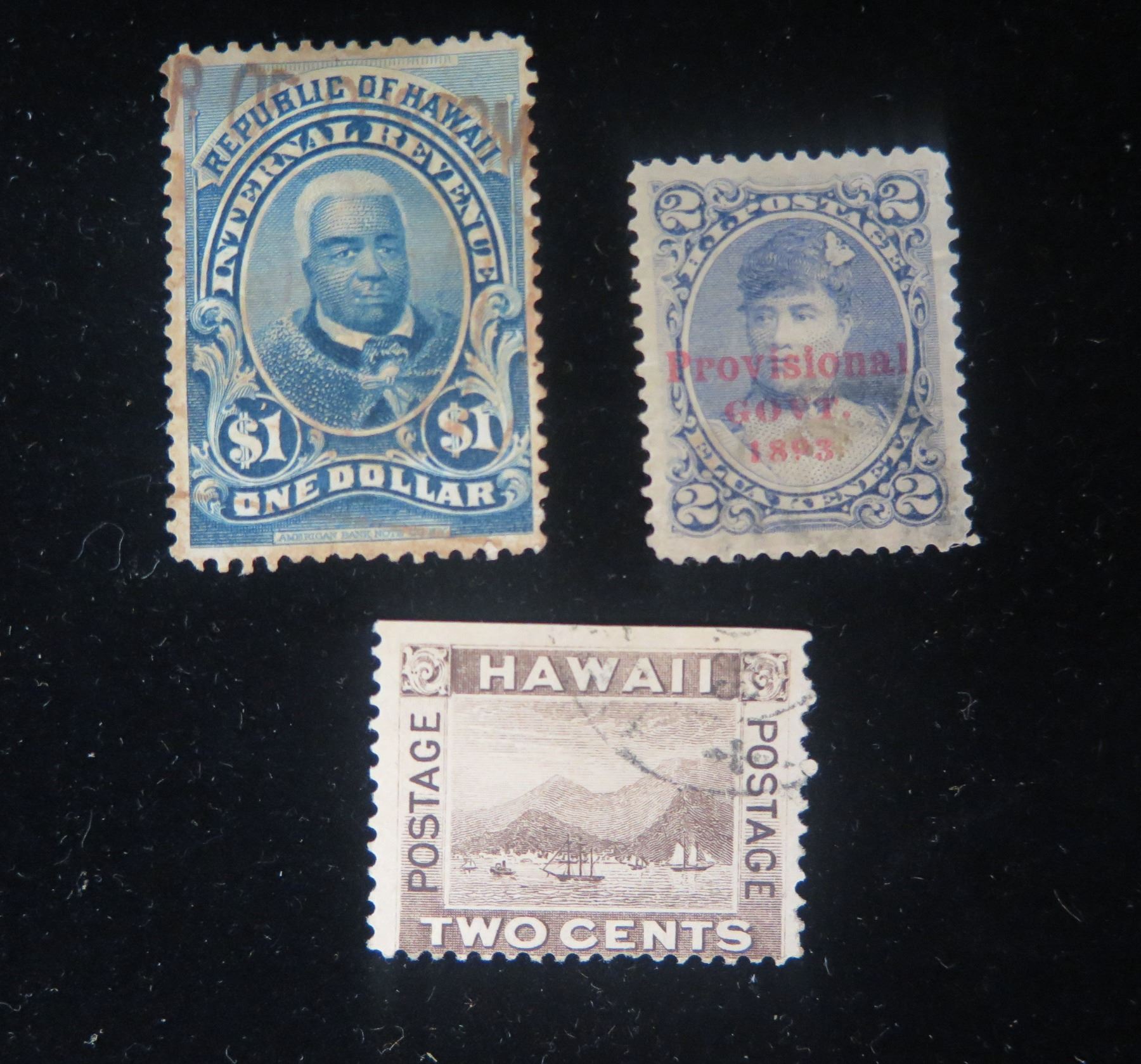 Qty 3 Collectible Hawaii Stamps: Republic Internal Revenue, Elua Keneta Stamped Provisional Govt. 1893 & Sailing Scene