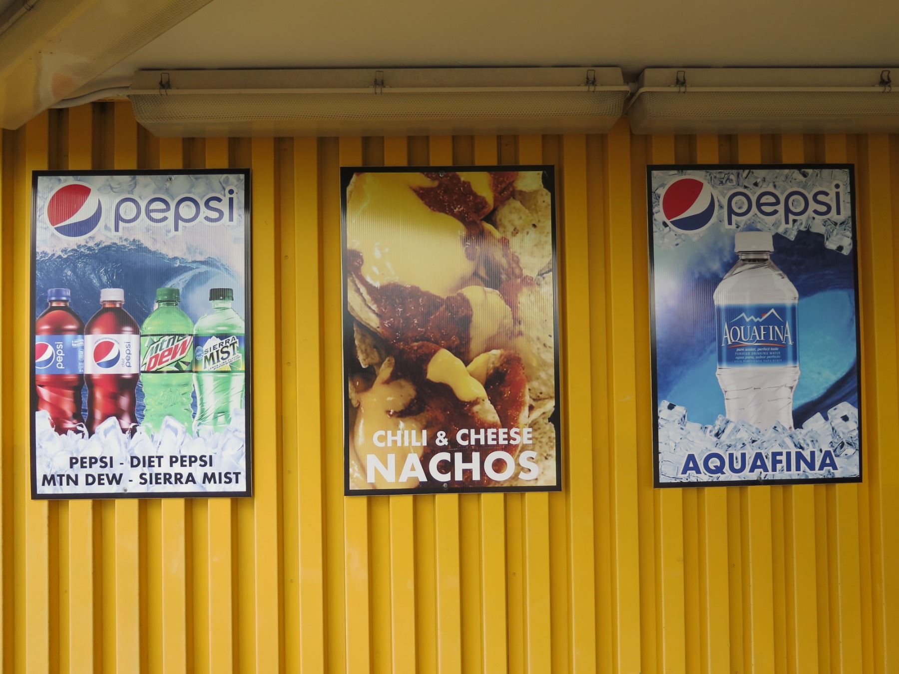 Qty 3 Concession Signs: Pepsi, Nachos, Aquafina 24"x36". Note: Signs will be removed if hanging prior to pick up