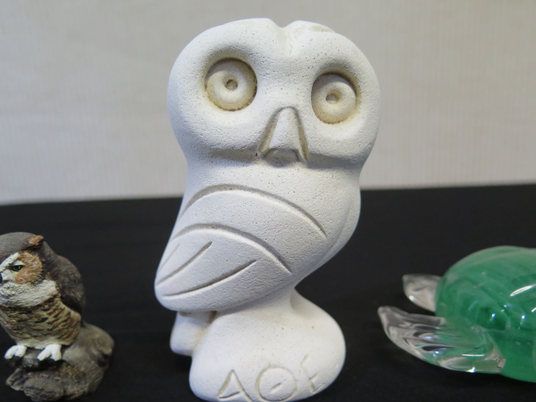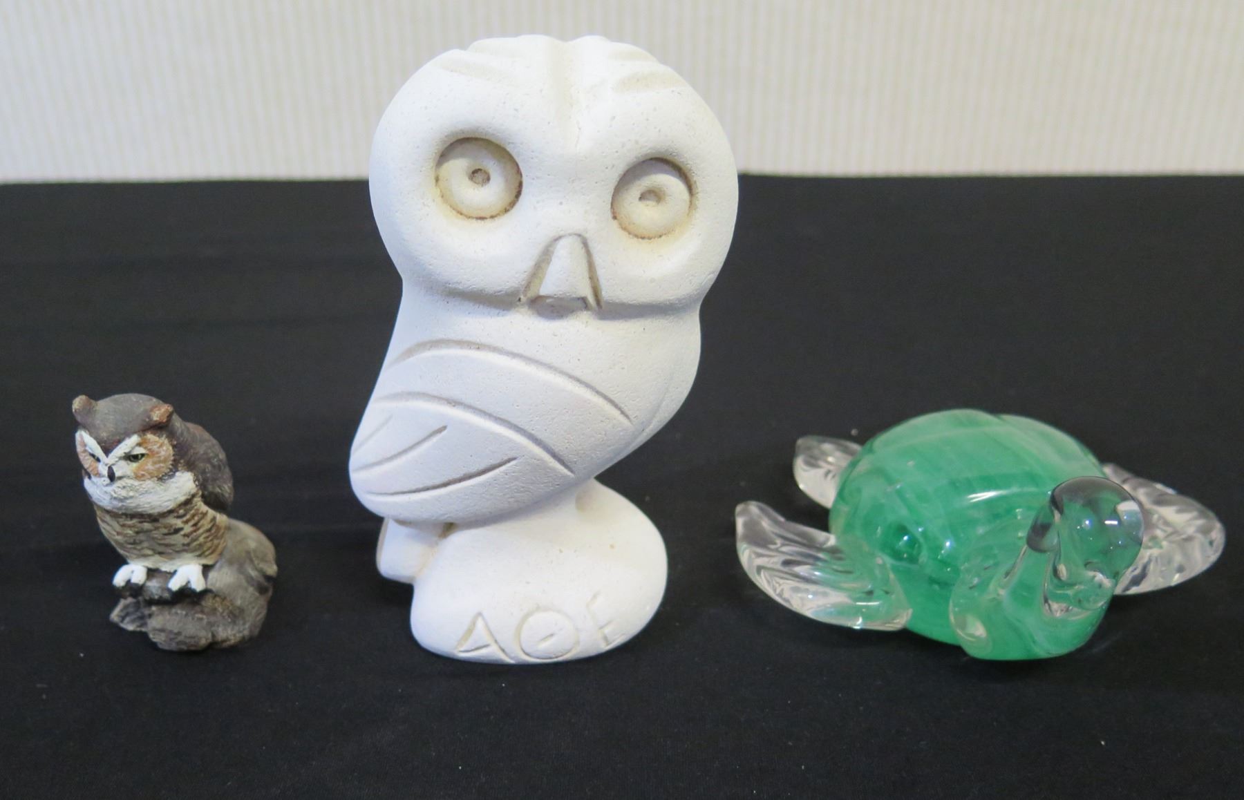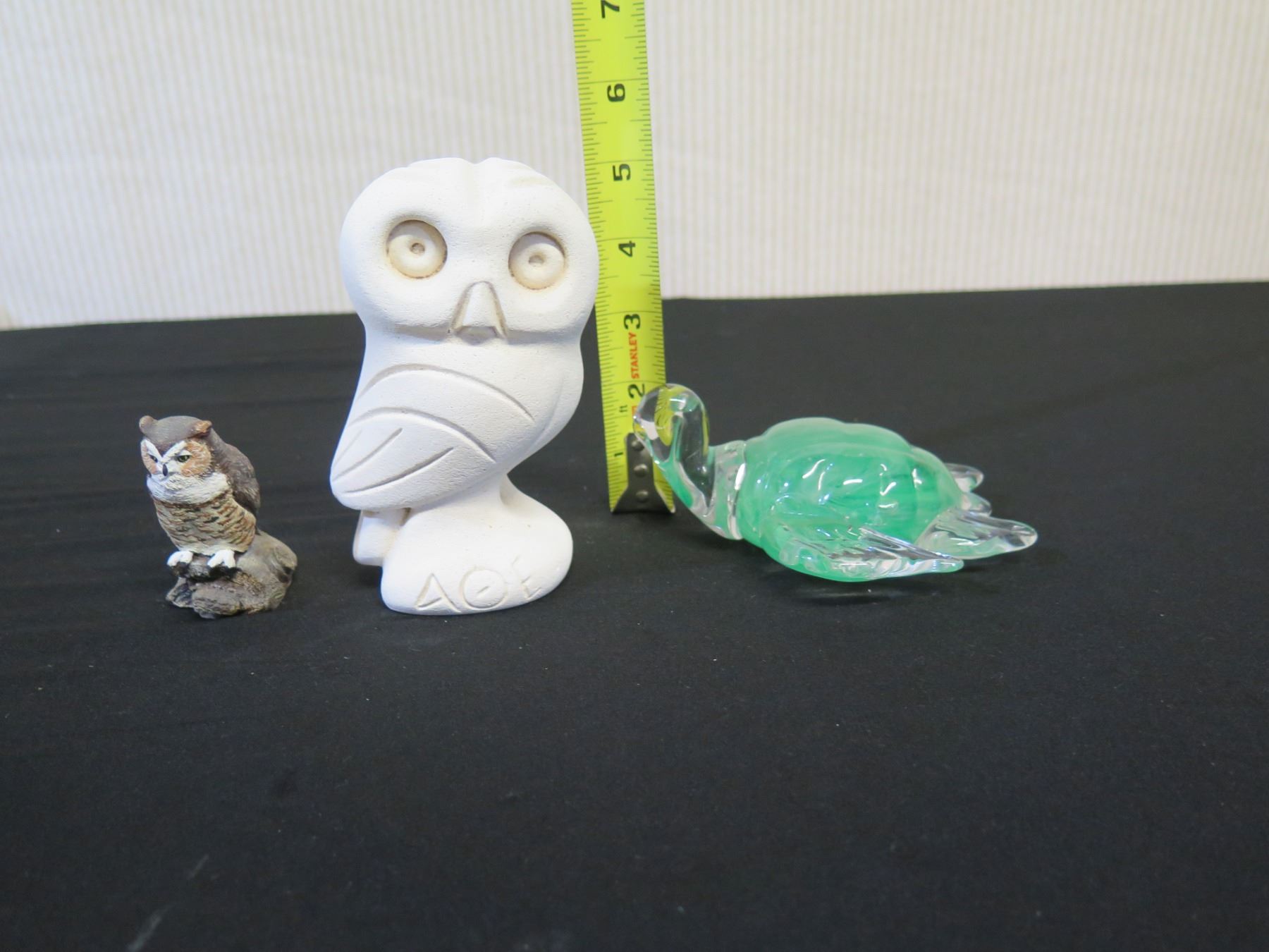 Qty 3 Figurines: 2 Owls & Turtle, Misc Sizes