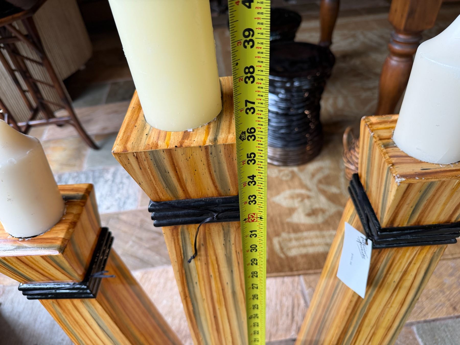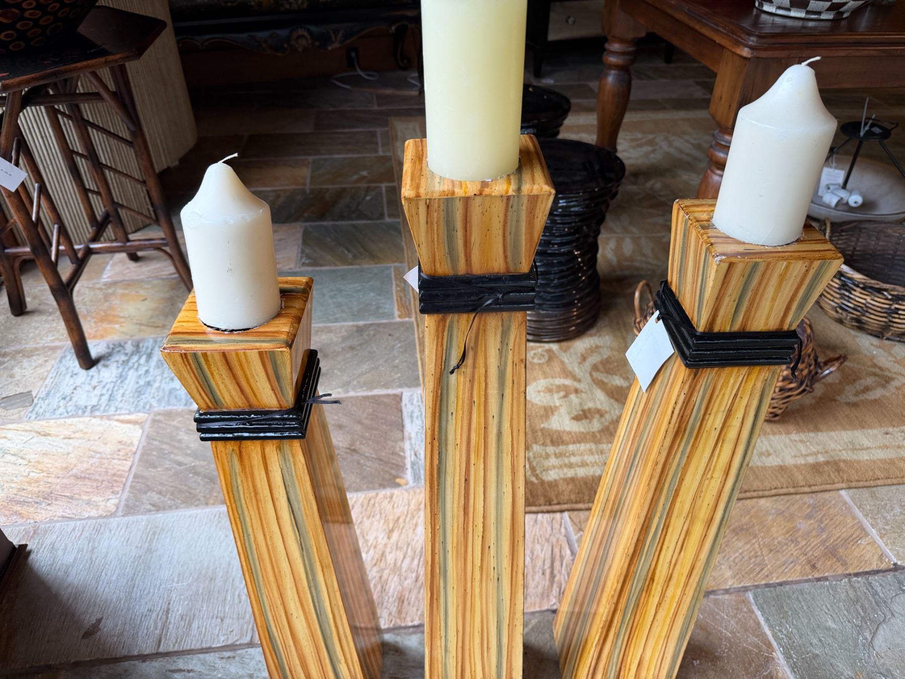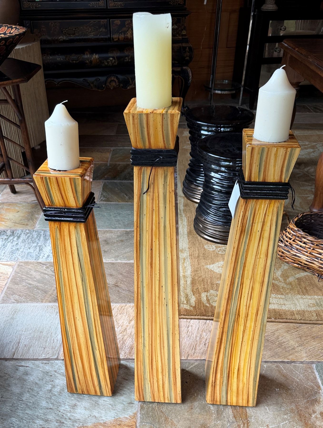 Qty 3 Floor Pillar Candle Holders w/ Striped Design & 3 White Candles, Misc Sizes