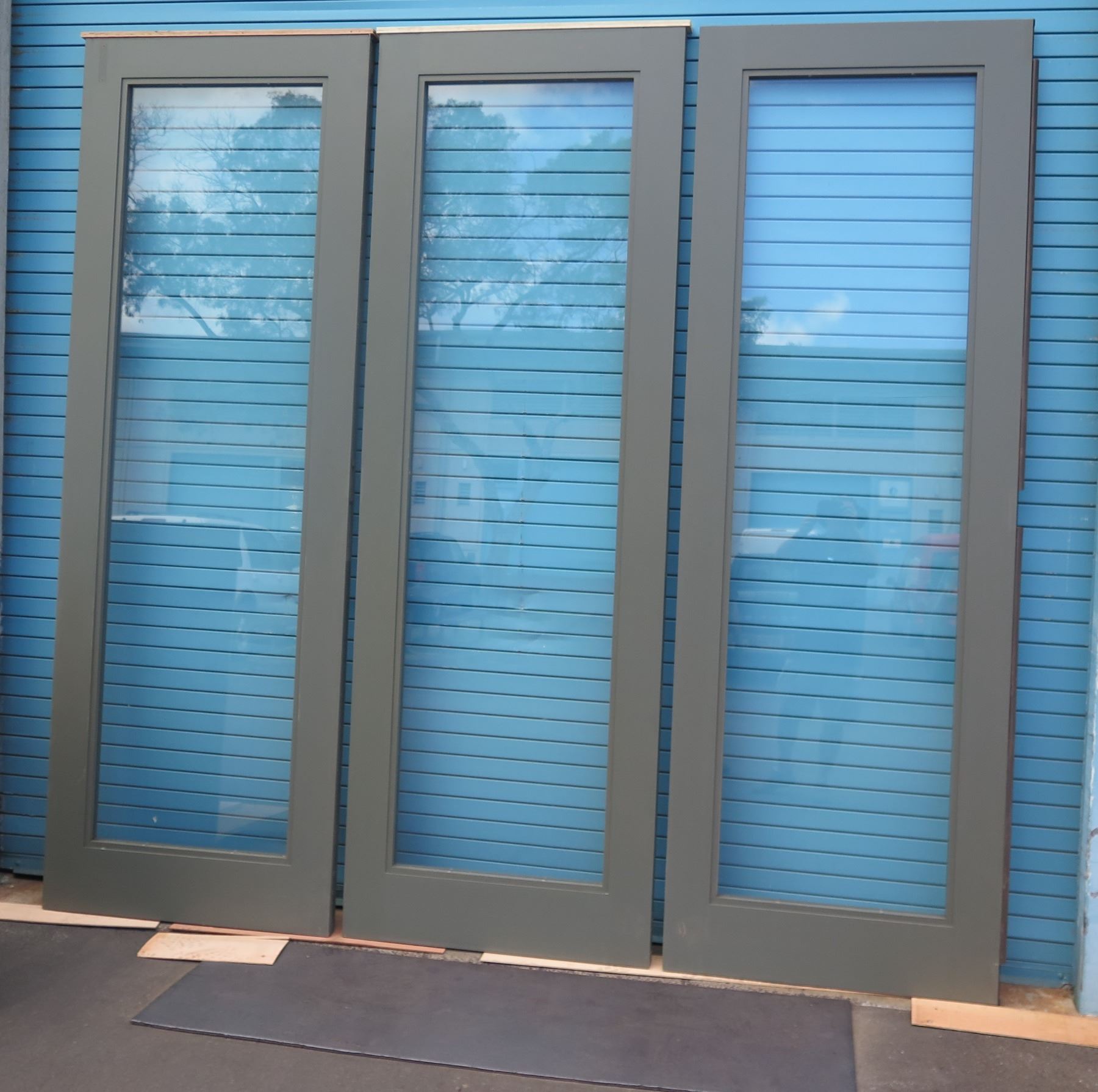Qty 3 Folding Doors w/ Custom-Carved Inset Panel. Hardware is not inclued. Each panel is 36-9/16” x 107-7/16” x 2-1/4”. Glass is ¼” thick clear laminated. 3 panels total. Doors have a professional high quality painted interior and exterior finish. Retail value = $12,000.00 total. Custom carved inset panels included. Hardware for this door is available for purchase from the seller.