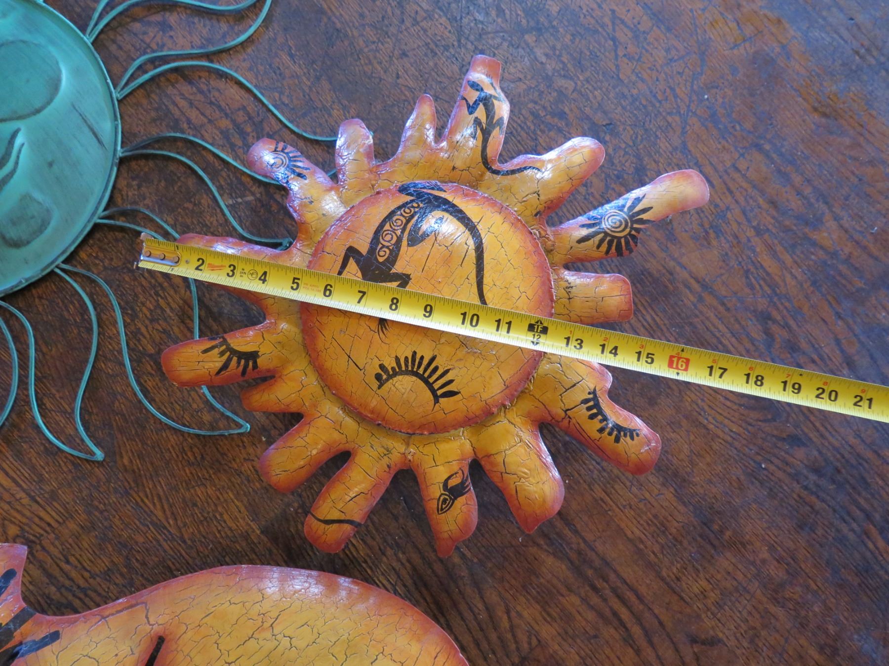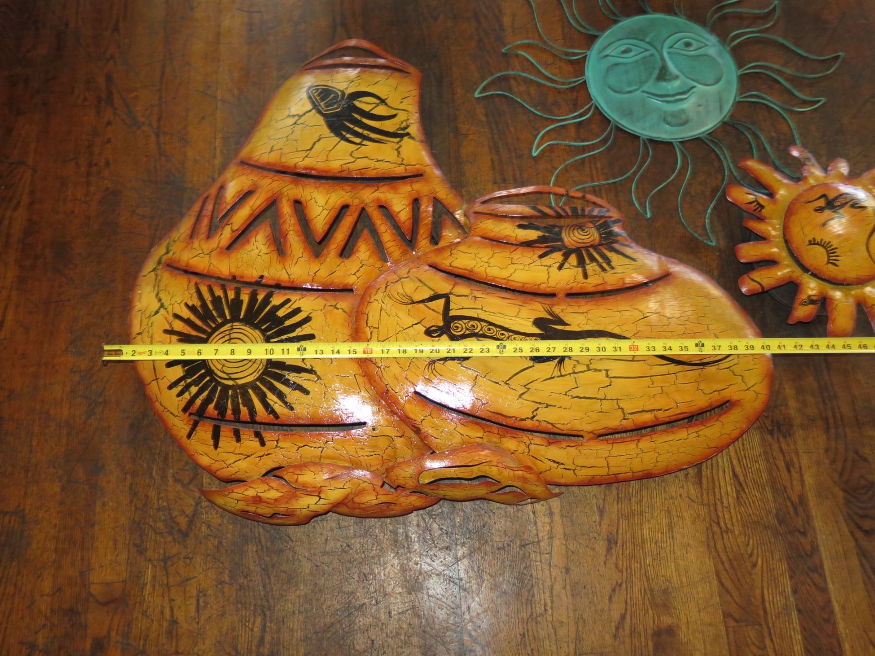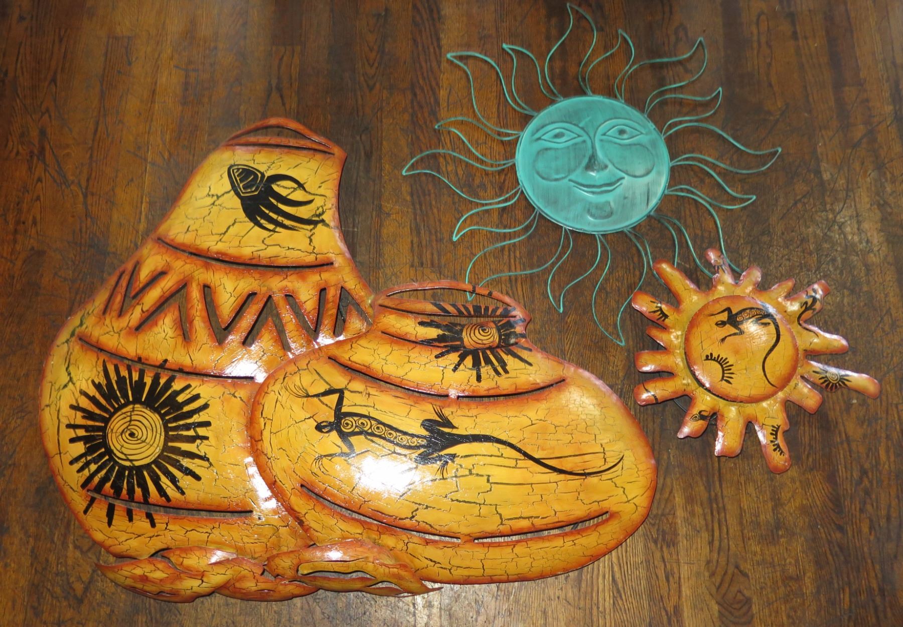 Qty 3 Lightweight Metal Mexican Wall Hangings: Sunshine & Gecko Jars, Misc Sizes