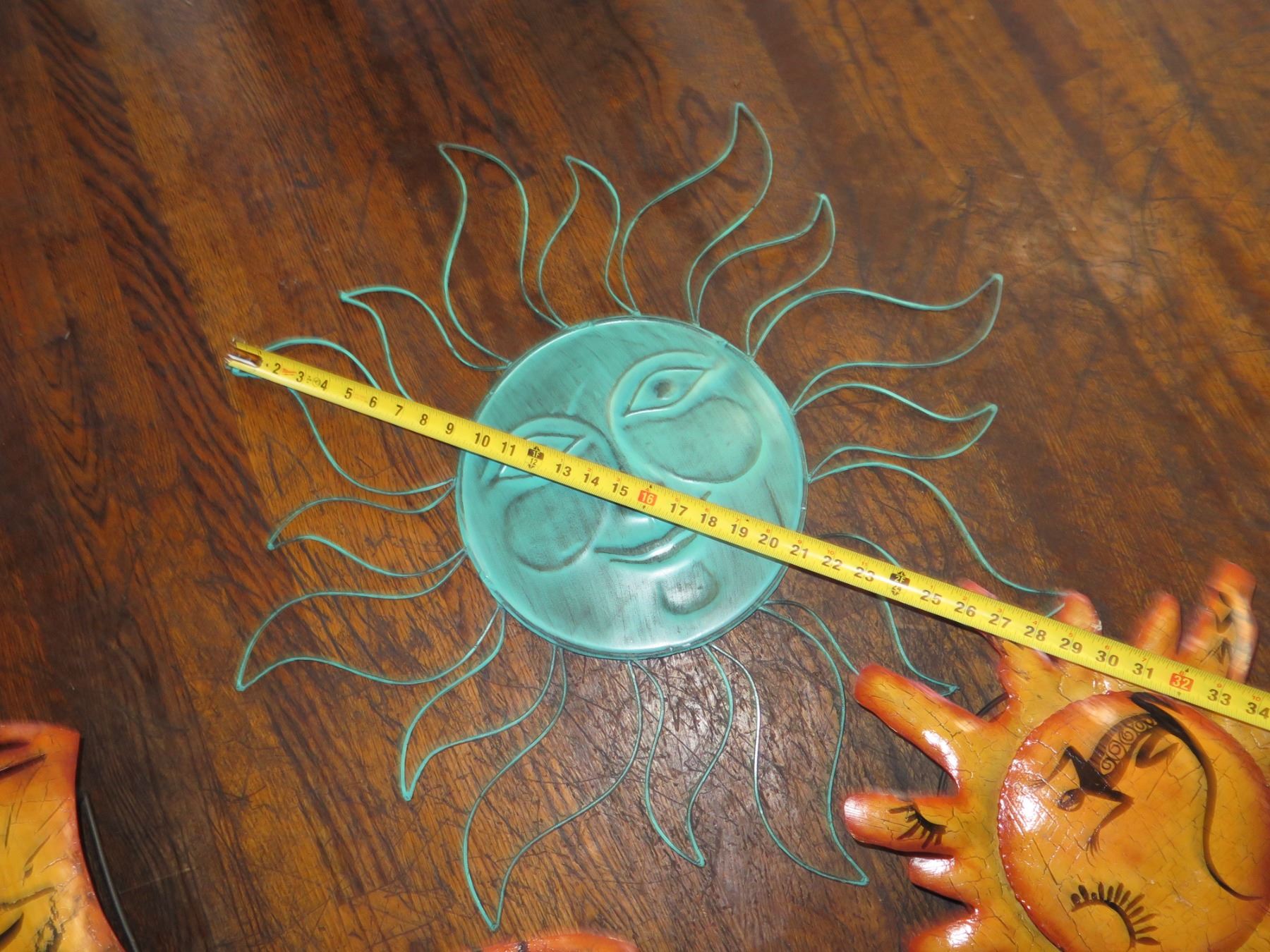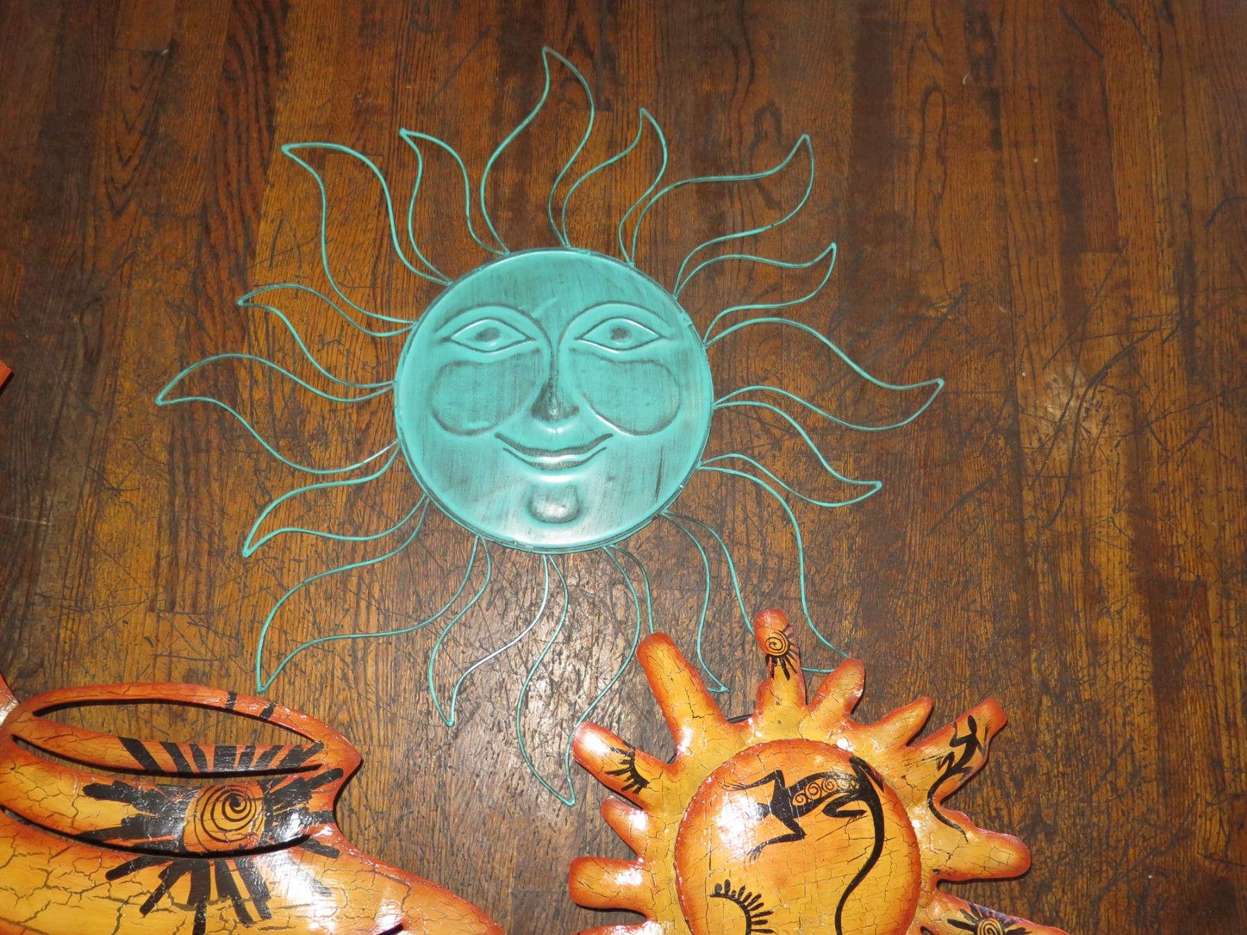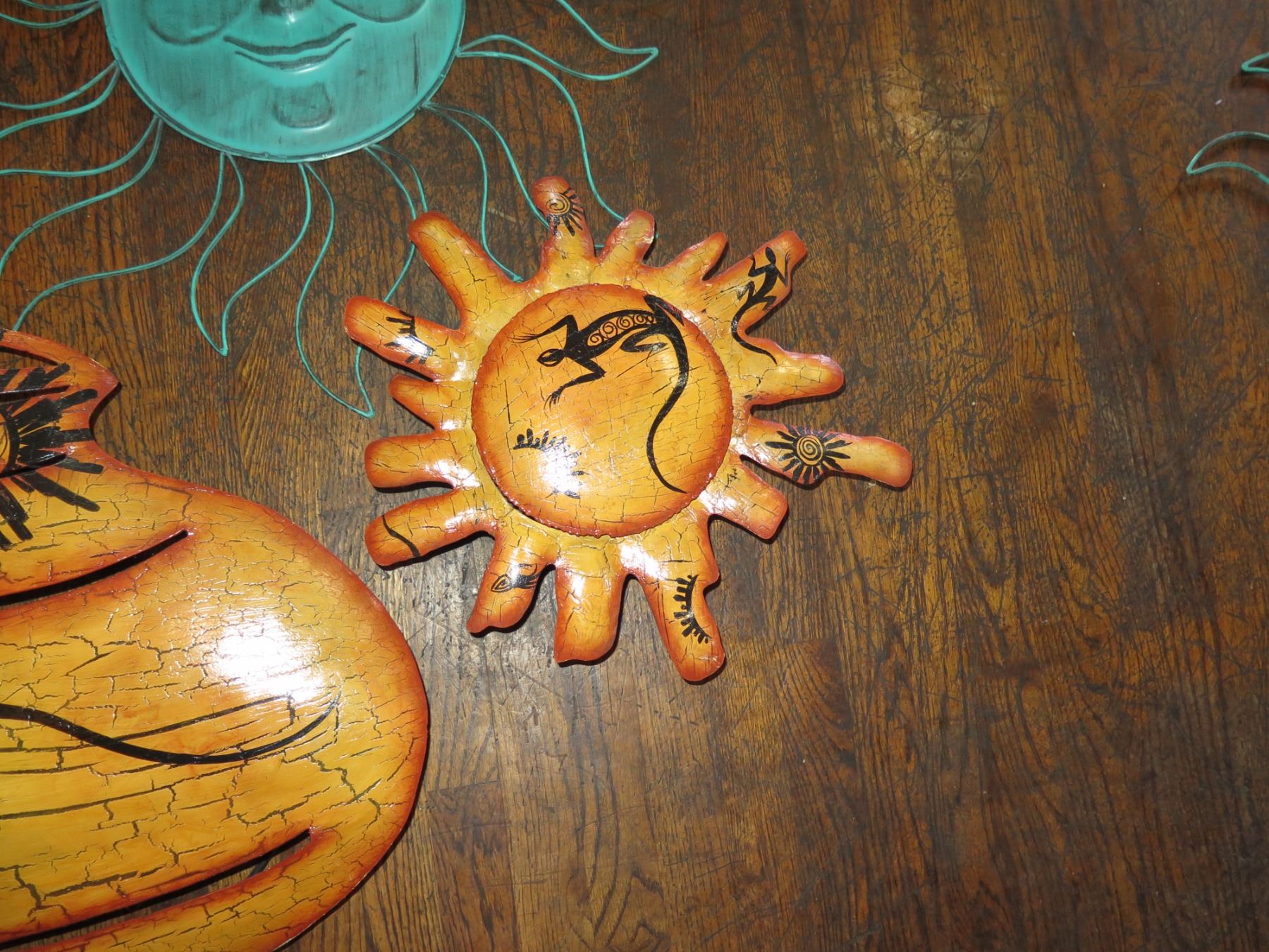 Qty 3 Lightweight Metal Mexican Wall Hangings: Sunshine & Gecko Jars, Misc Sizes