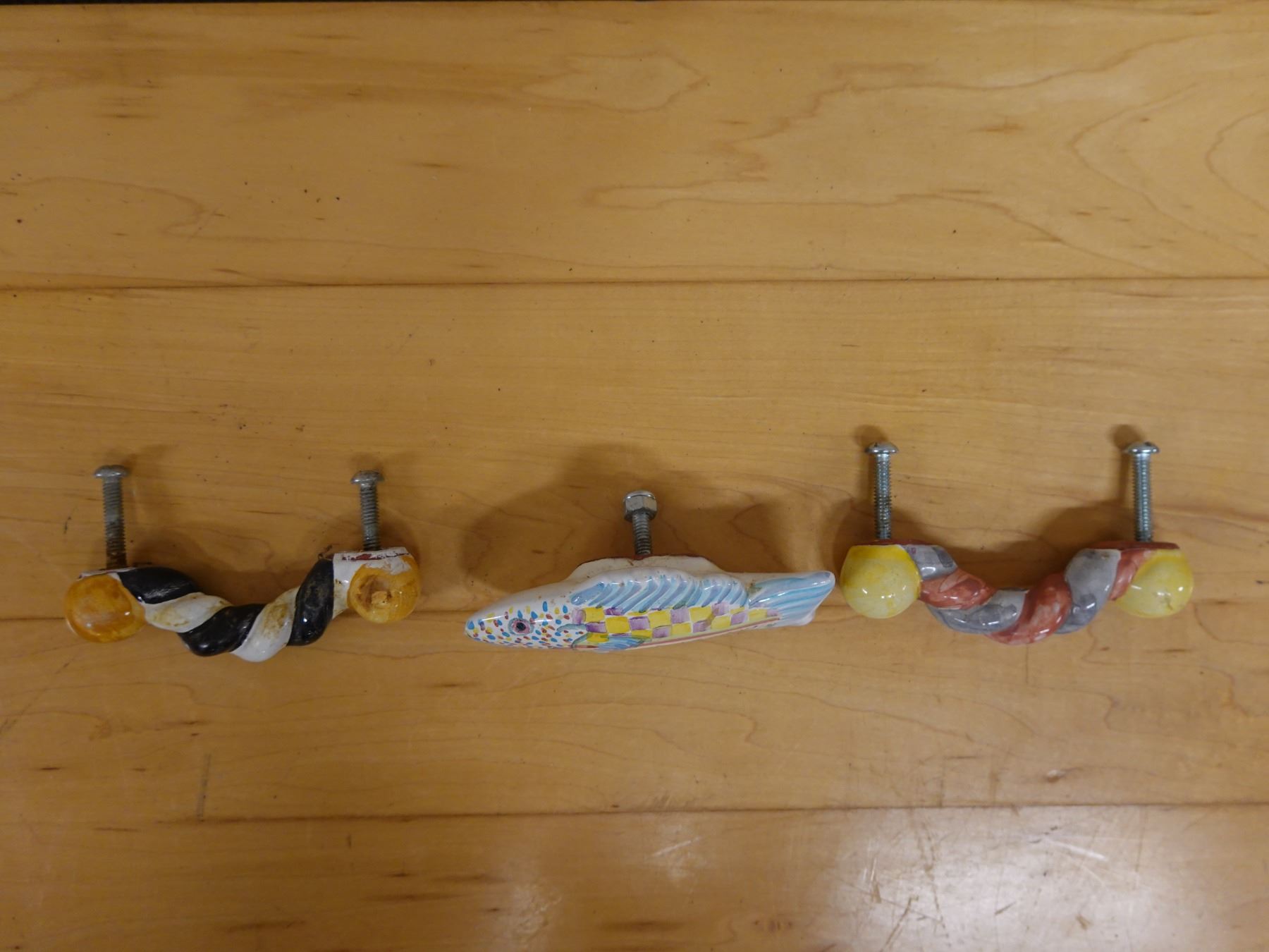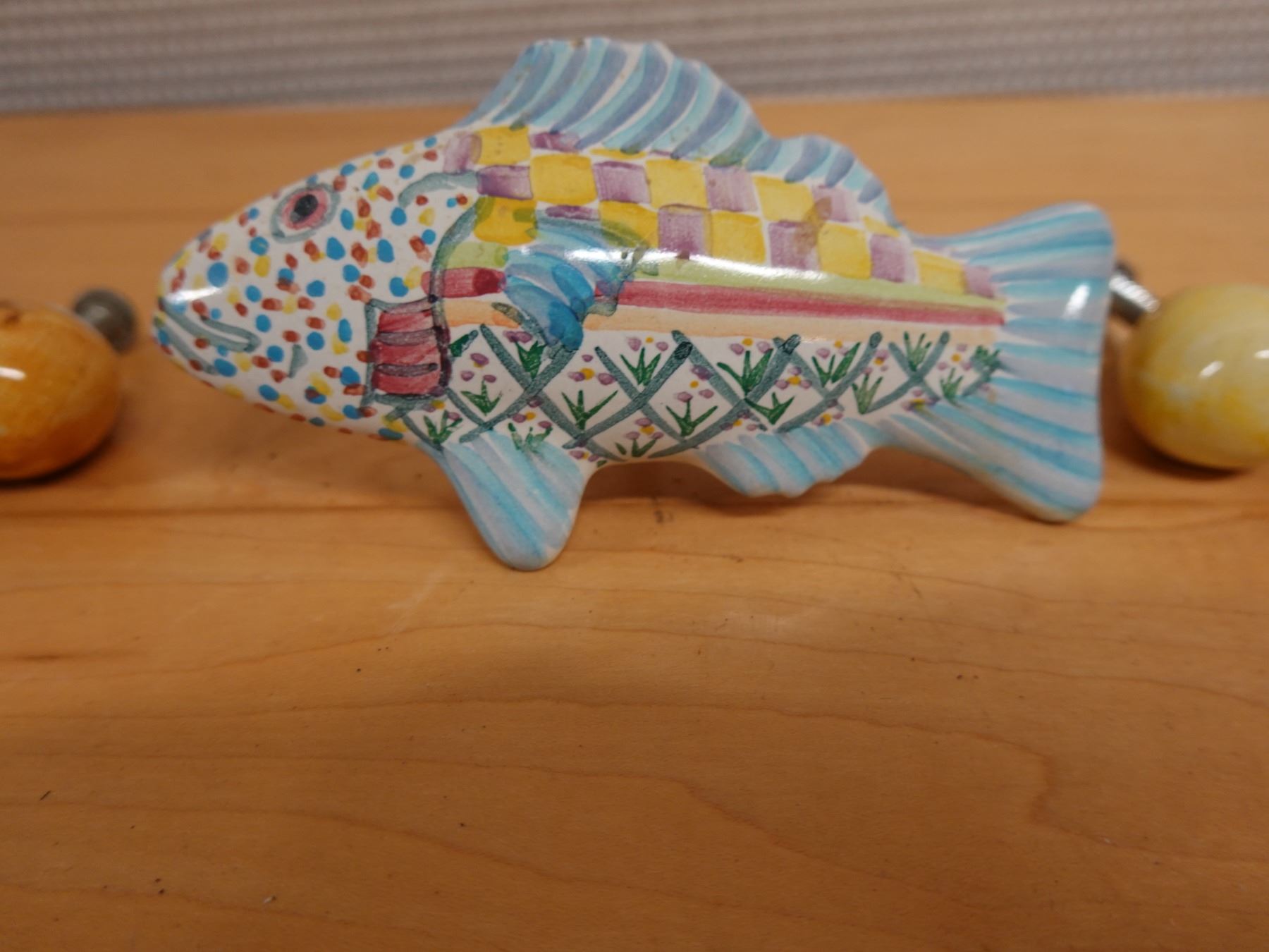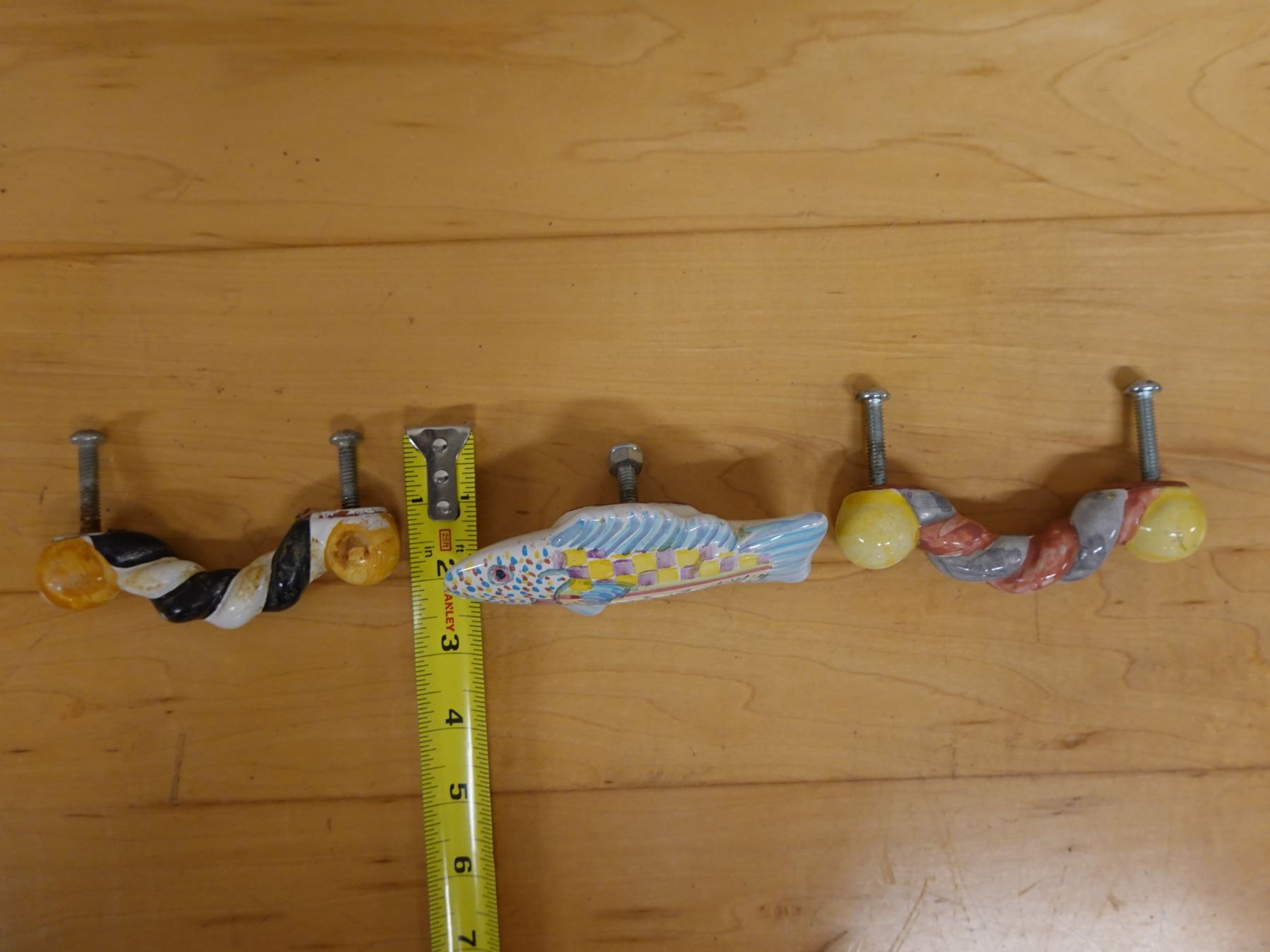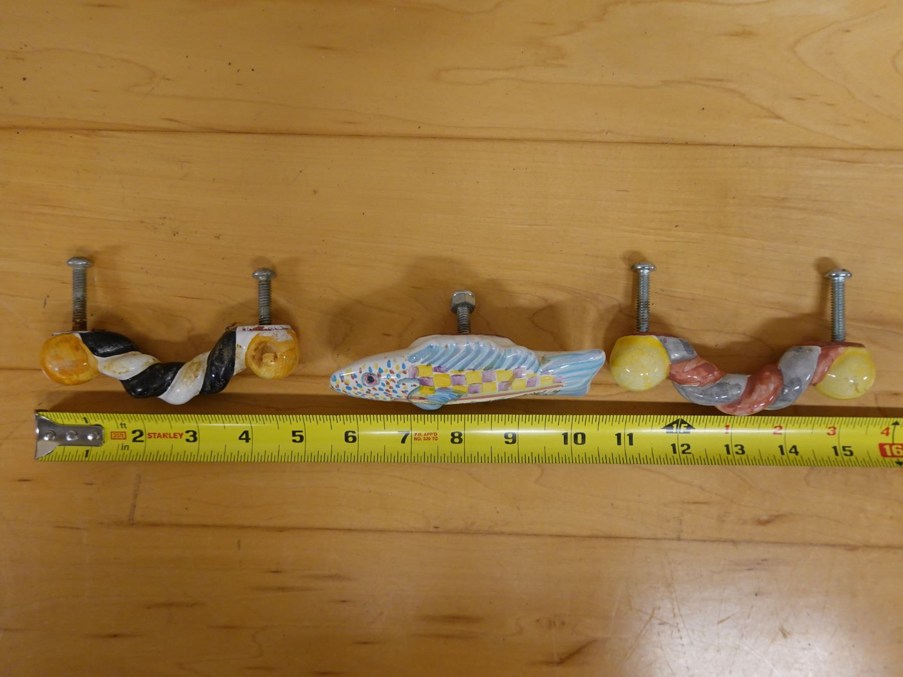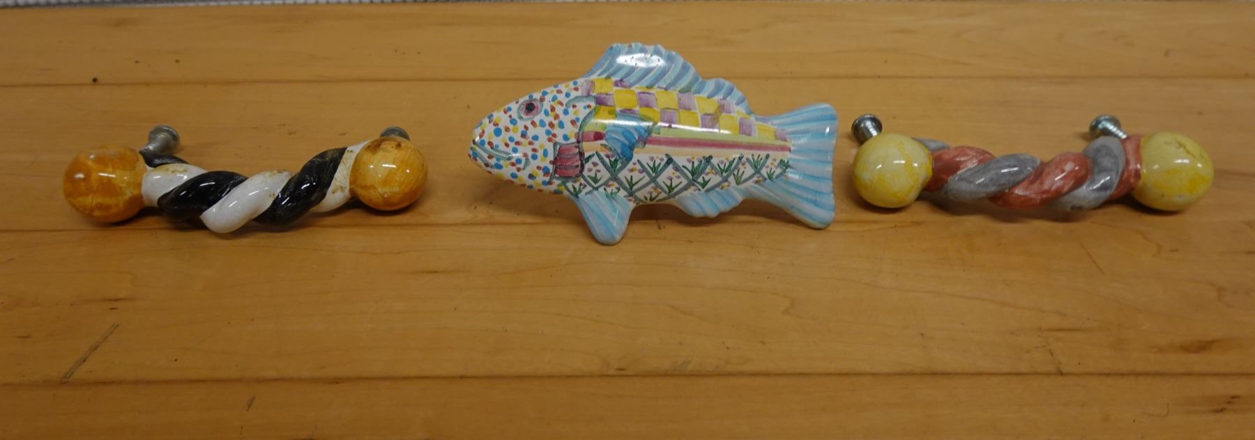 Qty 3 Mackenzie Childs Ceramic Cabinet Pulls: 2 Ropes & 1 Fish, Misc Sizes