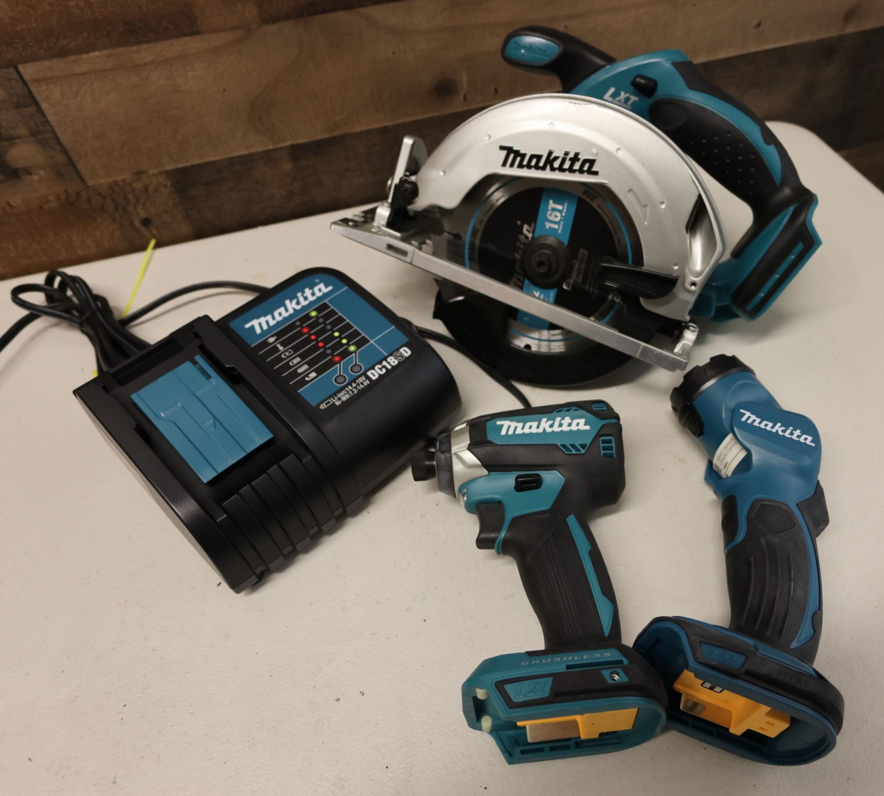 Qty 3 Makita Power Tools & 1 Charger: XTD13 Impact Driver, DML825 Flashlight & XSS02 Circular Saw
