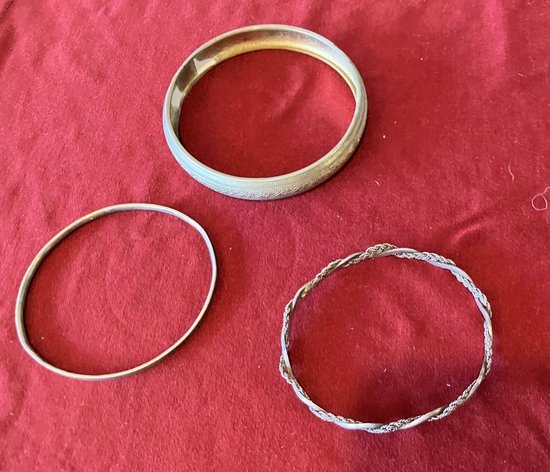 Seller reports the thin bangles are sterling. The large bangle is vintage