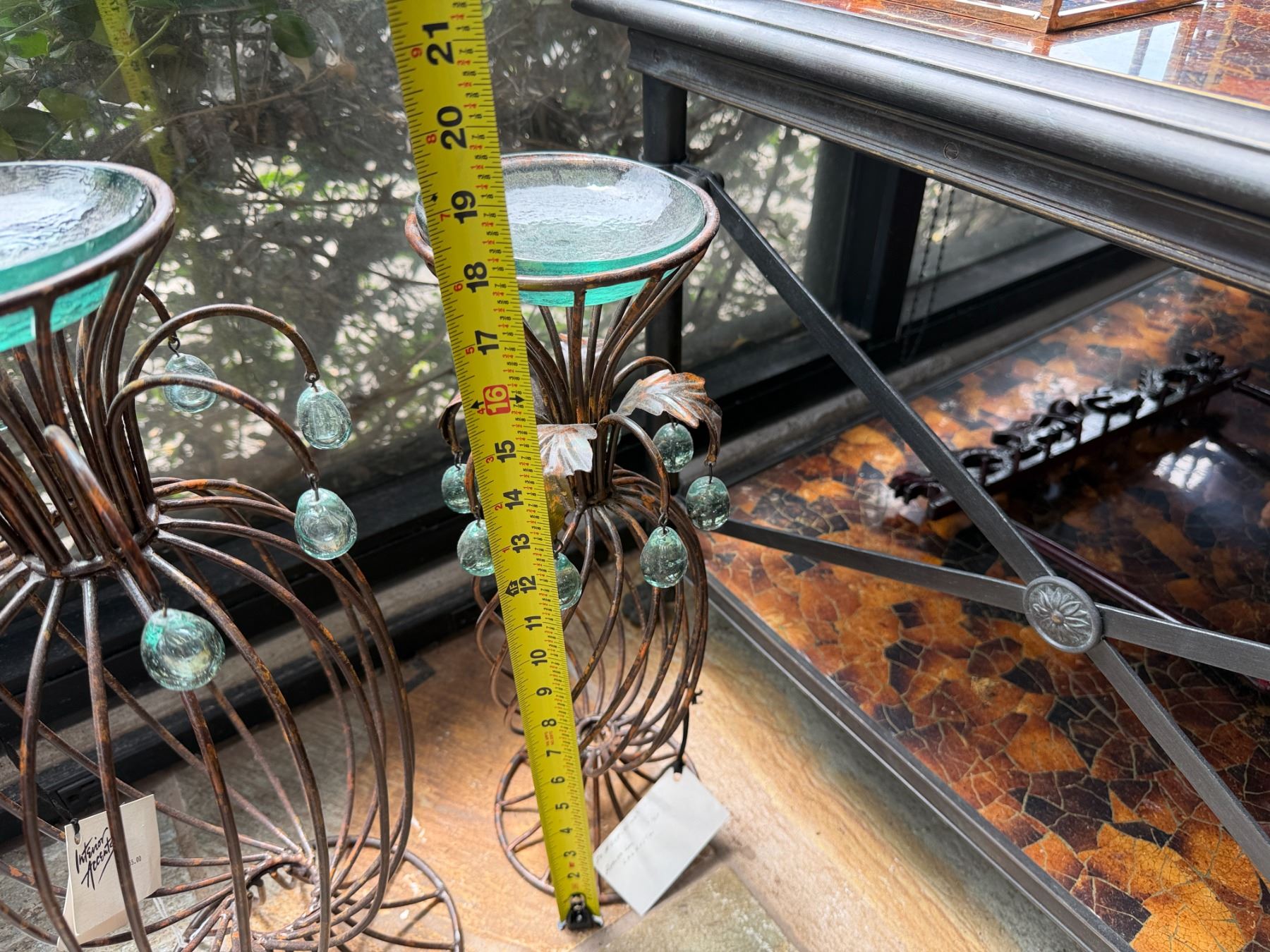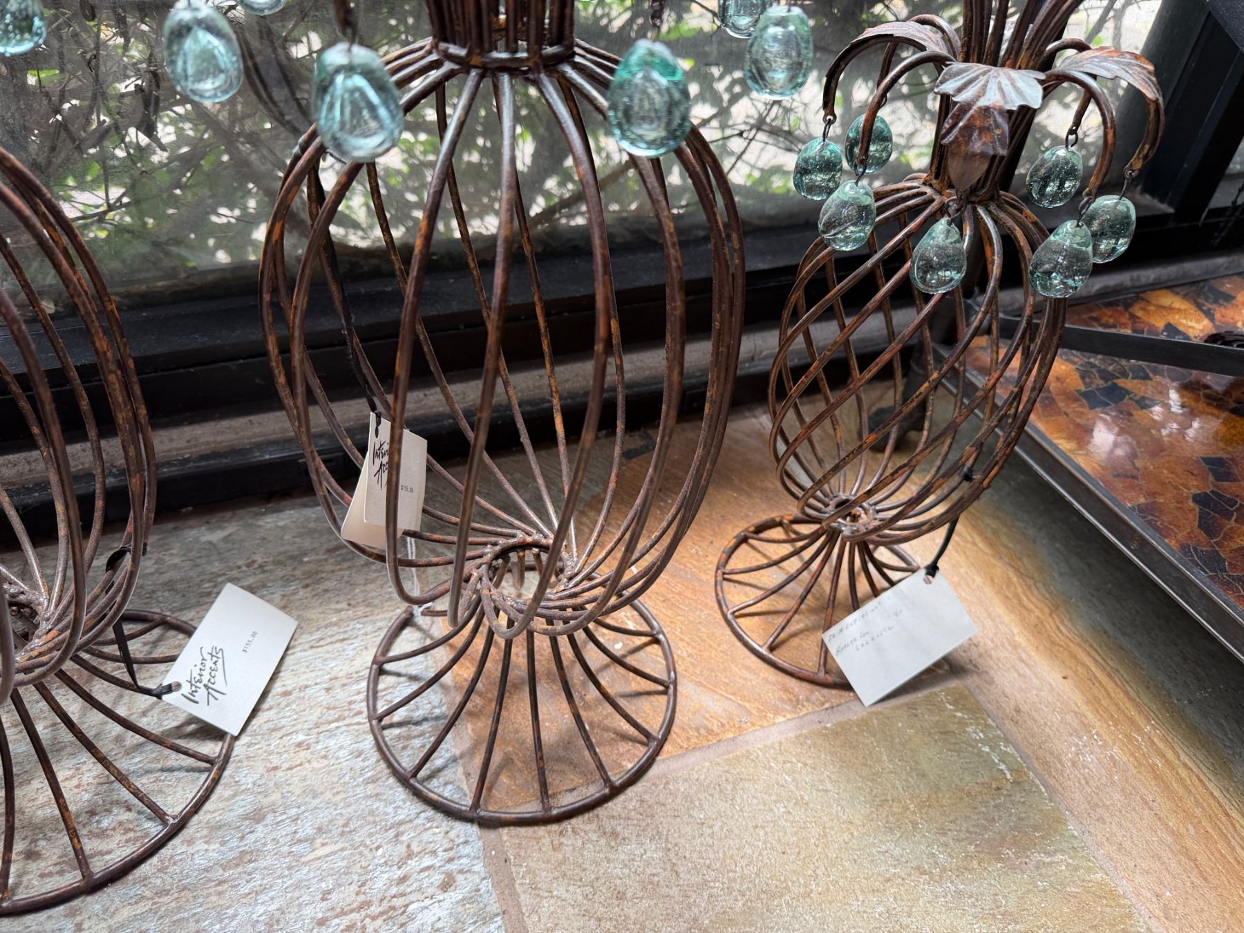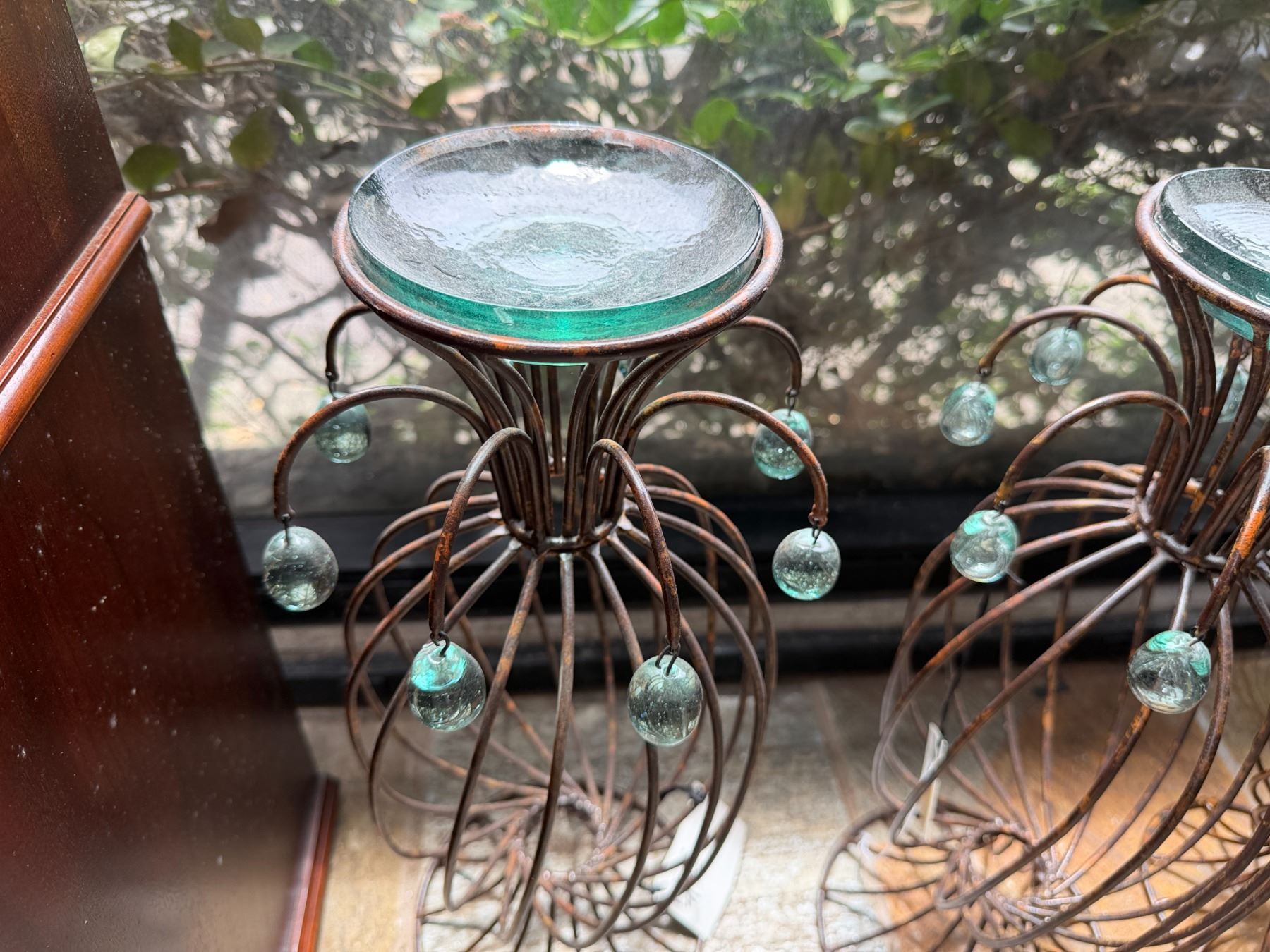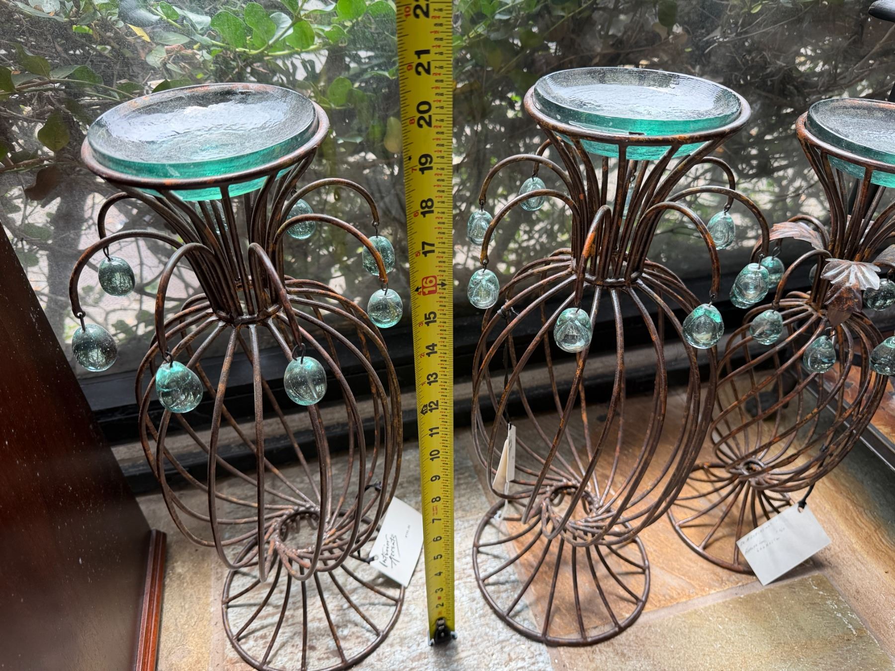 Qty 3 Metal Caged Stands w/ Glass Top & Hanging Beads Marked Rialto Lui, Misc Sizes