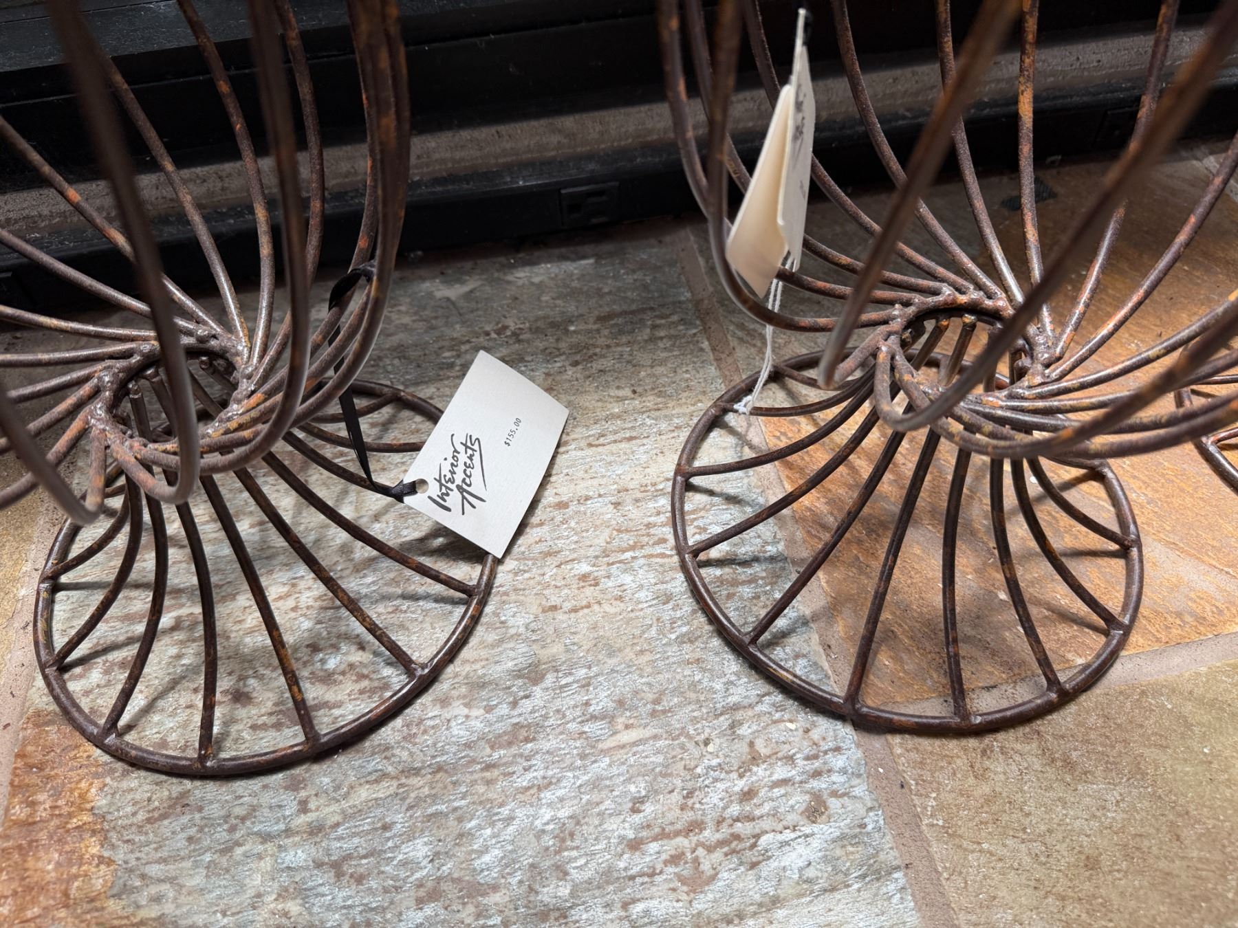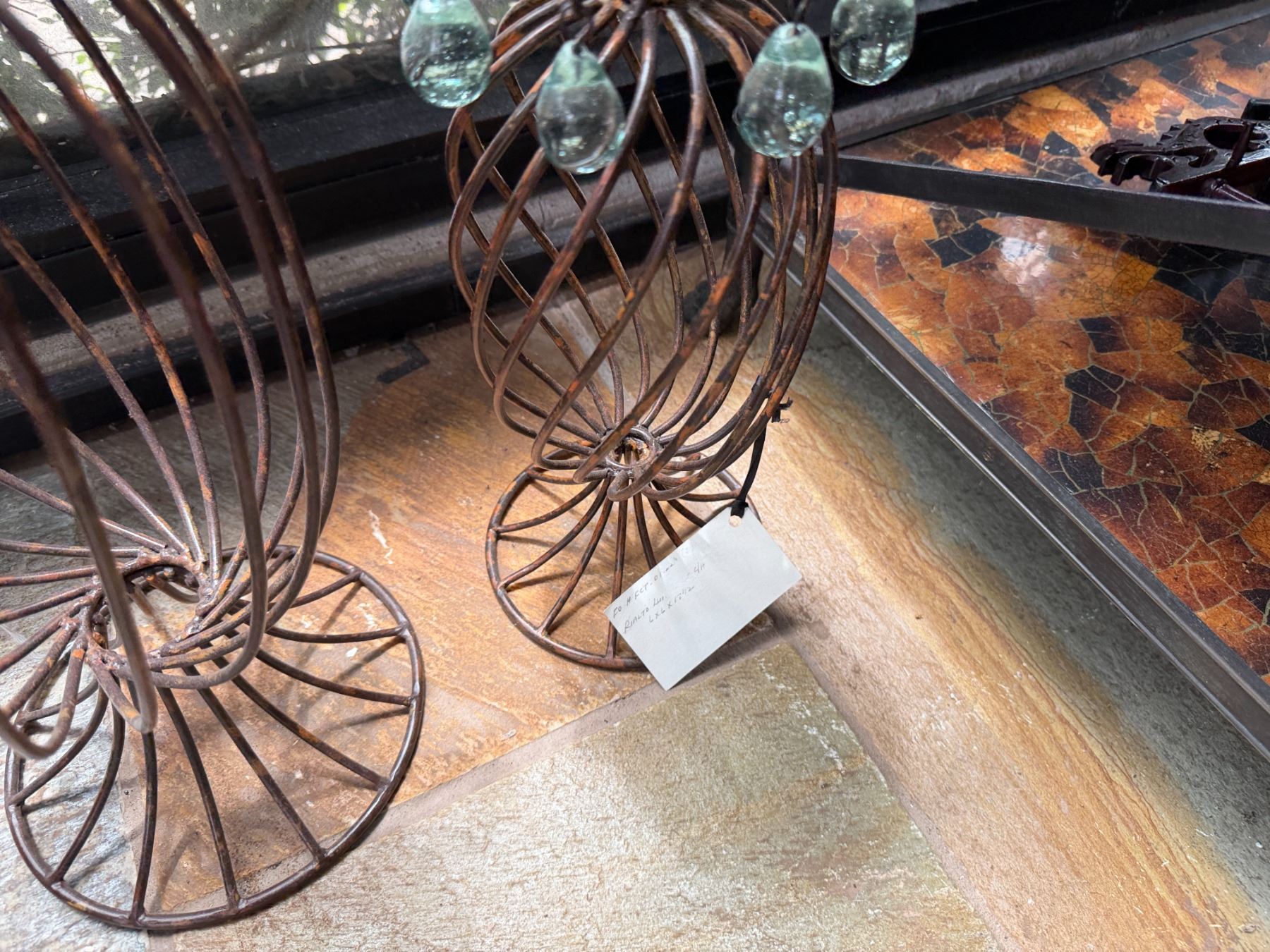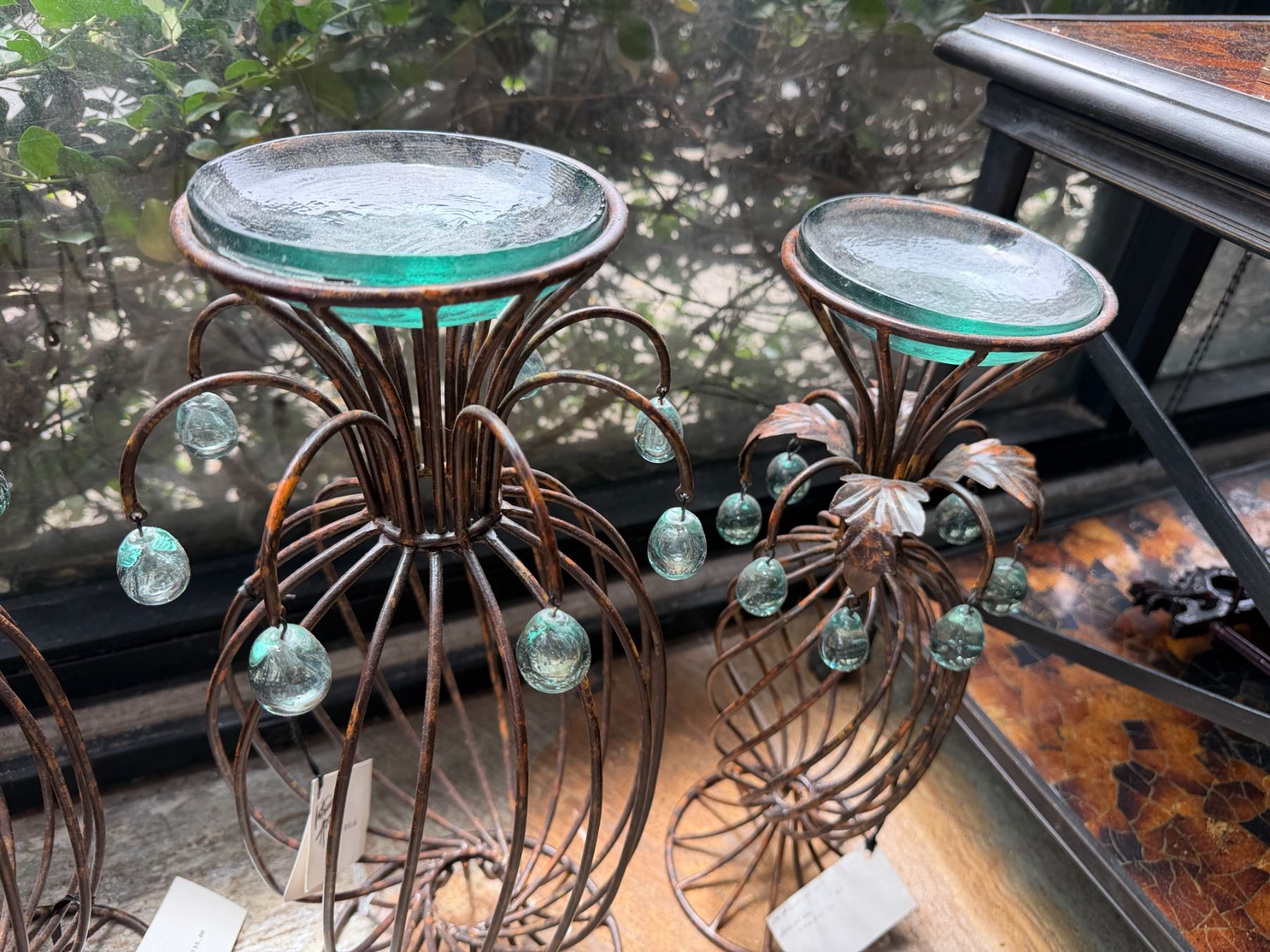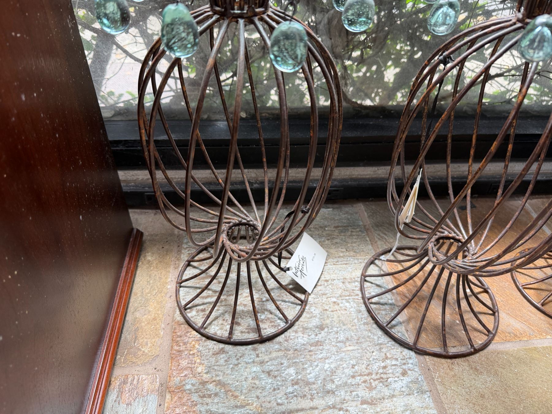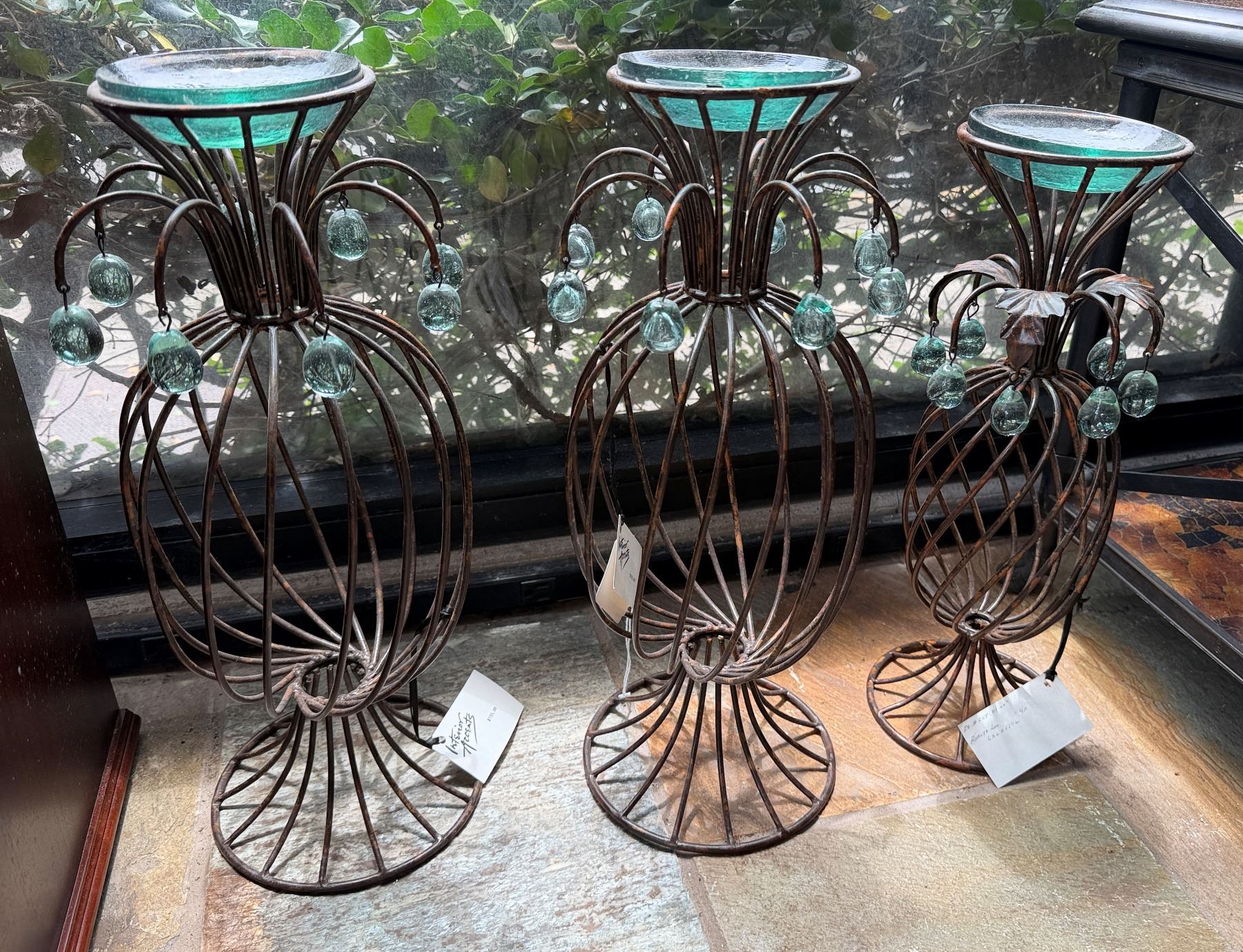 Qty 3 Metal Caged Stands w/ Glass Top & Hanging Beads Marked Rialto Lui, Misc Sizes