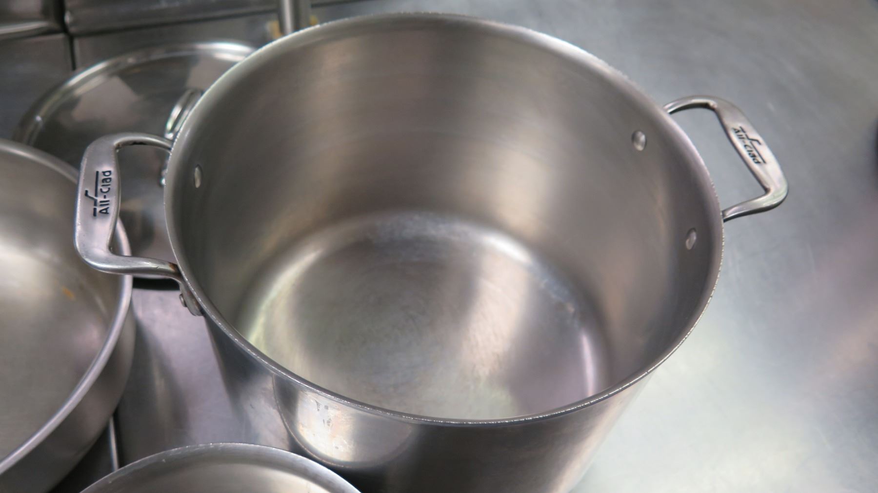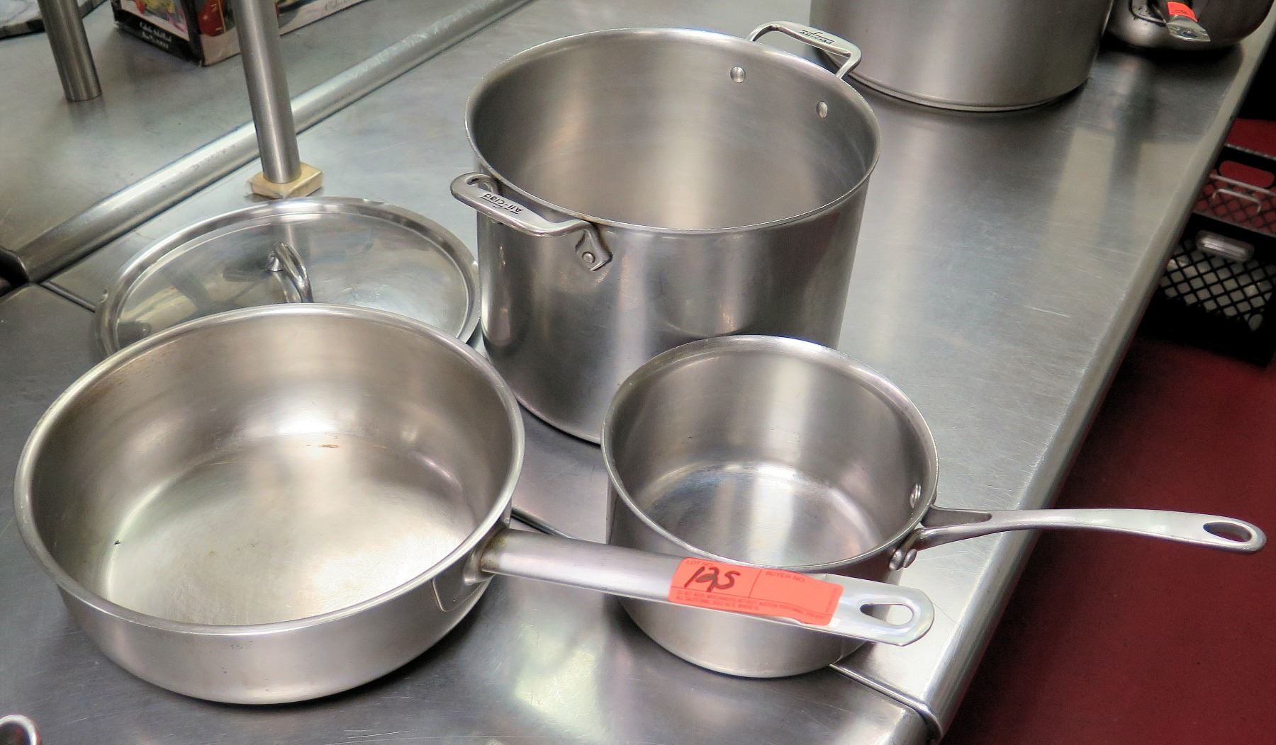 Qty 3 Misc Sizes Pots - Large All-Clad Stock Pot w/ Lid, Frying Pan & Sauce Pan