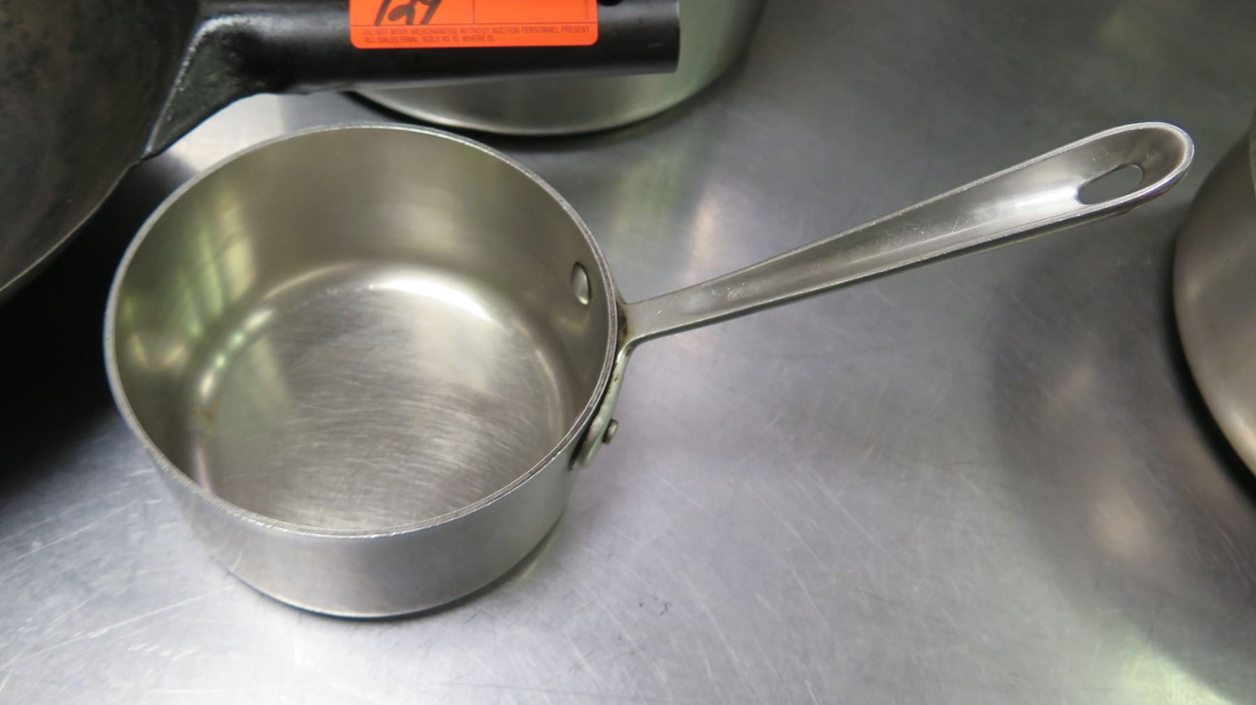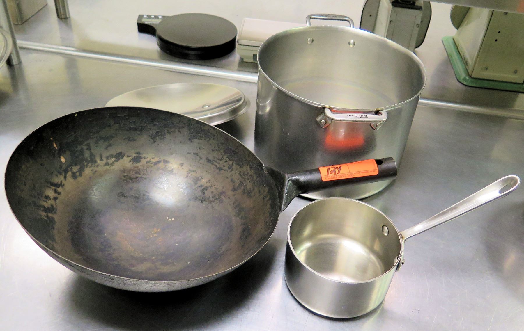 Qty 3 Misc Sizes Pots - Large All-Clad Stock Pot w/ Lid, Wok & Sauce Pan