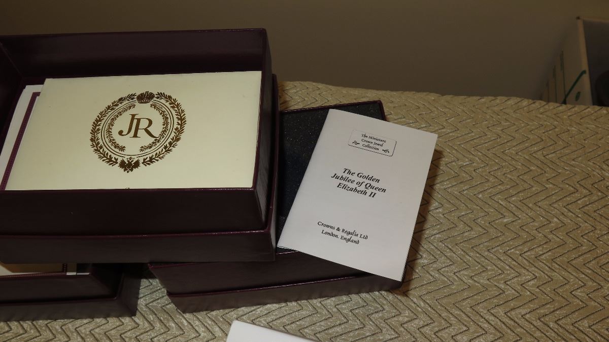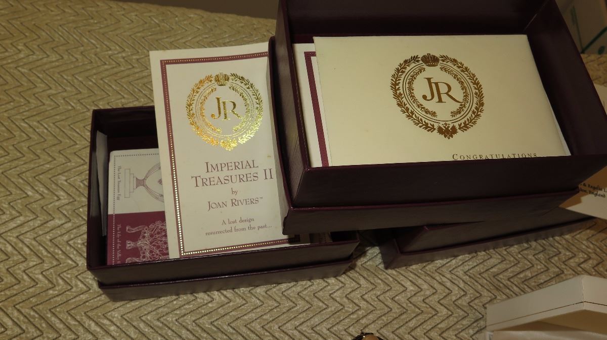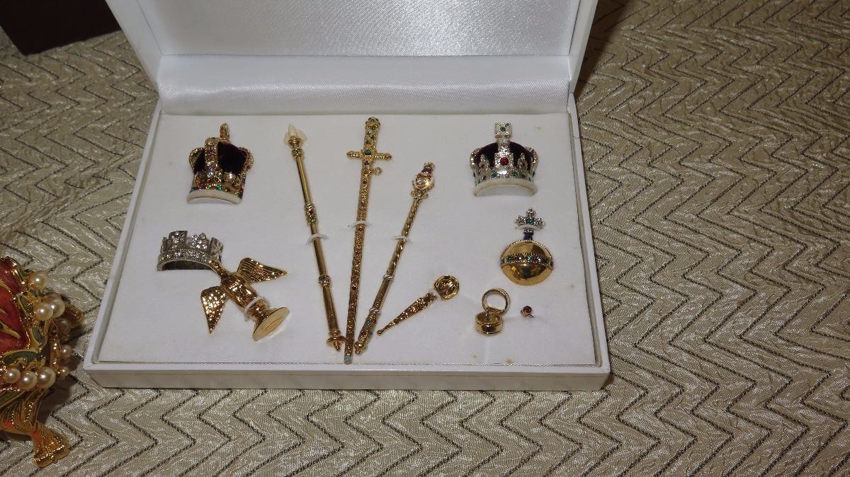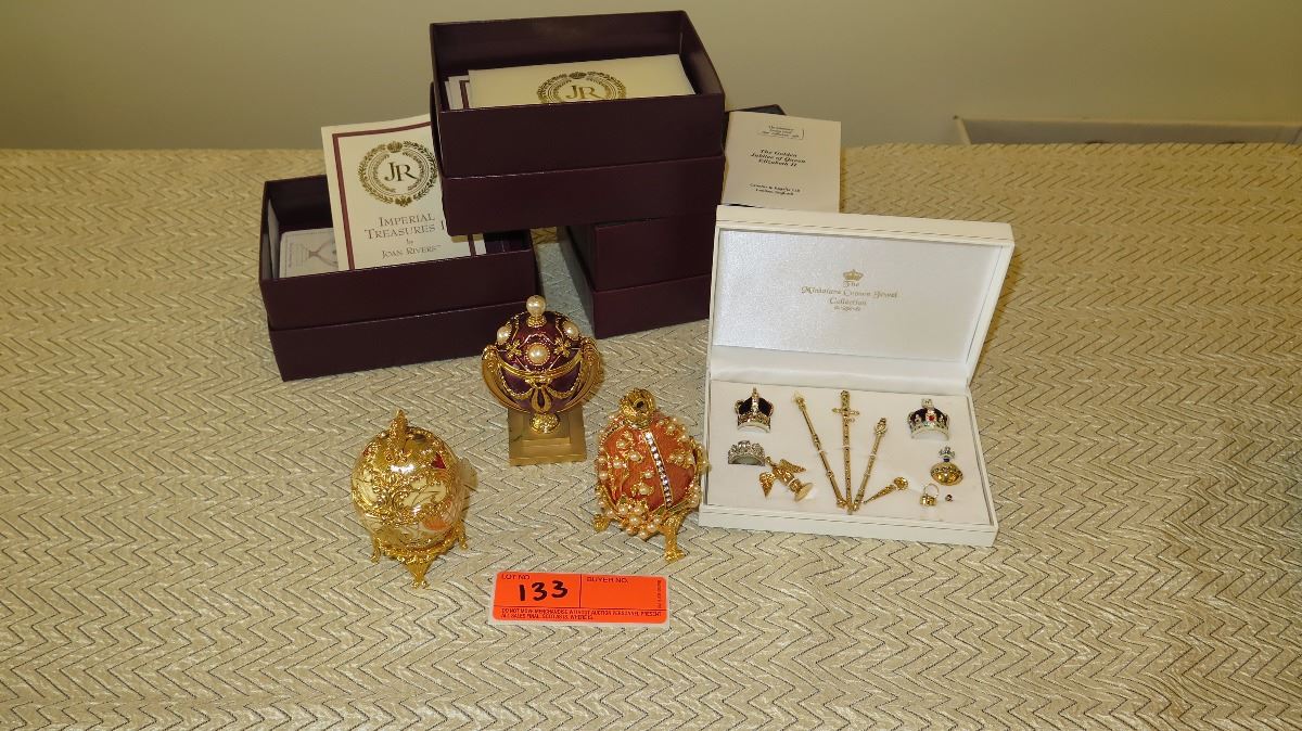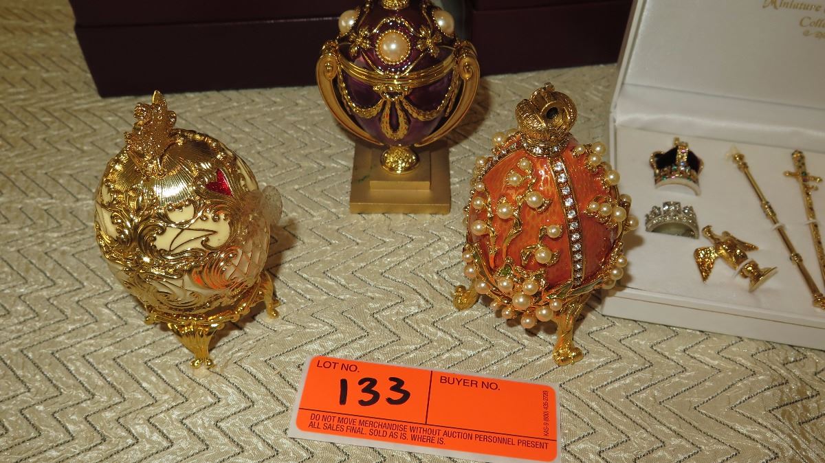 Qty 3 New Collectible Faberge Style Enameled, Jeweled Eggs & Miniature Jeweled Crowns, Swords