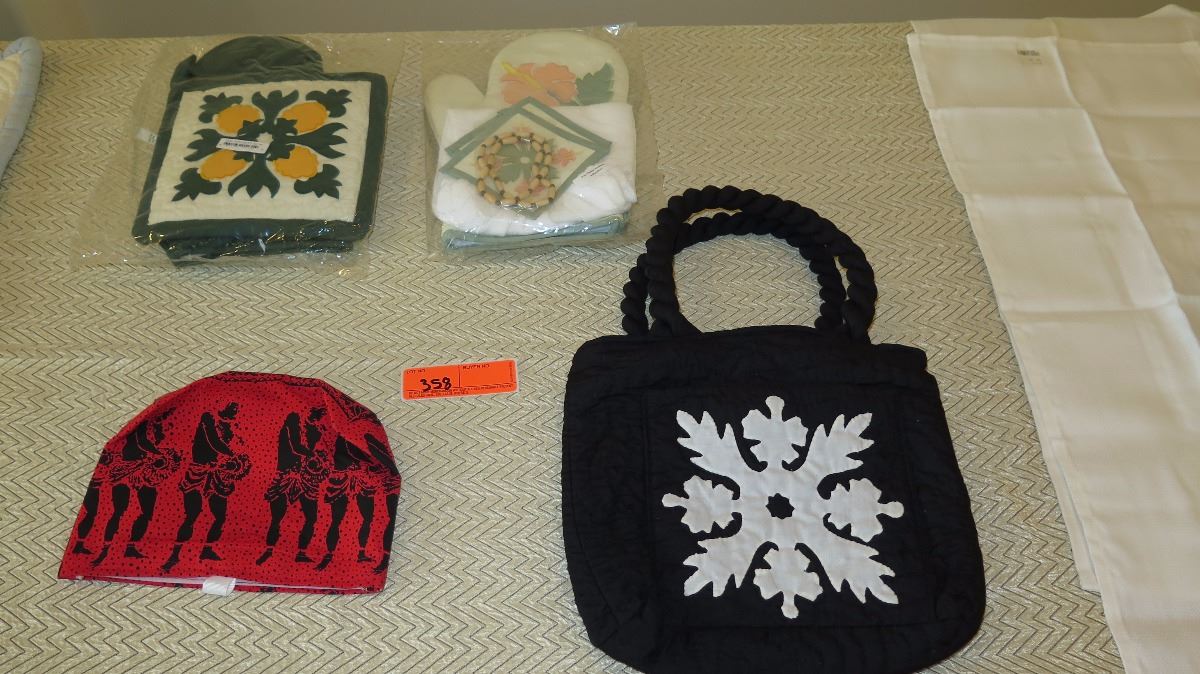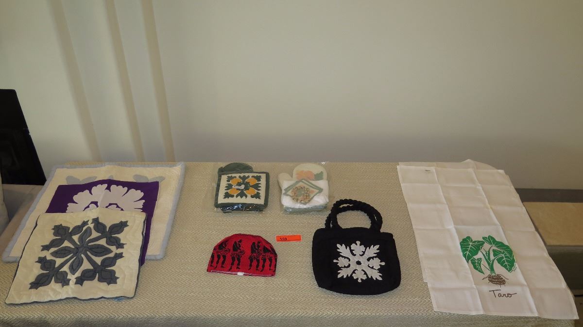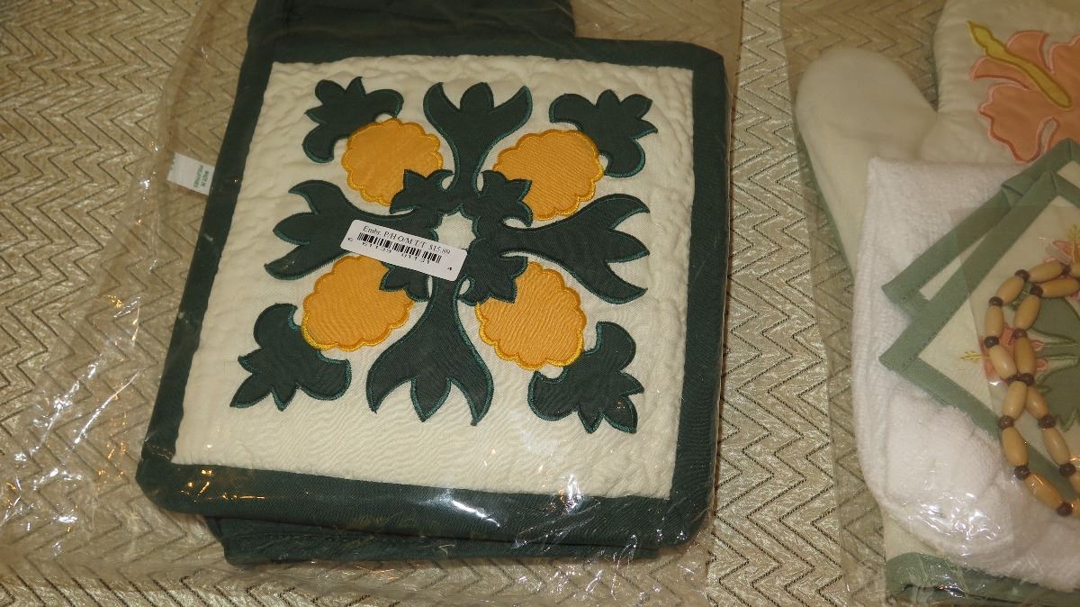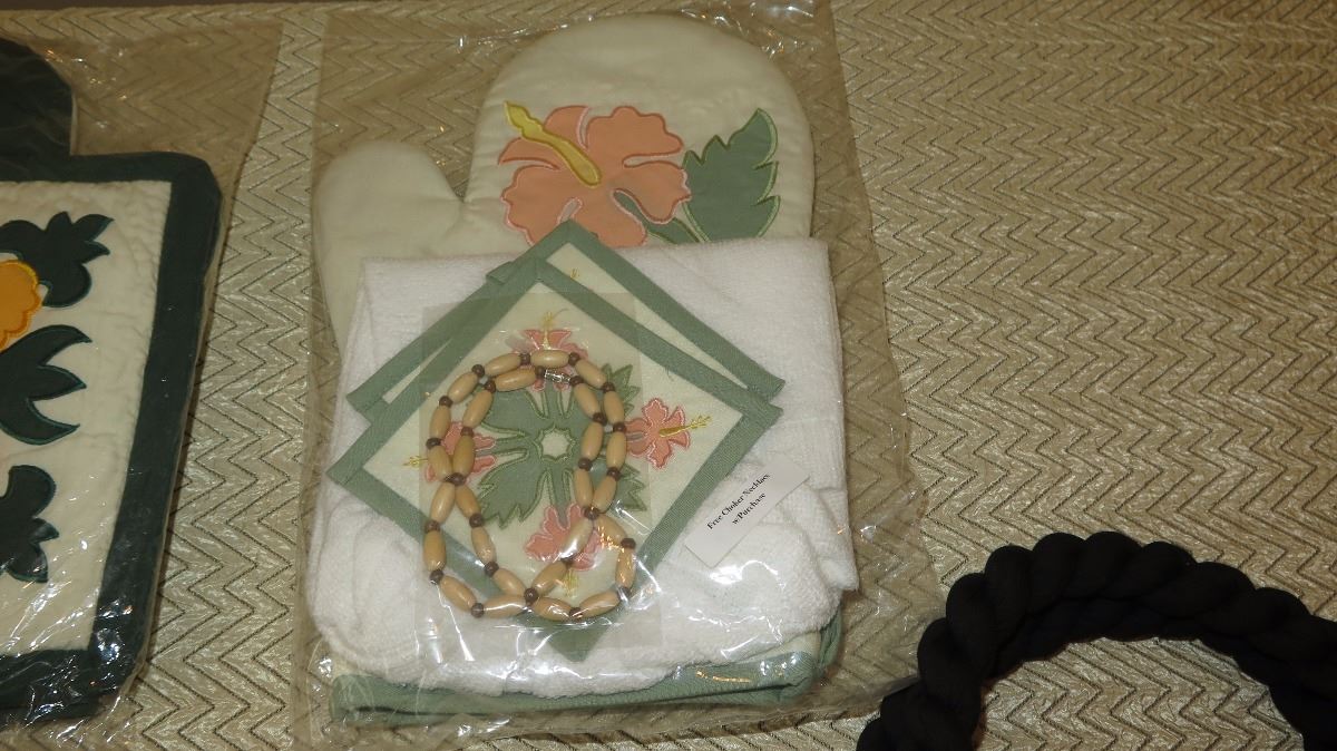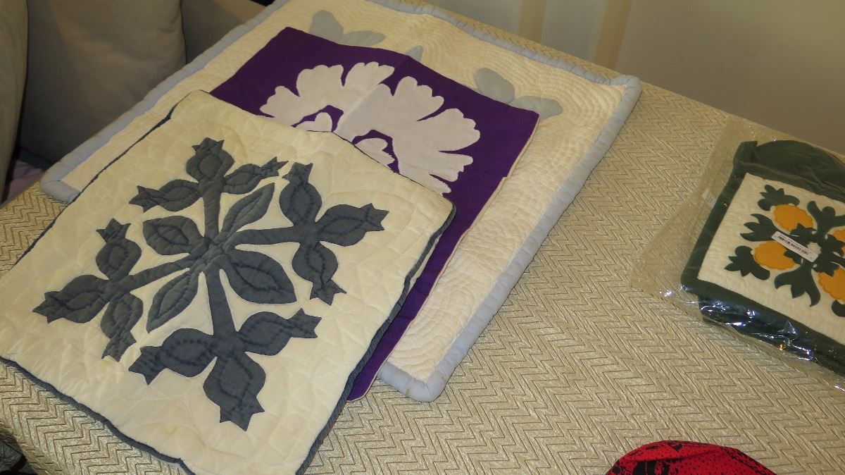 Qty 3 New Hawaiian Quilt Pillow Covers, Quilted Pot Holder/Oven Mitt Sets, Dish Towels, Quilted Bag