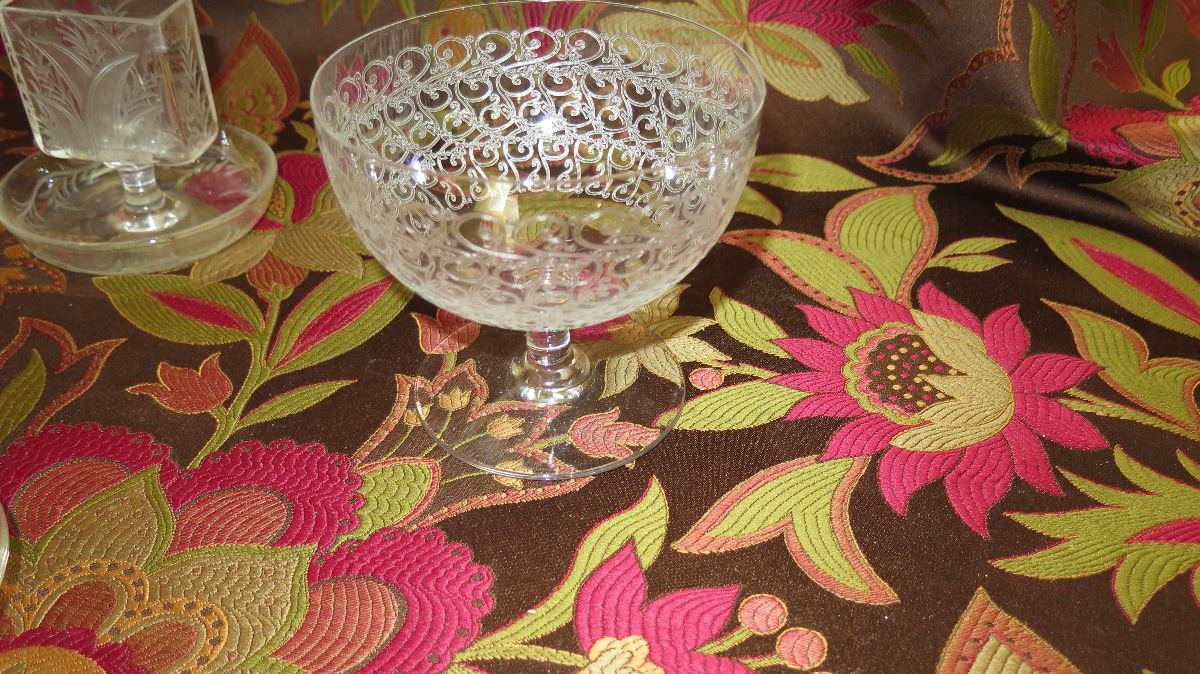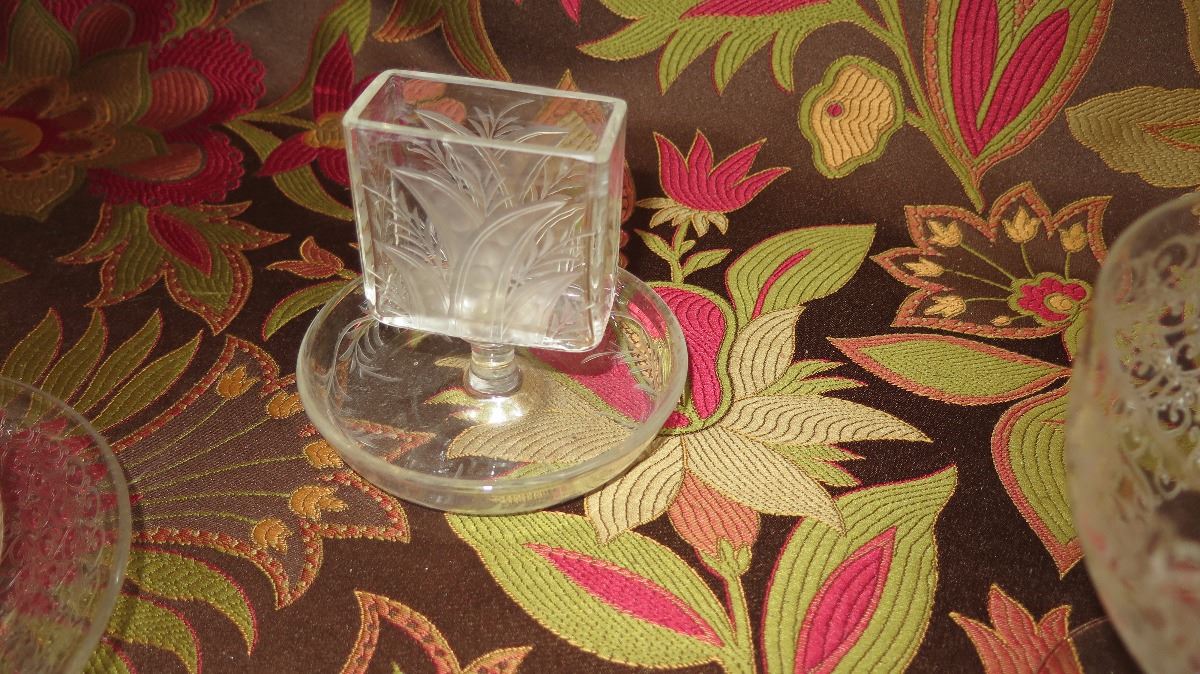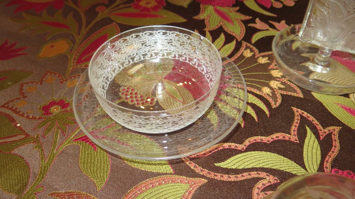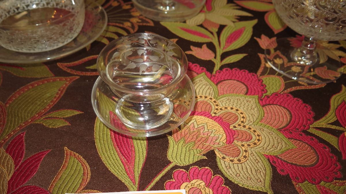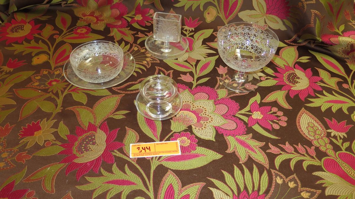 Qty 3 Ornate Raised Scrollwork Glass Bowls, Lidded Bowl & Crystal Spoon Holder