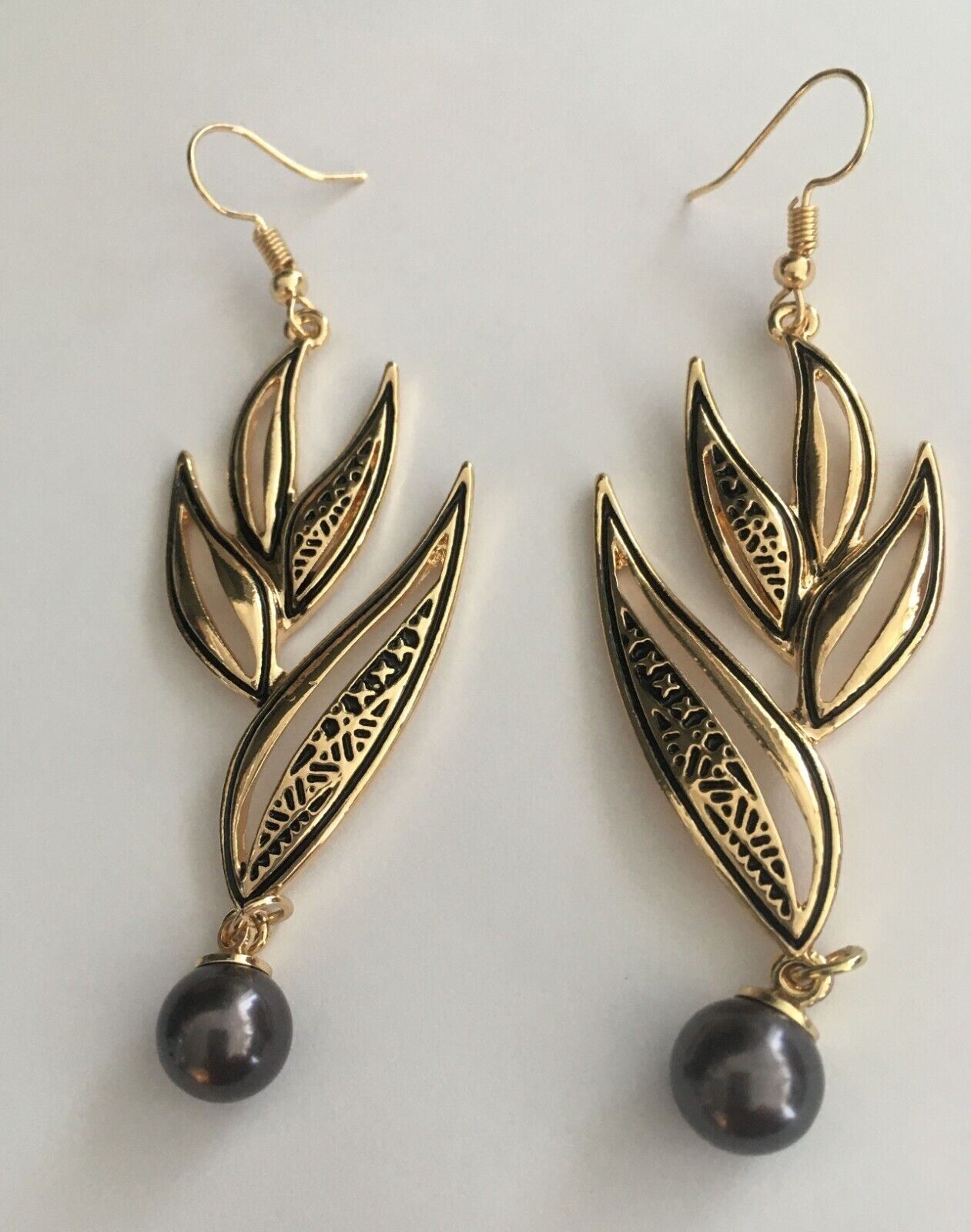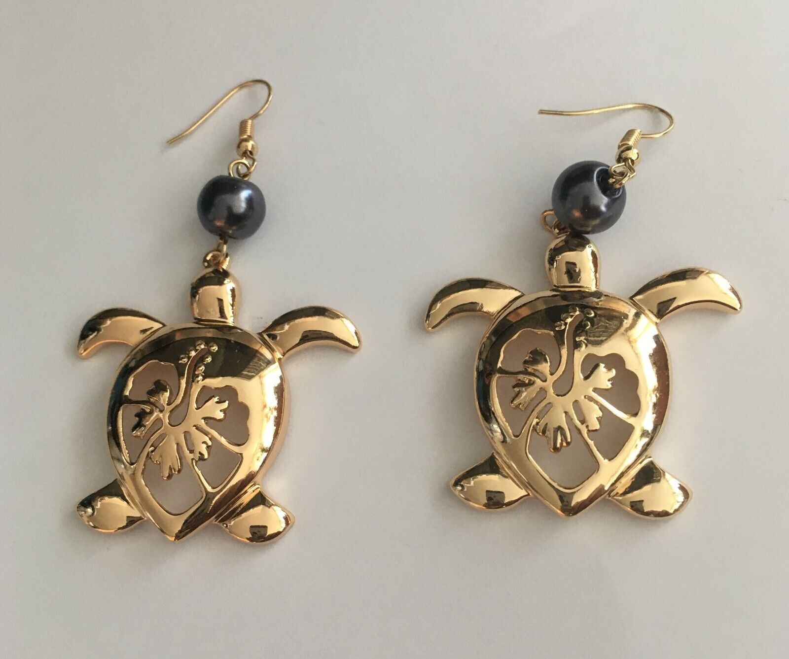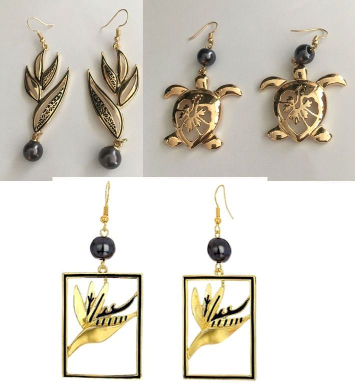 Qty 3 Pair Gold-Tone Hawaiian Earrings: Honu Turtle, Leaf & Bird of Paradise (approx. 3"L)