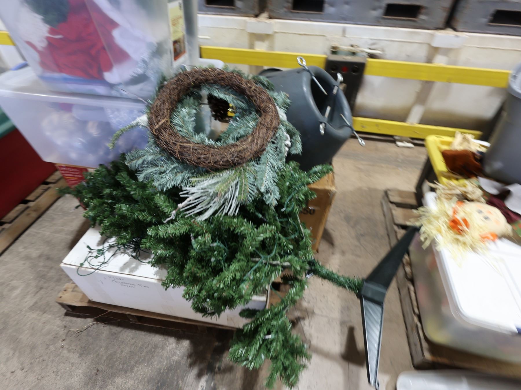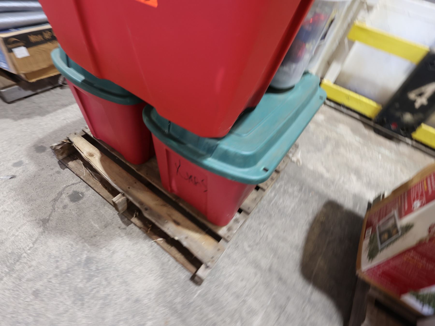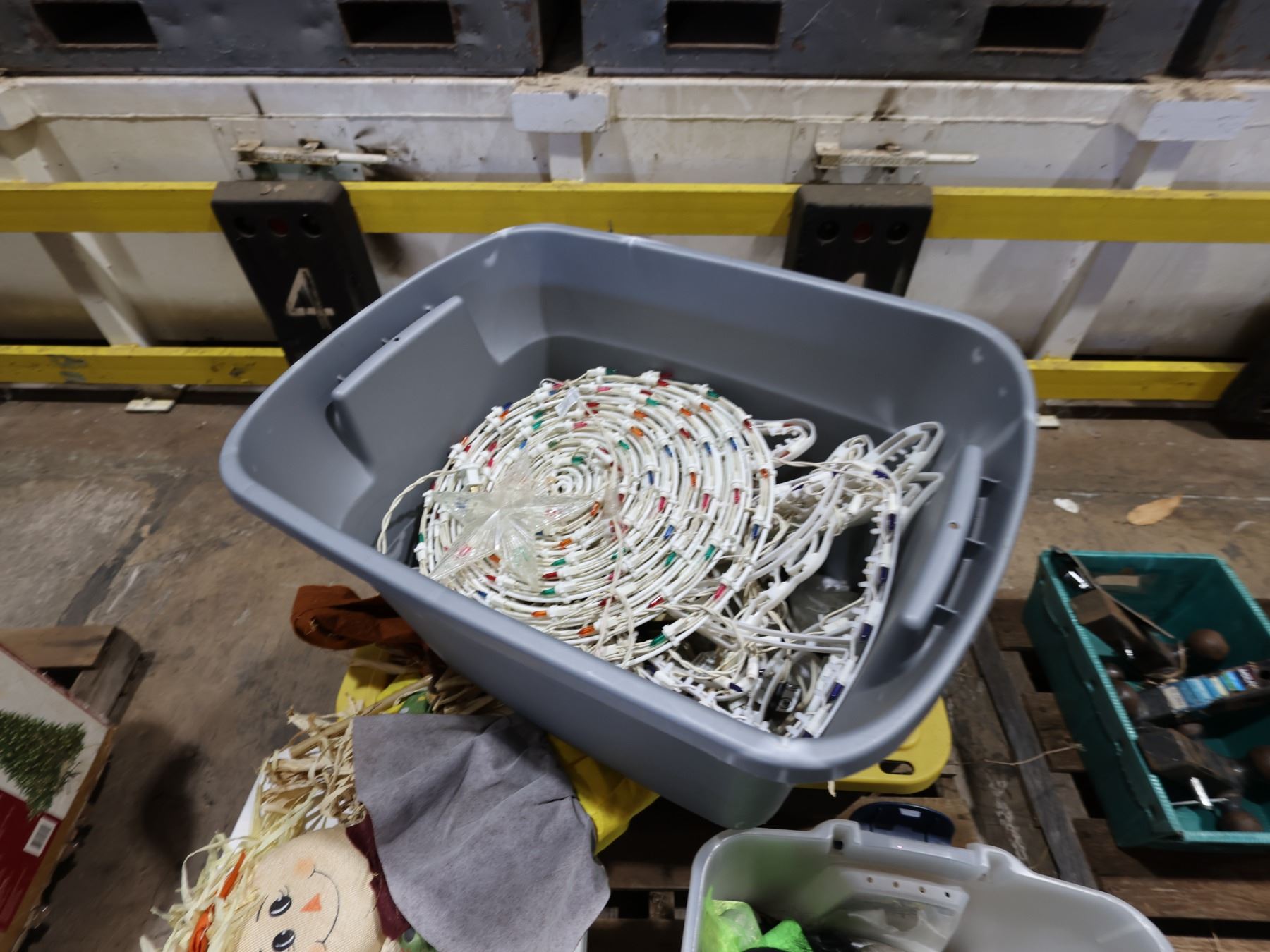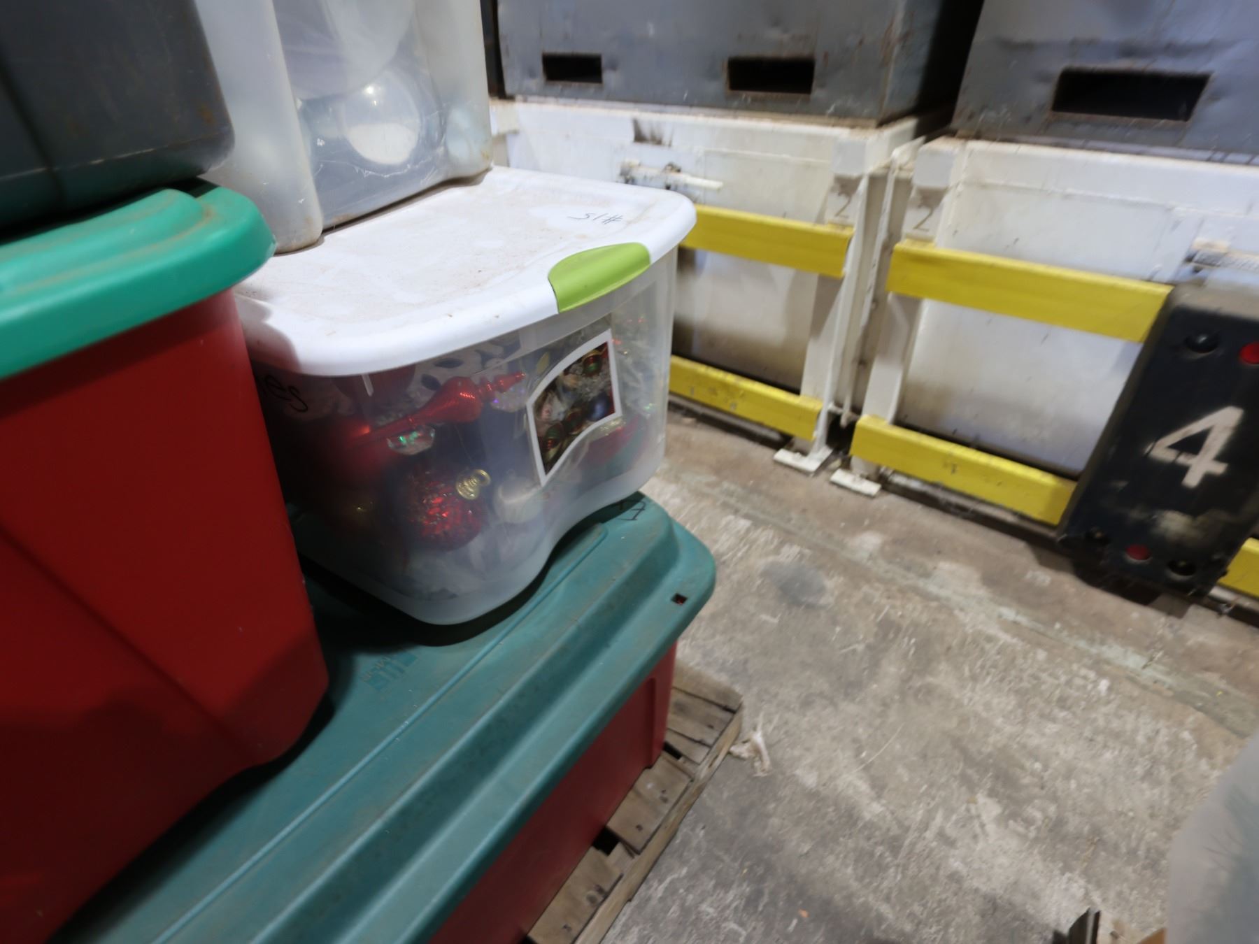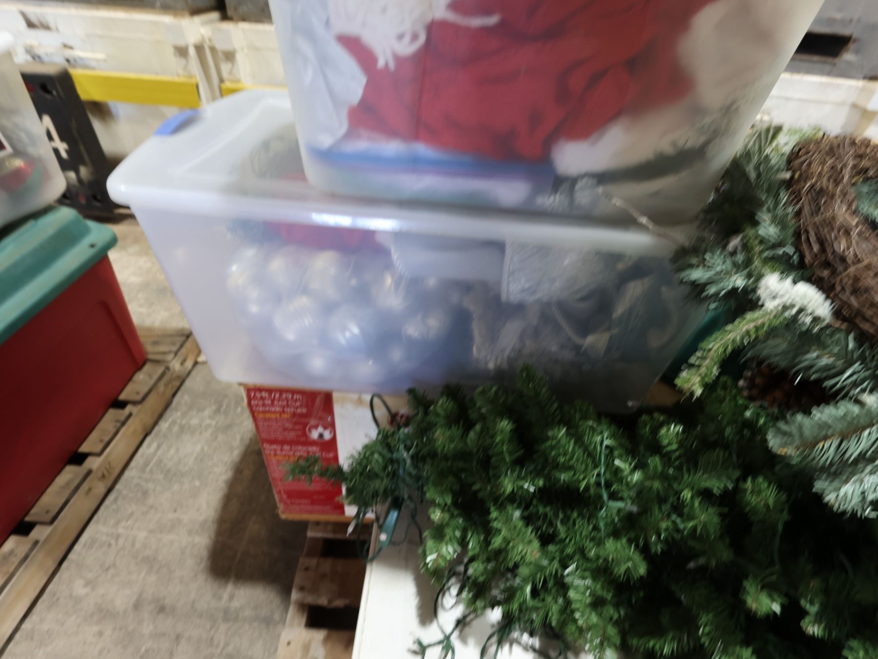 Qty 3 Pallets Multiple Bins & Contents: Holiday Decorations, Artificial Tree, Lights, Ornaments, etc