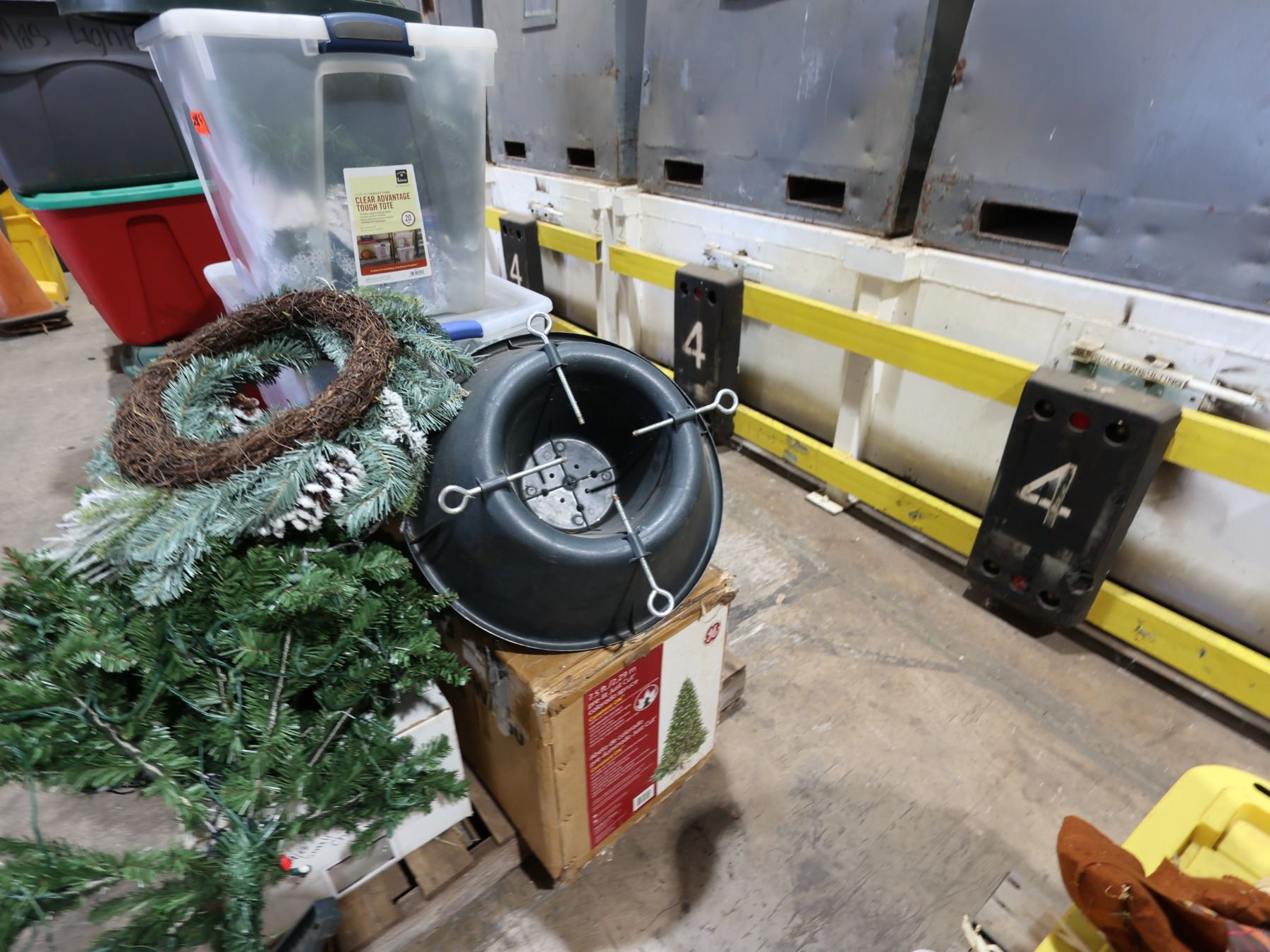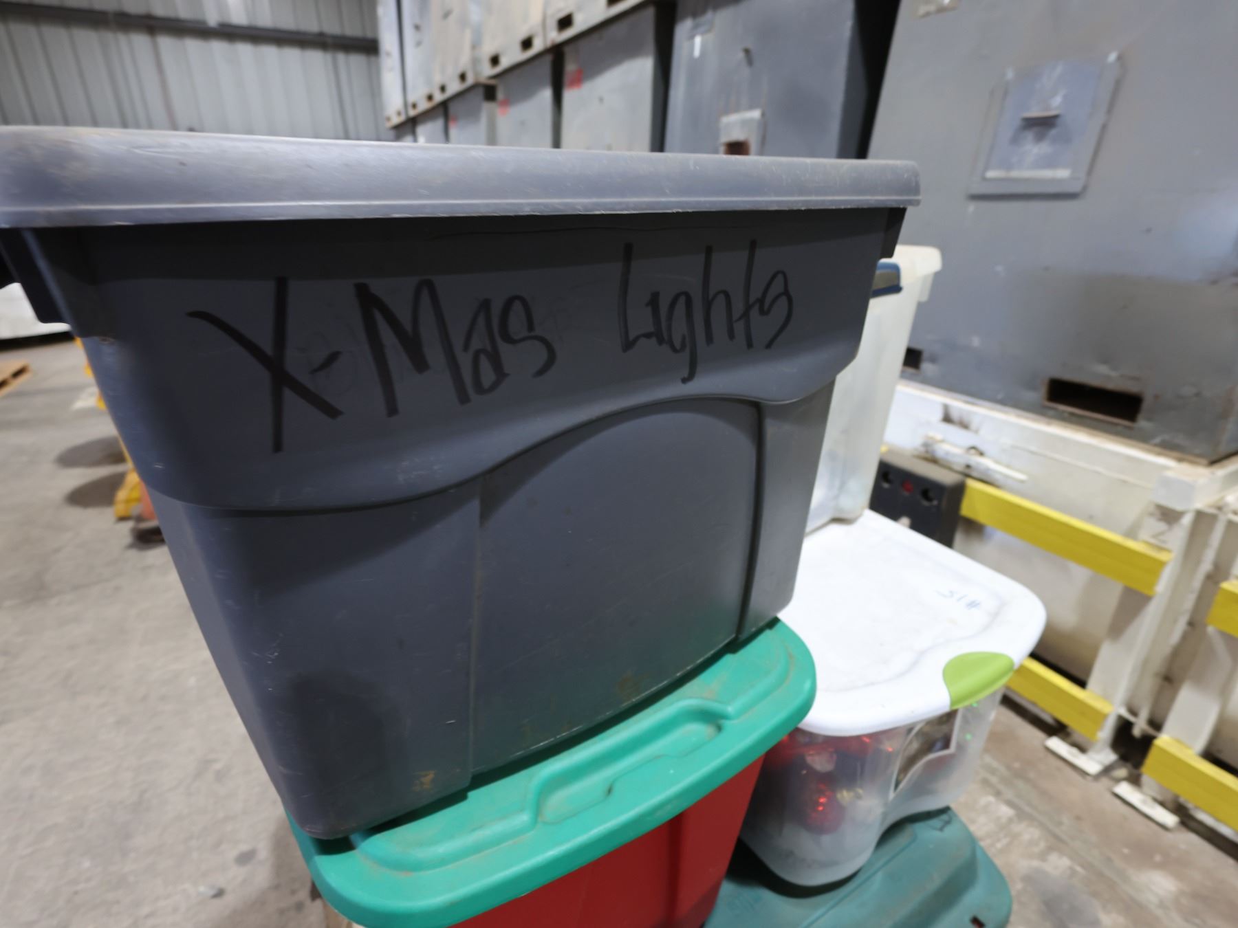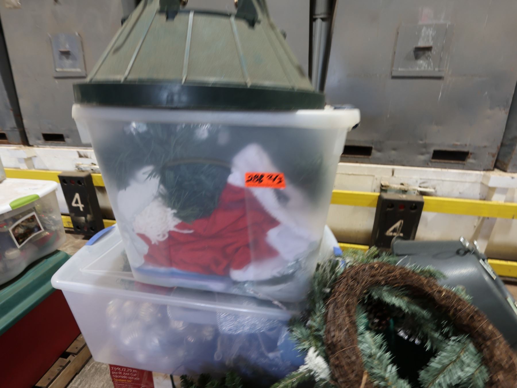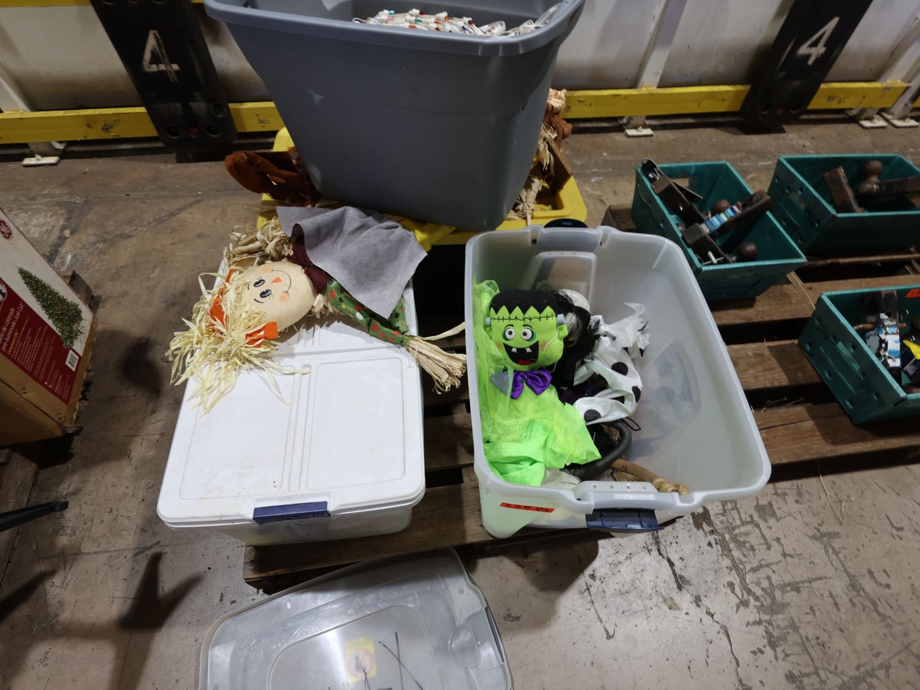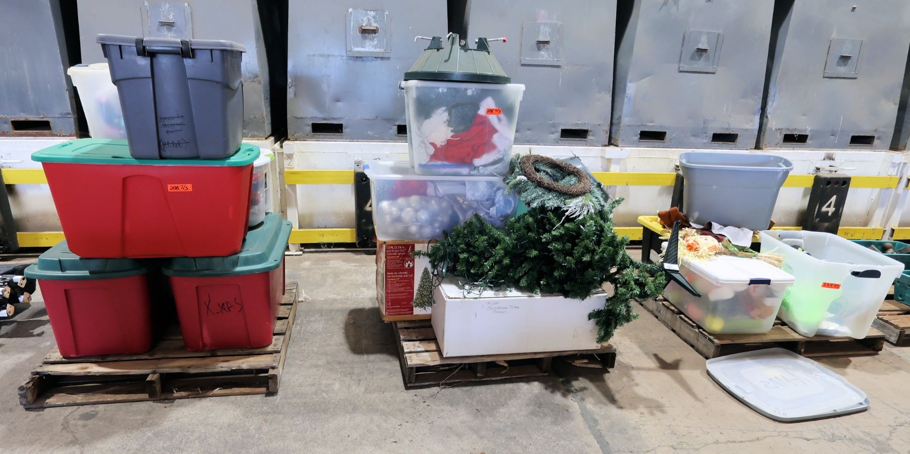 Qty 3 Pallets Multiple Bins & Contents: Holiday Decorations, Artificial Tree, Lights, Ornaments, etc