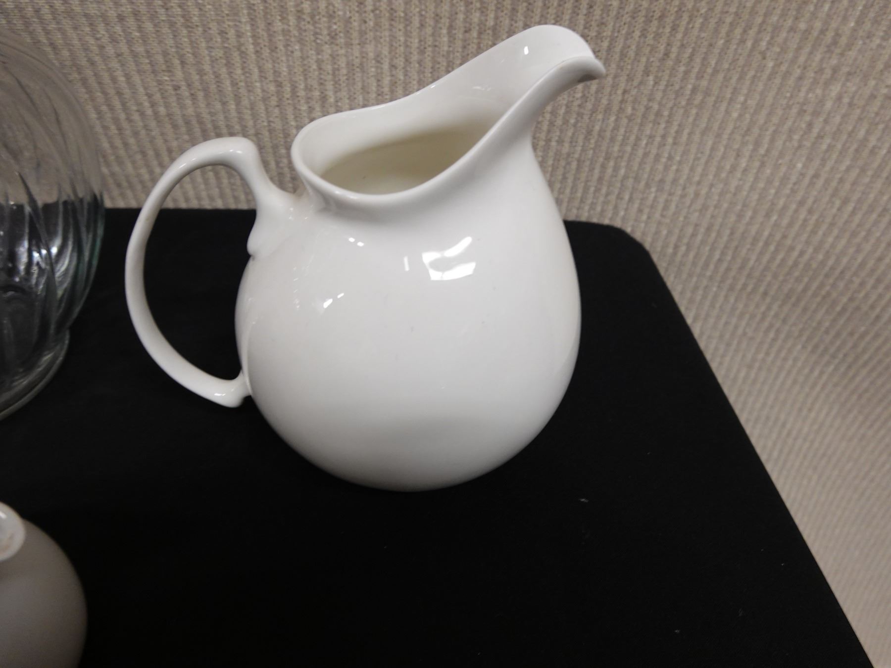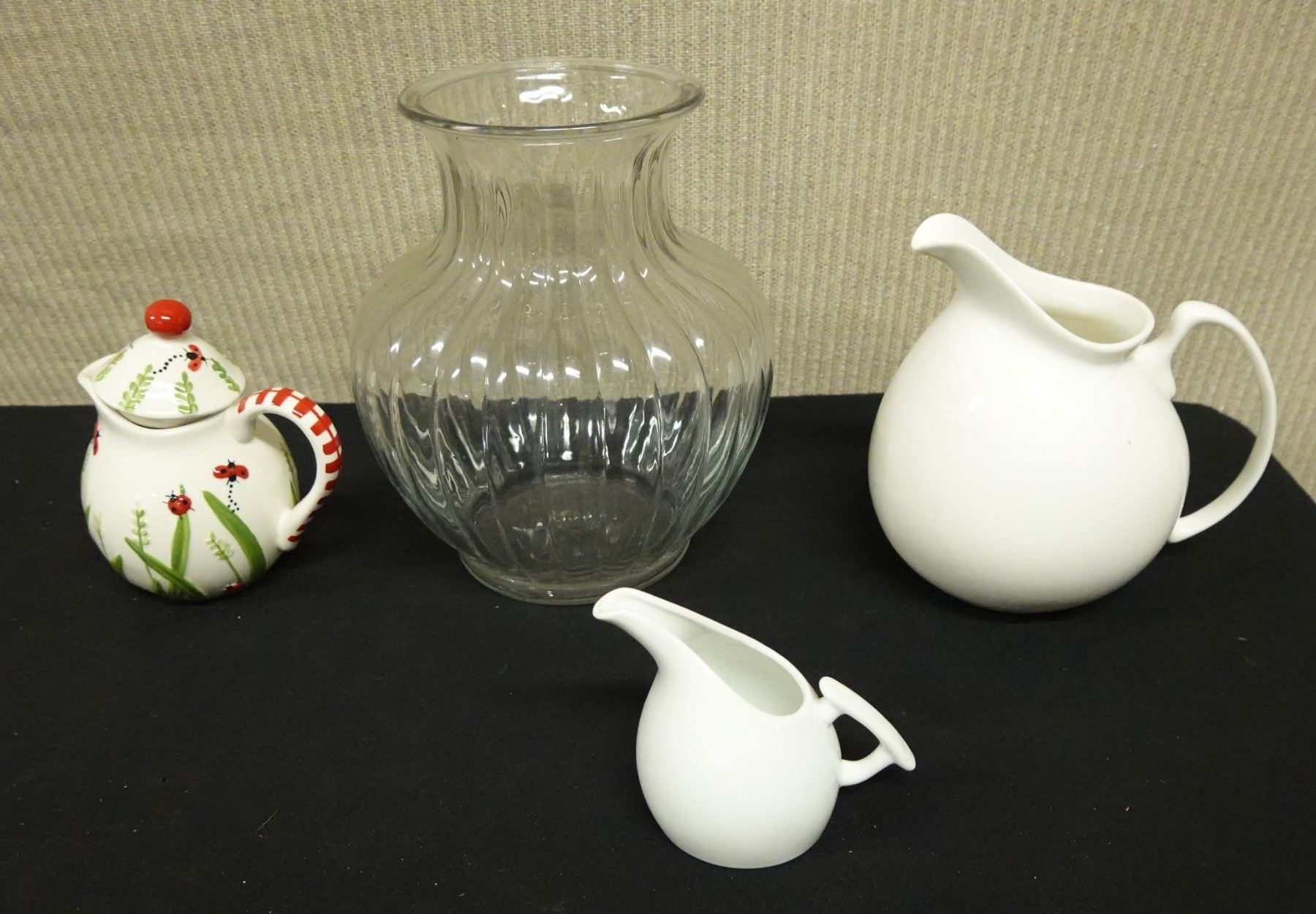Qty 3 Porcelain Creamers & Ribbed Glass Vase, Misc Sizes