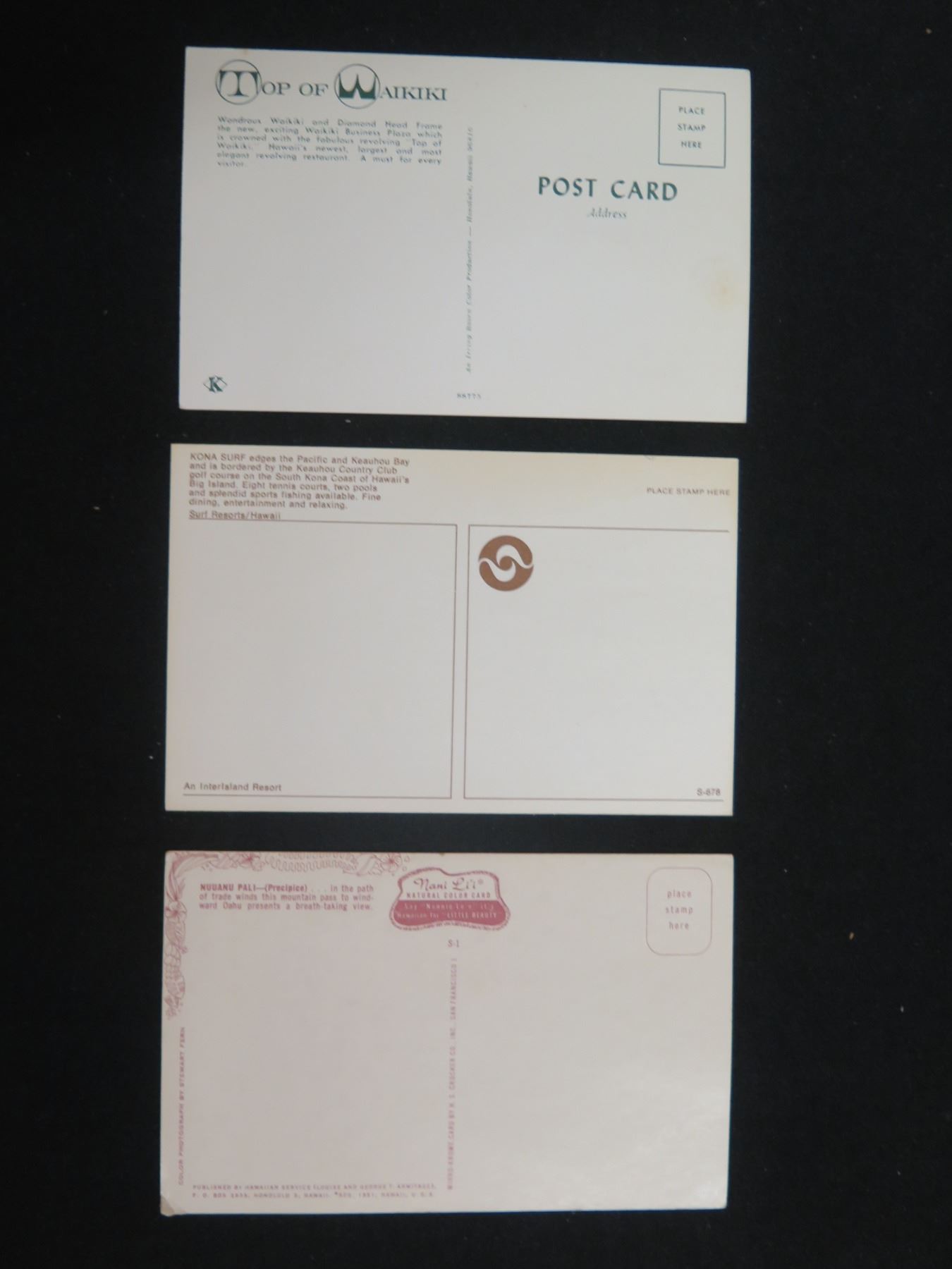 Qty 3 Postcards: Top of Waikiki, Kona Surf & Nuuanu Pali