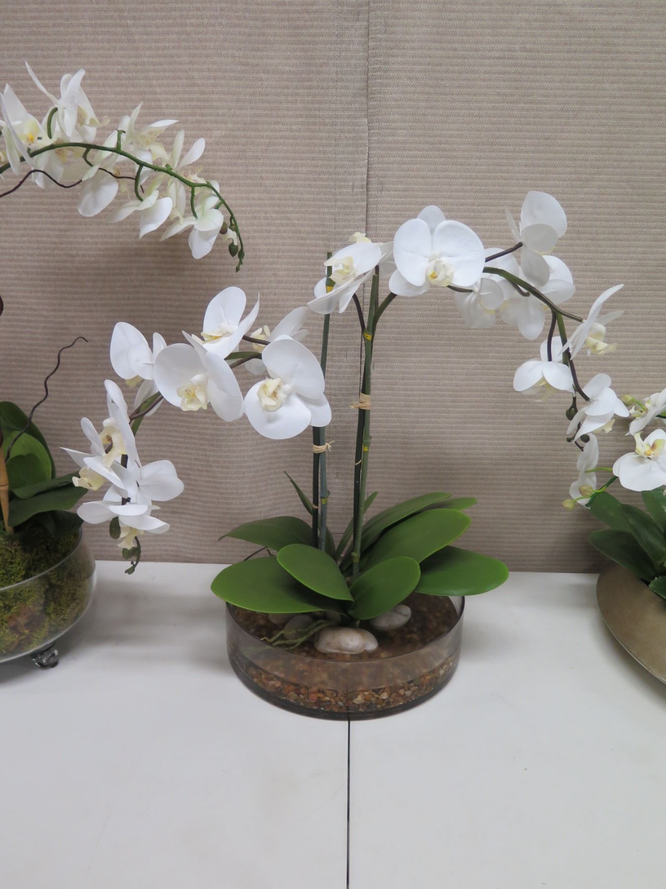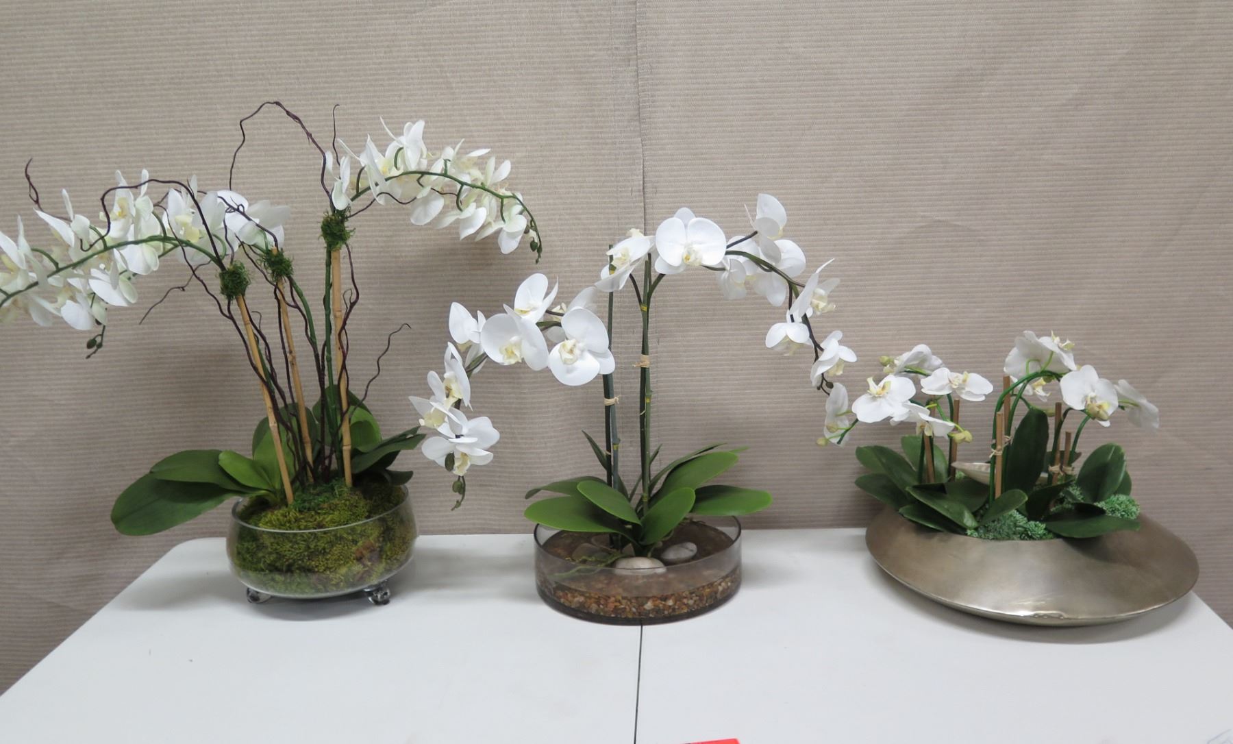 Qty 3 Potted Artificial Flower Arrangements: Orchids, Leaves, etc