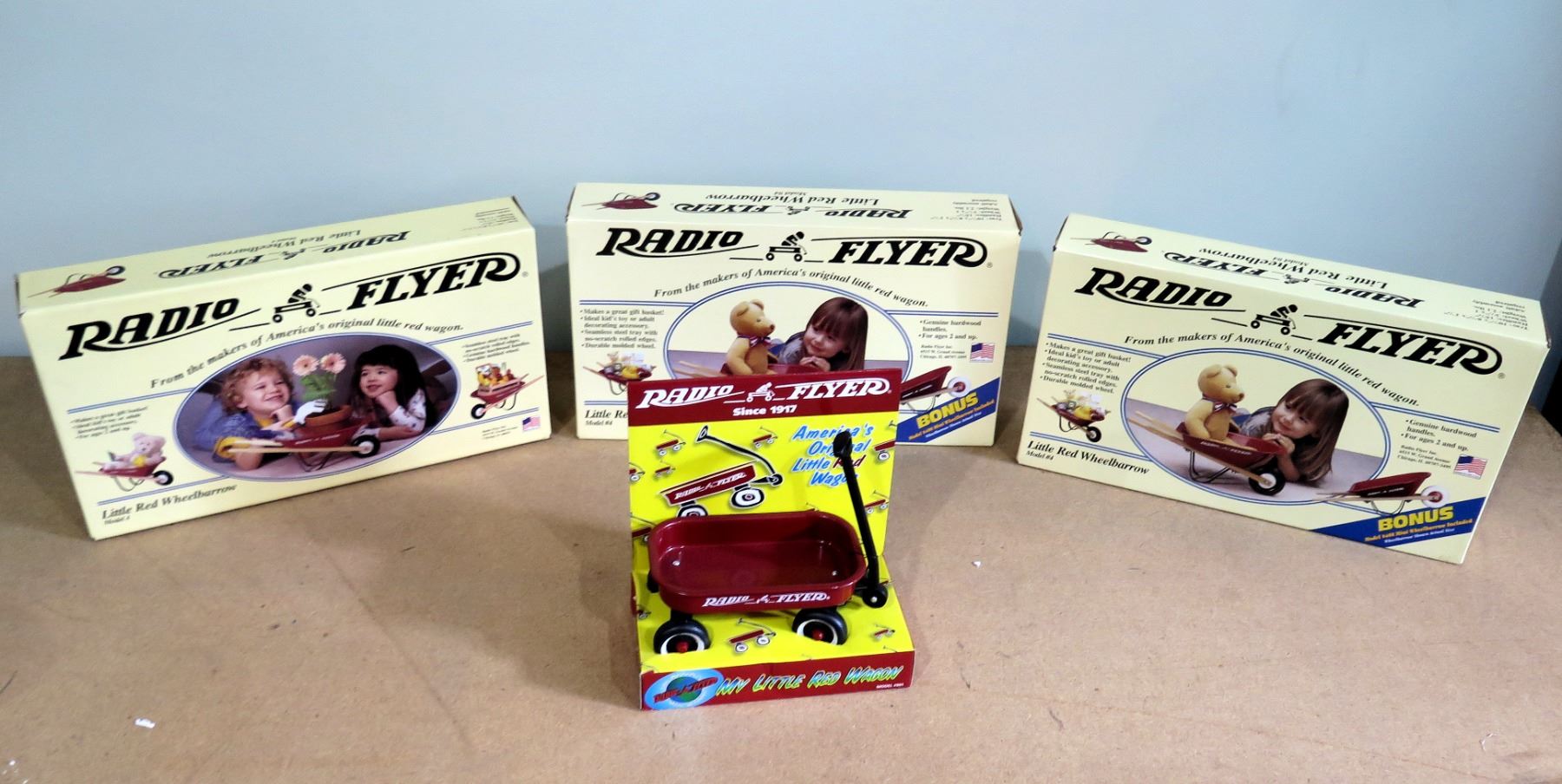 Qty 3 Radio Flyer Little Red Wheelbarrow Model 4 & Radio Flyer Model Red Wagon